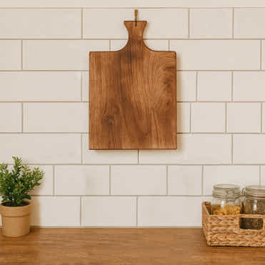 Sized at 14.5x8.75 inches, this board is perfect for small countertops, kitchen islands, or open shelves. The paddle handle with a hanging loop adds functionality and decorative flair, allowing you to hang it up as rustic wall decor when not in use.