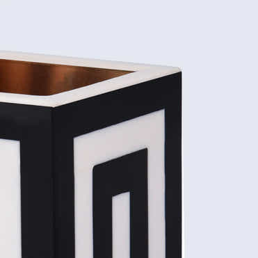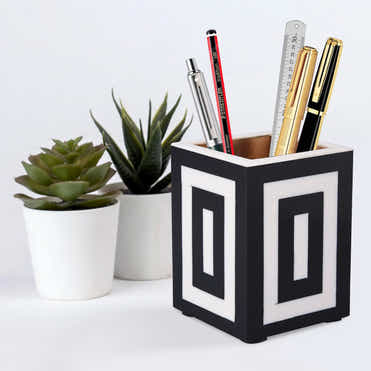 Add a touch of elegance to your desk with this handcrafted pen holder, featuring a timeless black and white Concentric pattern.