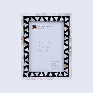 Elevate your home aesthetic with the Handicrafts Home 4x6 Picture Frame, meticulously handcrafted with Mother of Pearl and resin inlay in a striking black and white triangle mosaic pattern. This elegant frame brings together timeless design, ethical craftsmanship, and bold geometry, offering a sophisticated accent for any space. Each piece reflects careful artisan detailing, blending natural textures with a chic, vintage-inspired look.