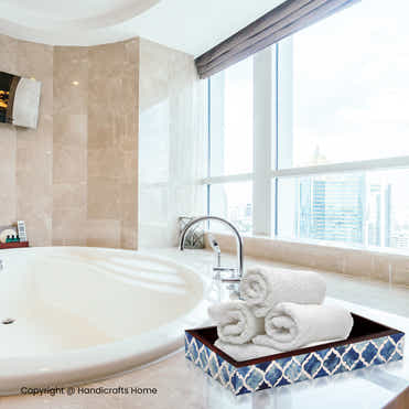 Introducing Handicrafts Home Handmade Moroccan Pattern Towel Trays, the luxurious and functional countertop storage solution. Designed with an exquisite resin inlay on durable pine MDF, this bathroom countertop organizer blends elegance with practicality, making it an ideal vanity organizer, jewelry tray, or perfume organizer.