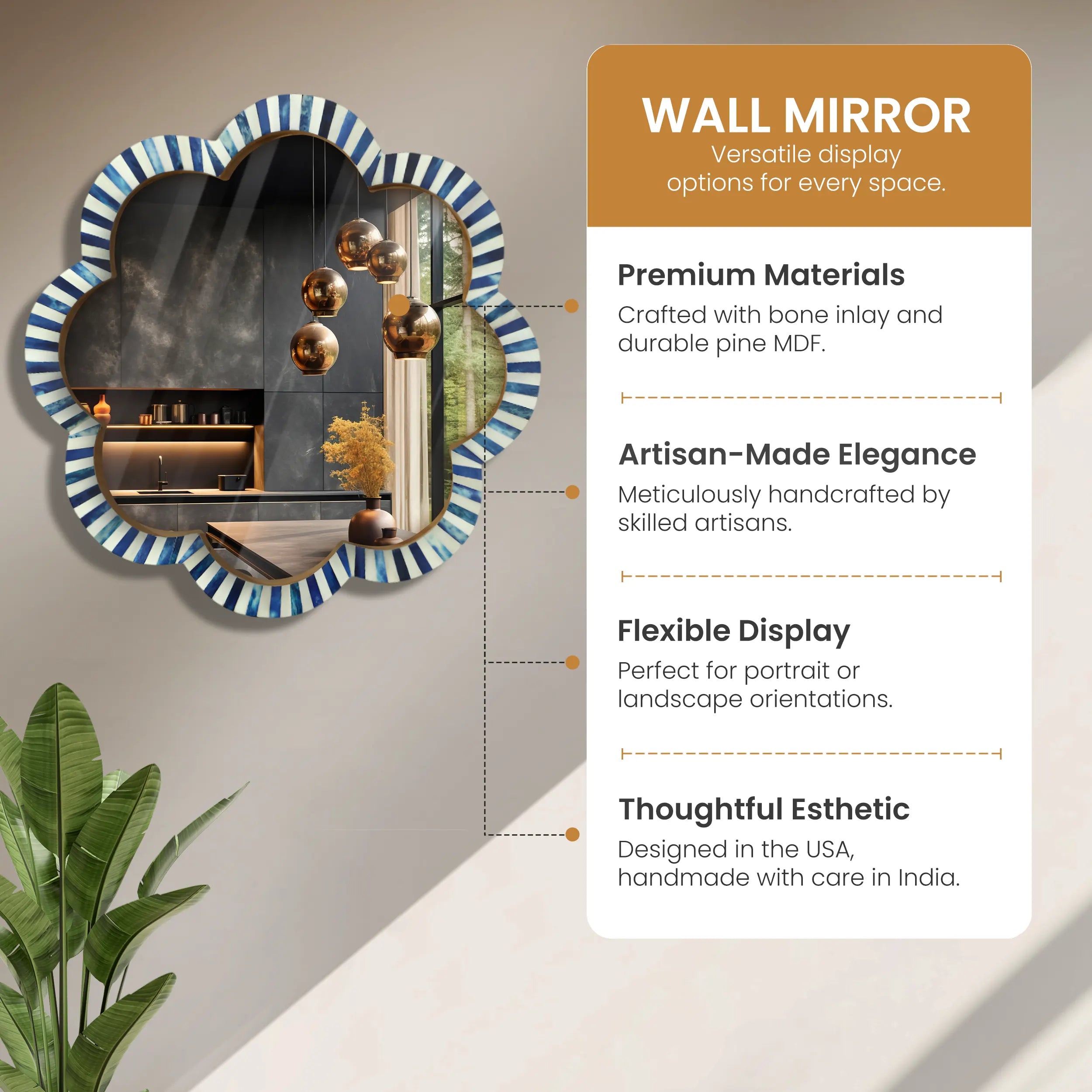 Handmade Blue & White Bone Inlay Scalloped Wall Mirror – 18"