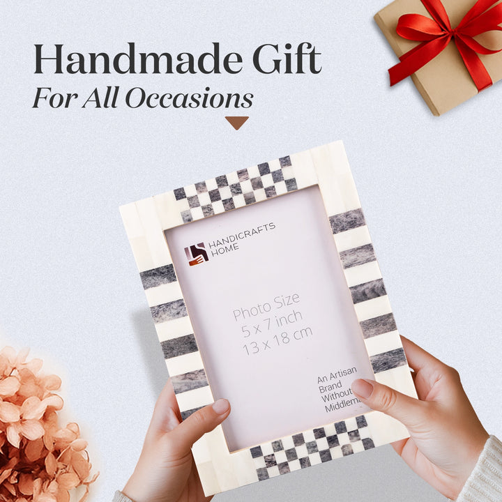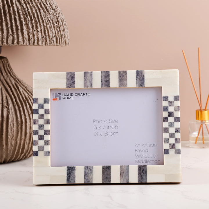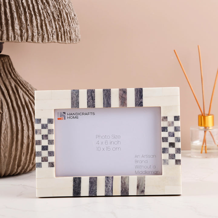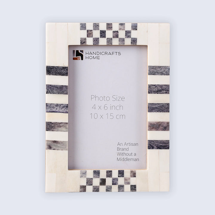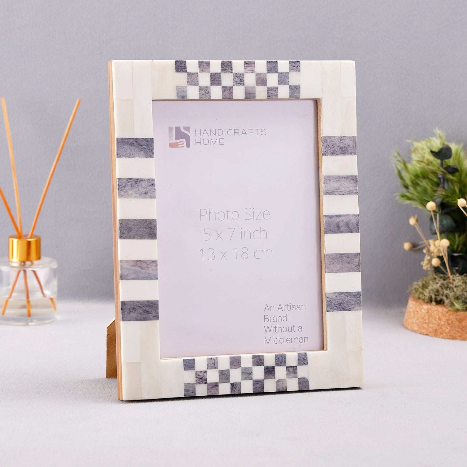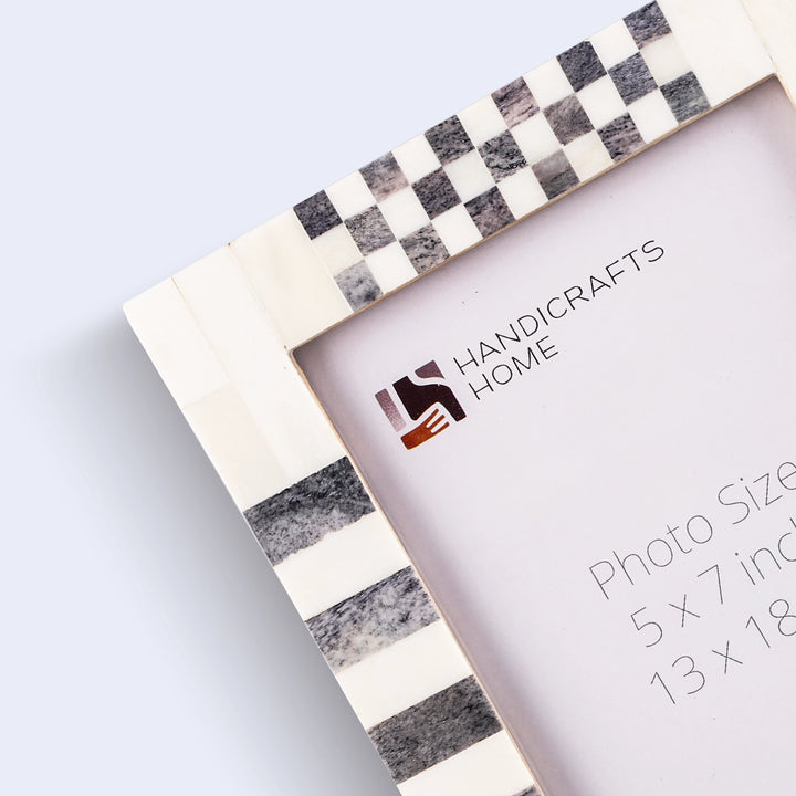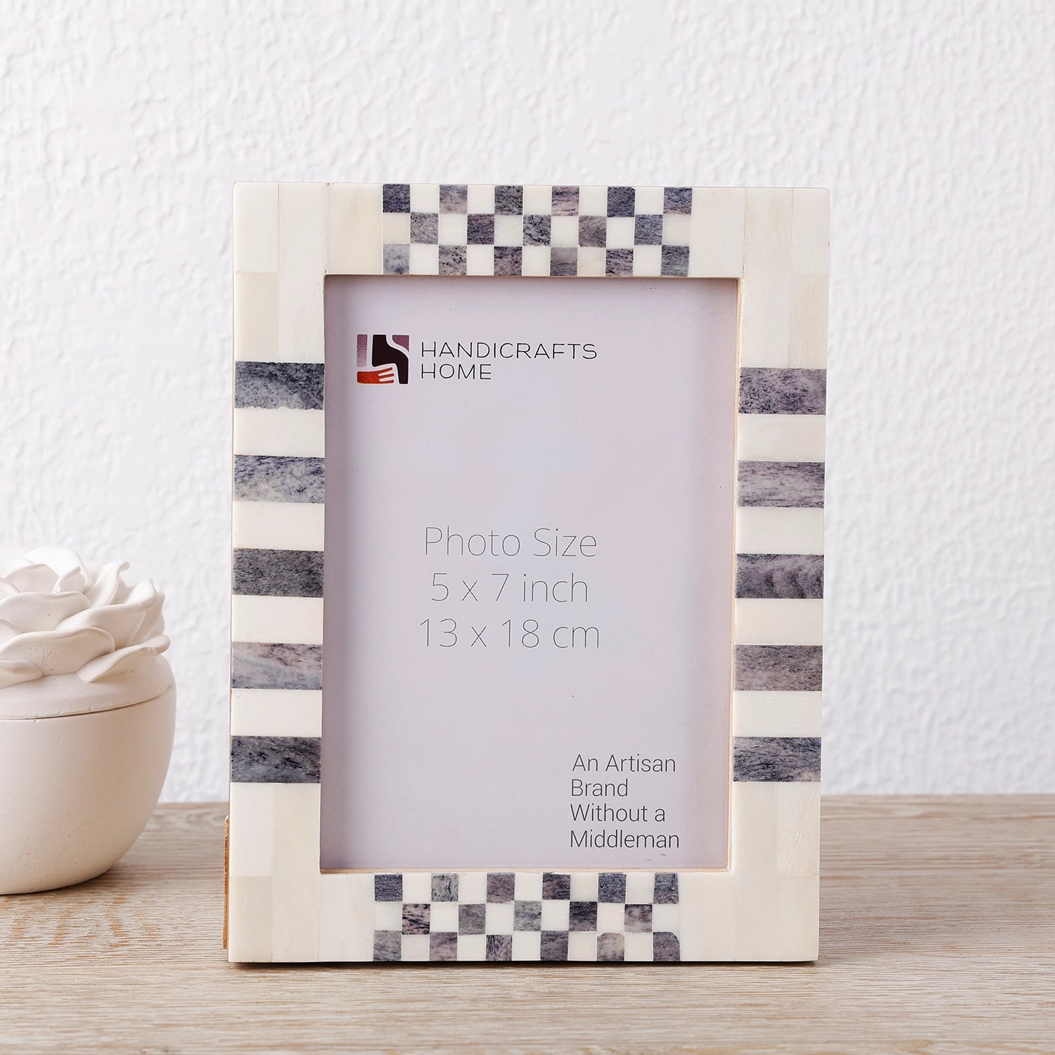Add refined character to your space with the Handicrafts Home Picture Frame, handcrafted from authentic bone inlay in an elegant striped and checked pattern. Set against a sleek grey and white palette and mounted on sturdy Pine MDF, this frame is a true statement of artisan craftsmanship. Each piece blends traditional techniques with contemporary style—making it a unique and ethical addition to your home decor.