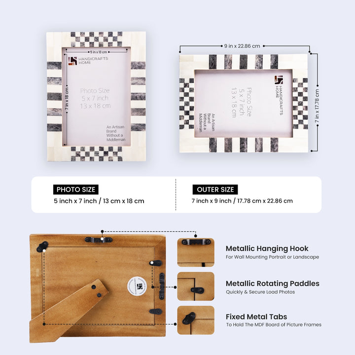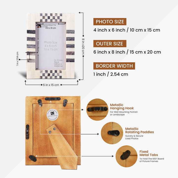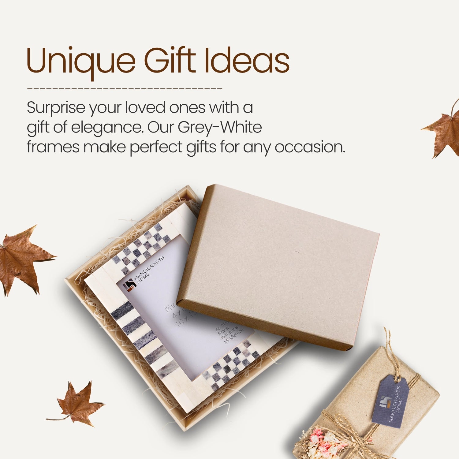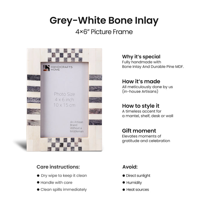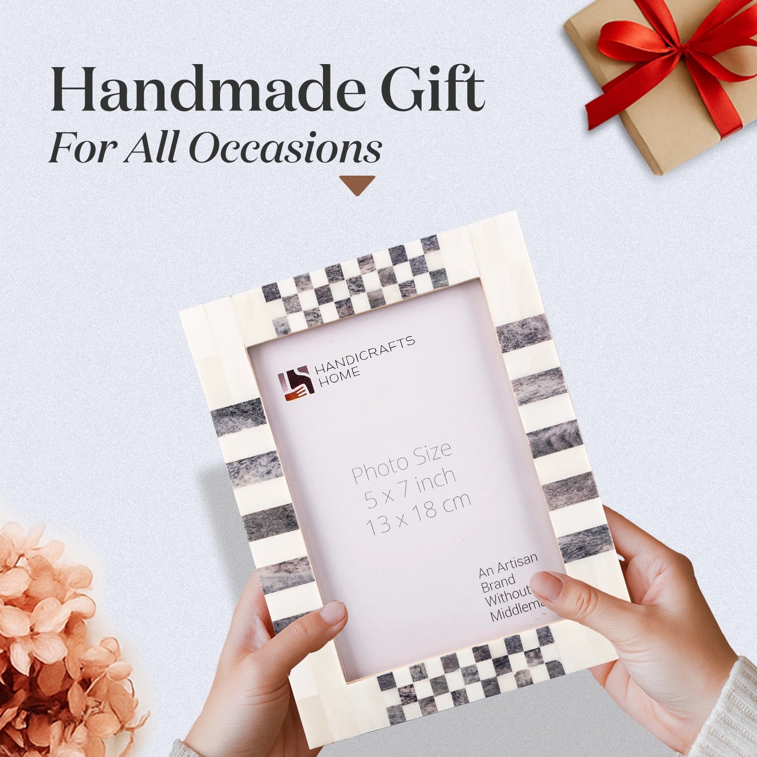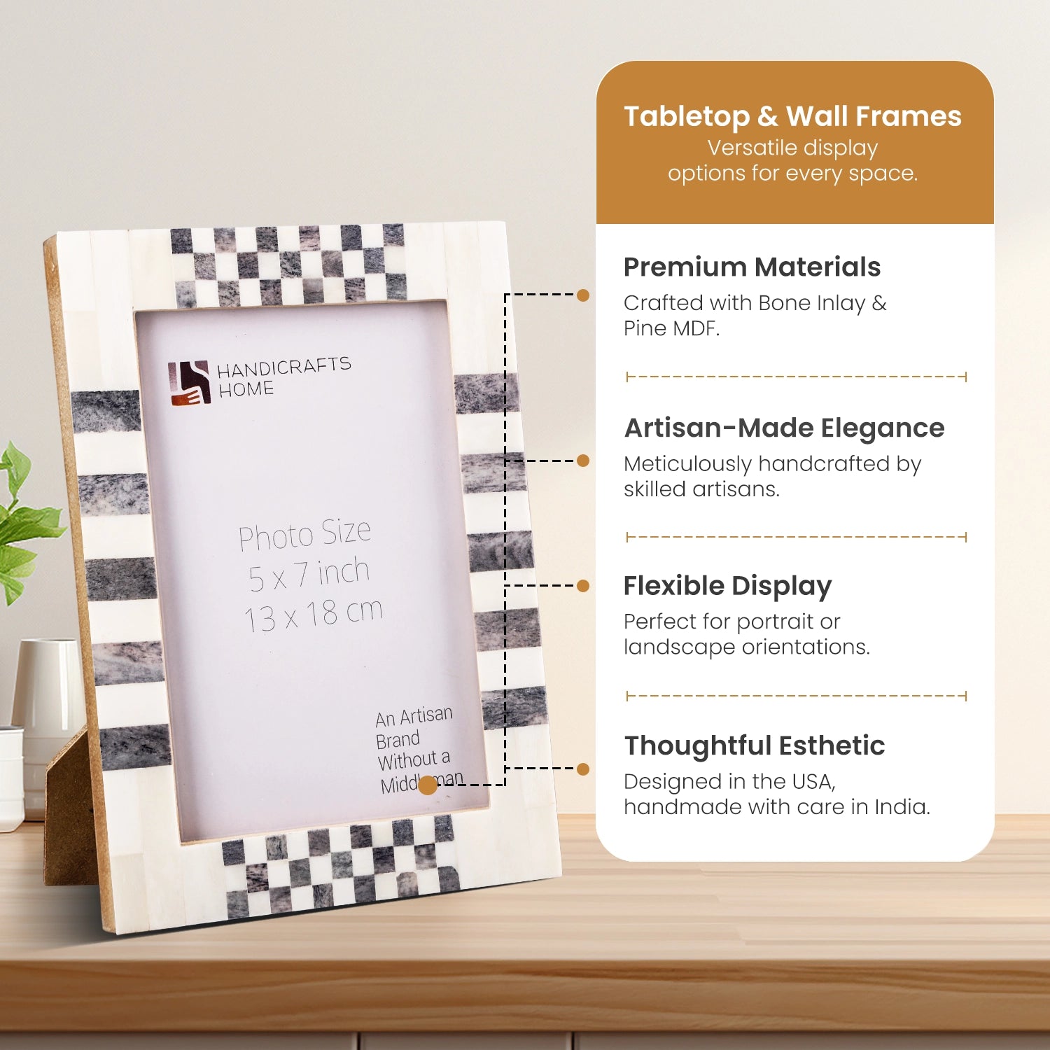 Add refined character to your space with the Handicrafts Home Picture Frame, handcrafted from authentic bone inlay in an elegant striped and checked pattern. Set against a sleek grey and white palette and mounted on sturdy Pine MDF, this frame is a true statement of artisan craftsmanship. Each piece blends traditional techniques with contemporary style—making it a unique and ethical addition to your home decor.