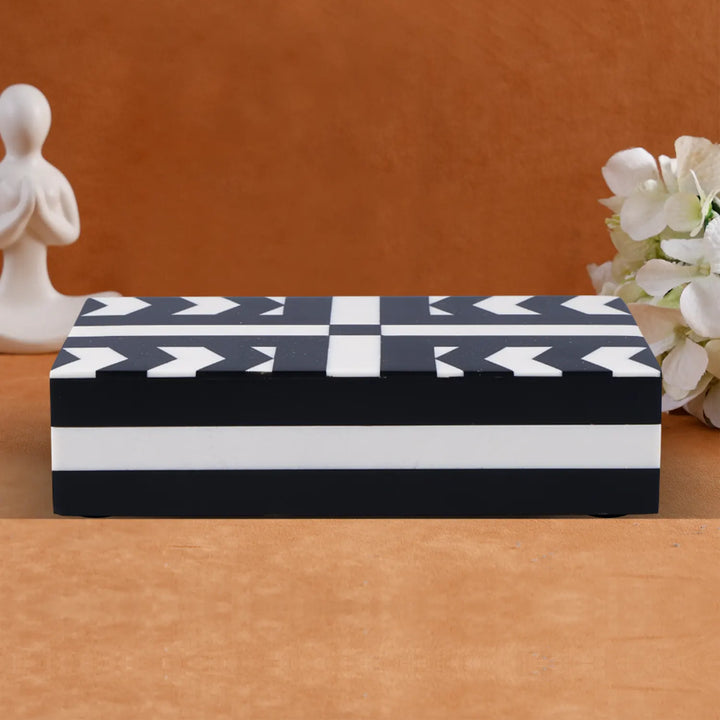 Bring elegance and utility into your space with the Handicrafts Home Patisserie Adorn Decorative Storage Box. Handcrafted by skilled Indian artisans, this compact wooden box features a striking black & white resin inlay design inspired by classic patterns with a modern twist. Perfect for use as a boho decorative box, gift box, or organizer box, it fits effortlessly into a variety of trending home décor styles — from bohemian decor to modern home decor.