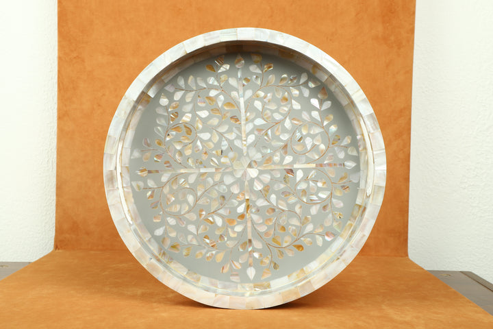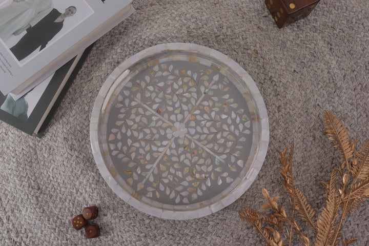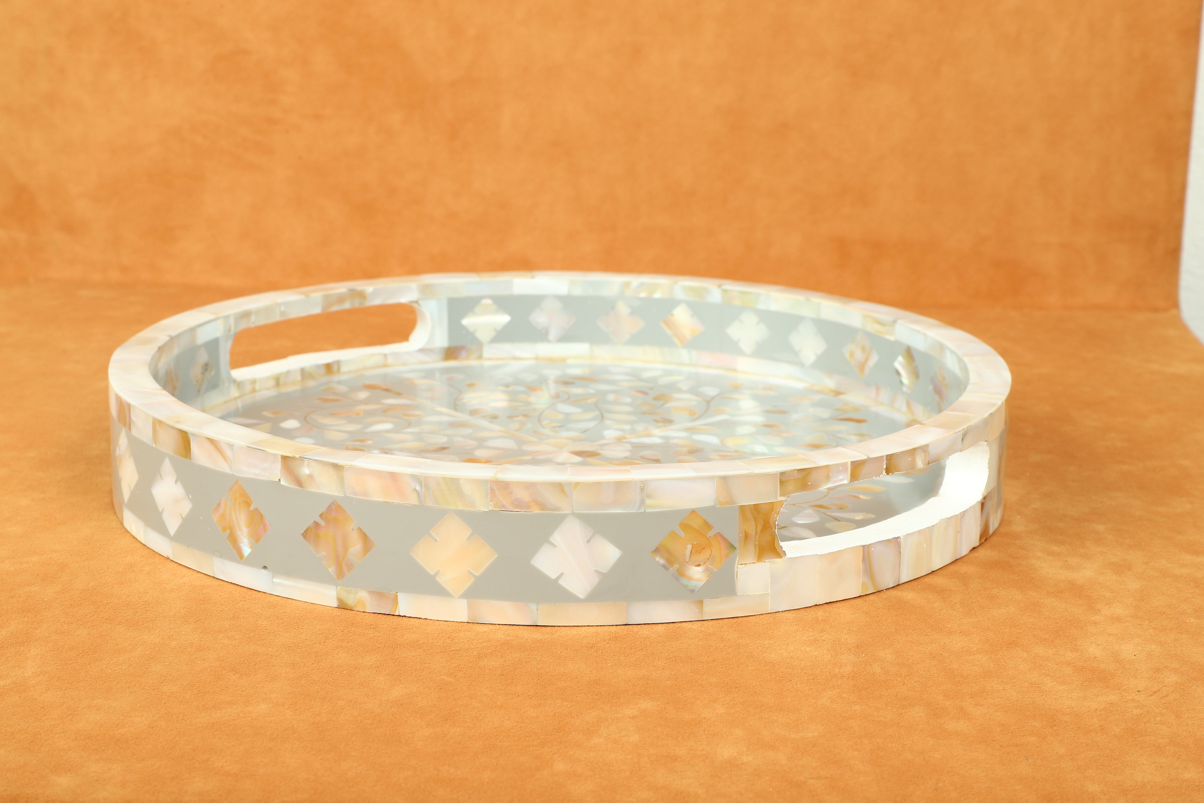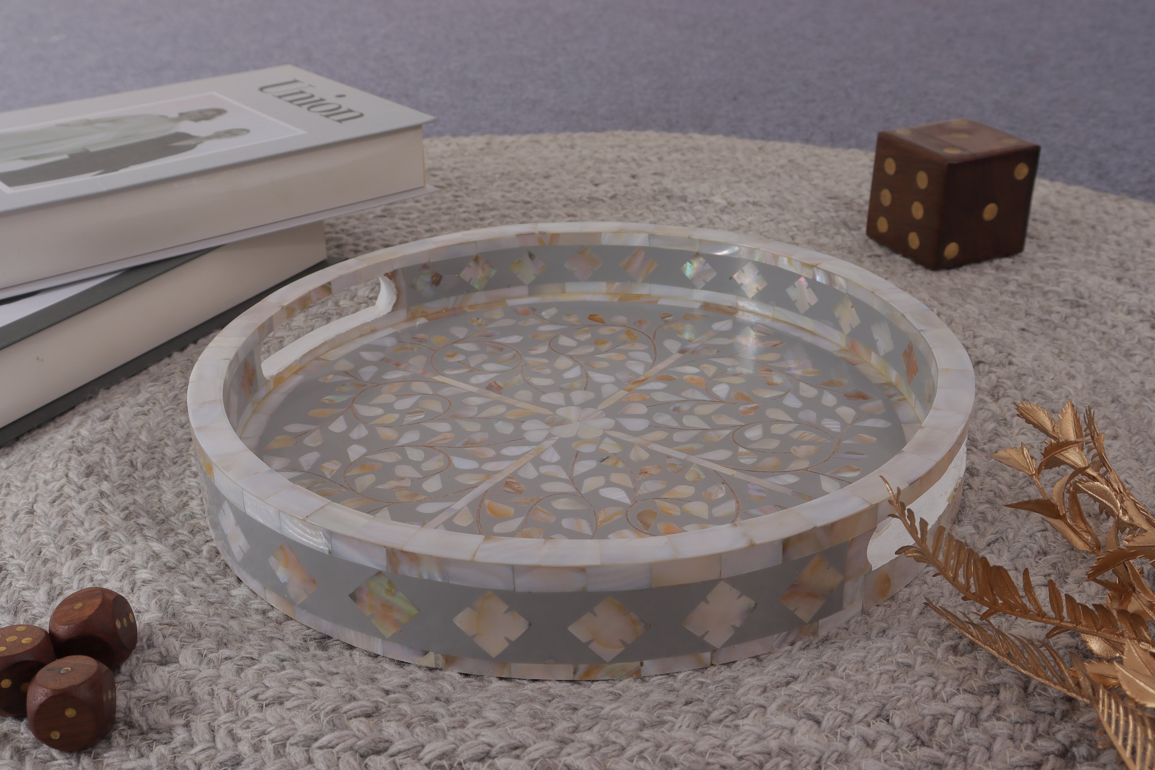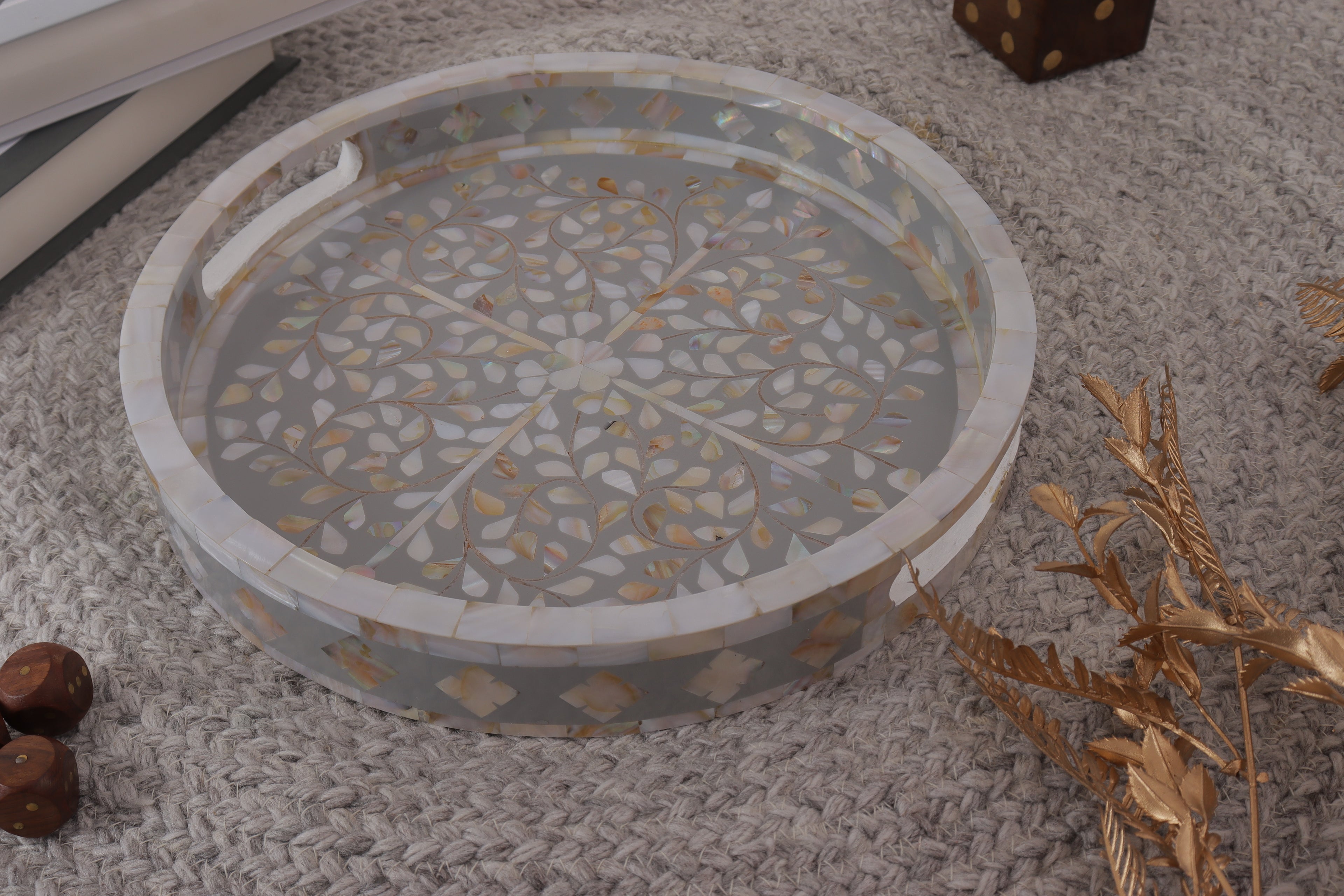 Bring timeless elegance into your space with the Handicrafts Home 12x12” Round White Decorative Tray, a handcrafted masterpiece that blends luxury, function, and artisan craftsmanship. Featuring a stunning Mother of Pearl and resin inlay in an intricate Alhambra pattern, this boho-inspired tray adds a refined, radiant touch to any space—whether it's your coffee table, vanity, or kitchen counter.