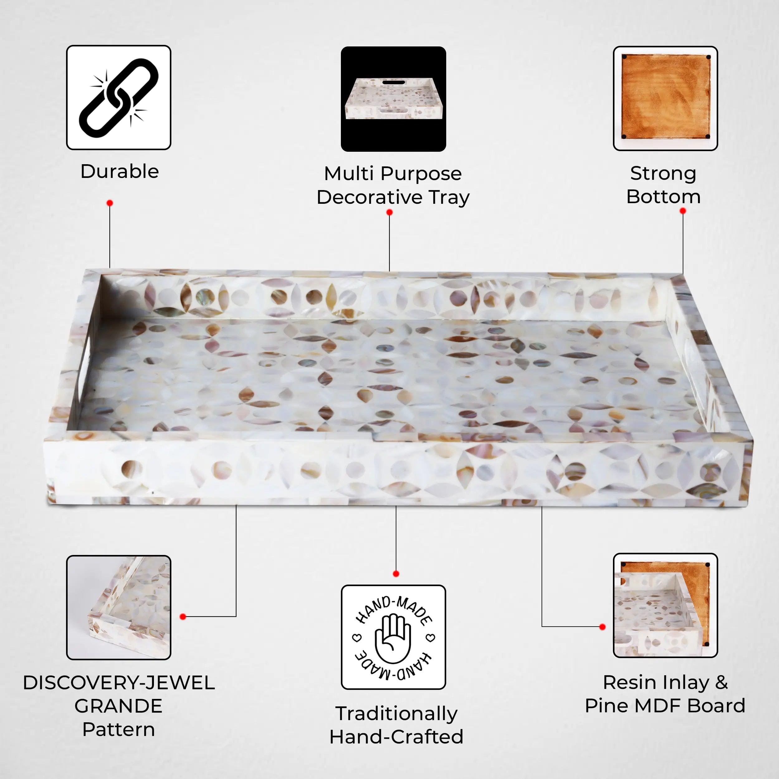 Decorative Tray Discovery Jewel Grande Pattern Mother of Pearl & Resin Inlay Collection in 2 Sizes
