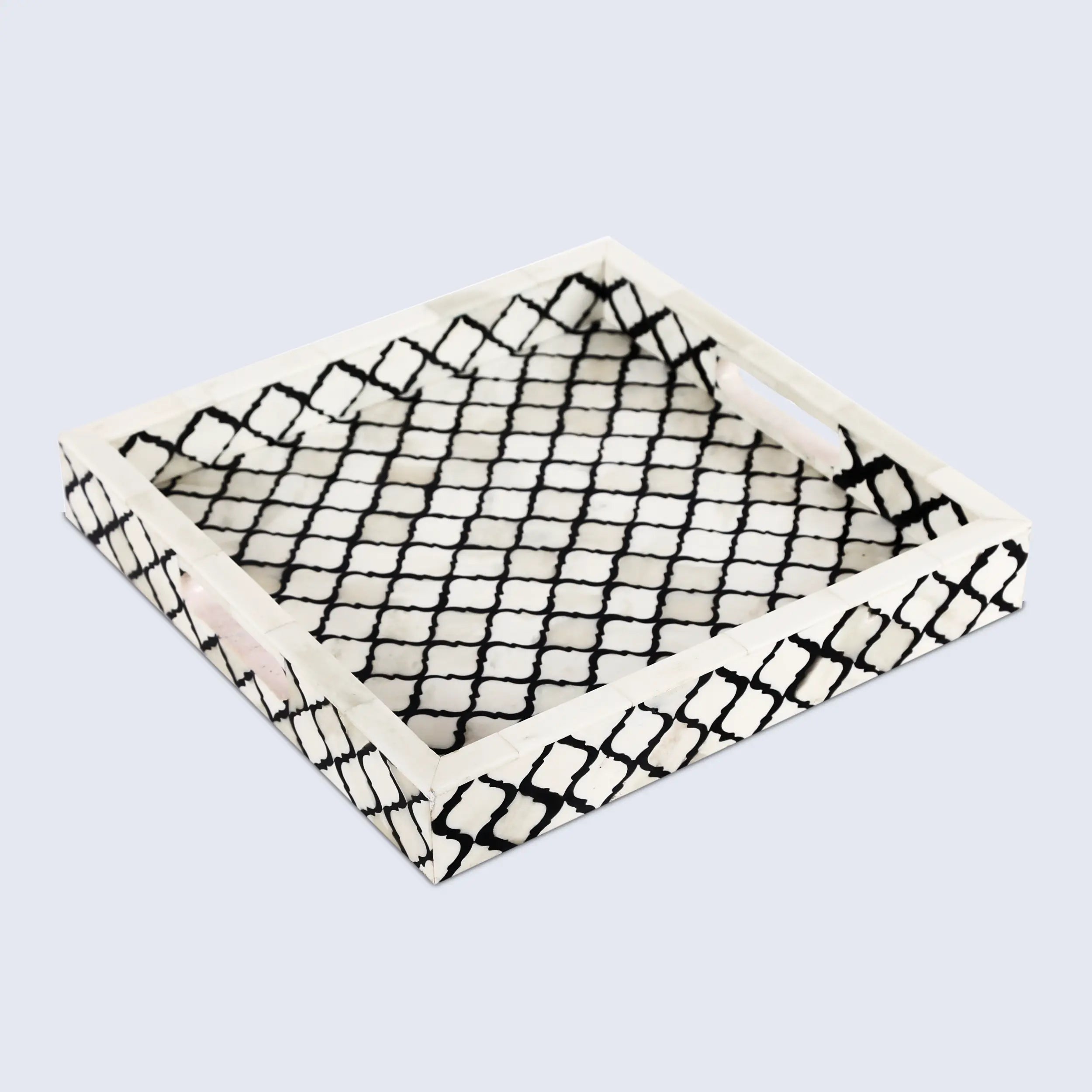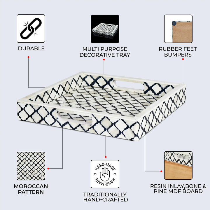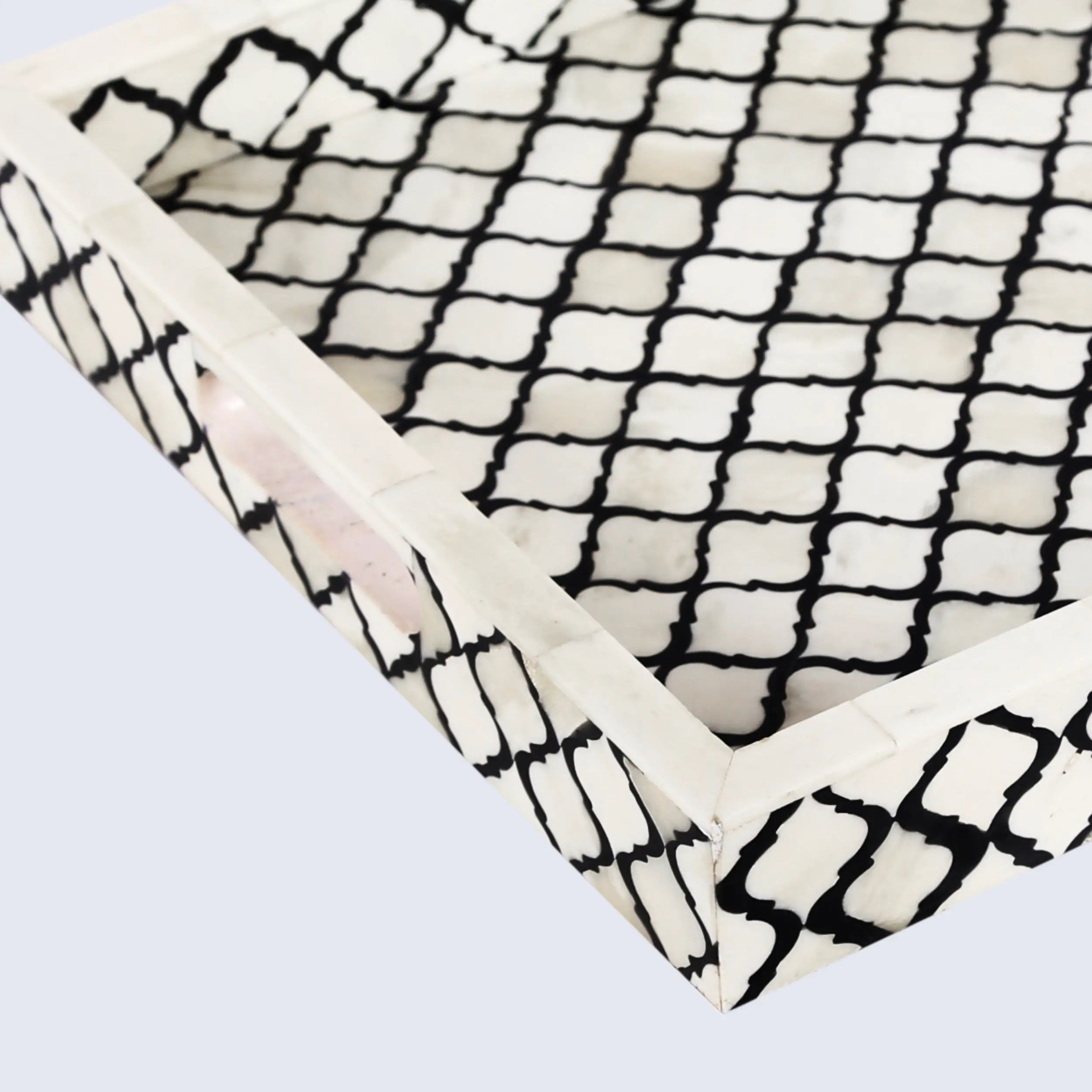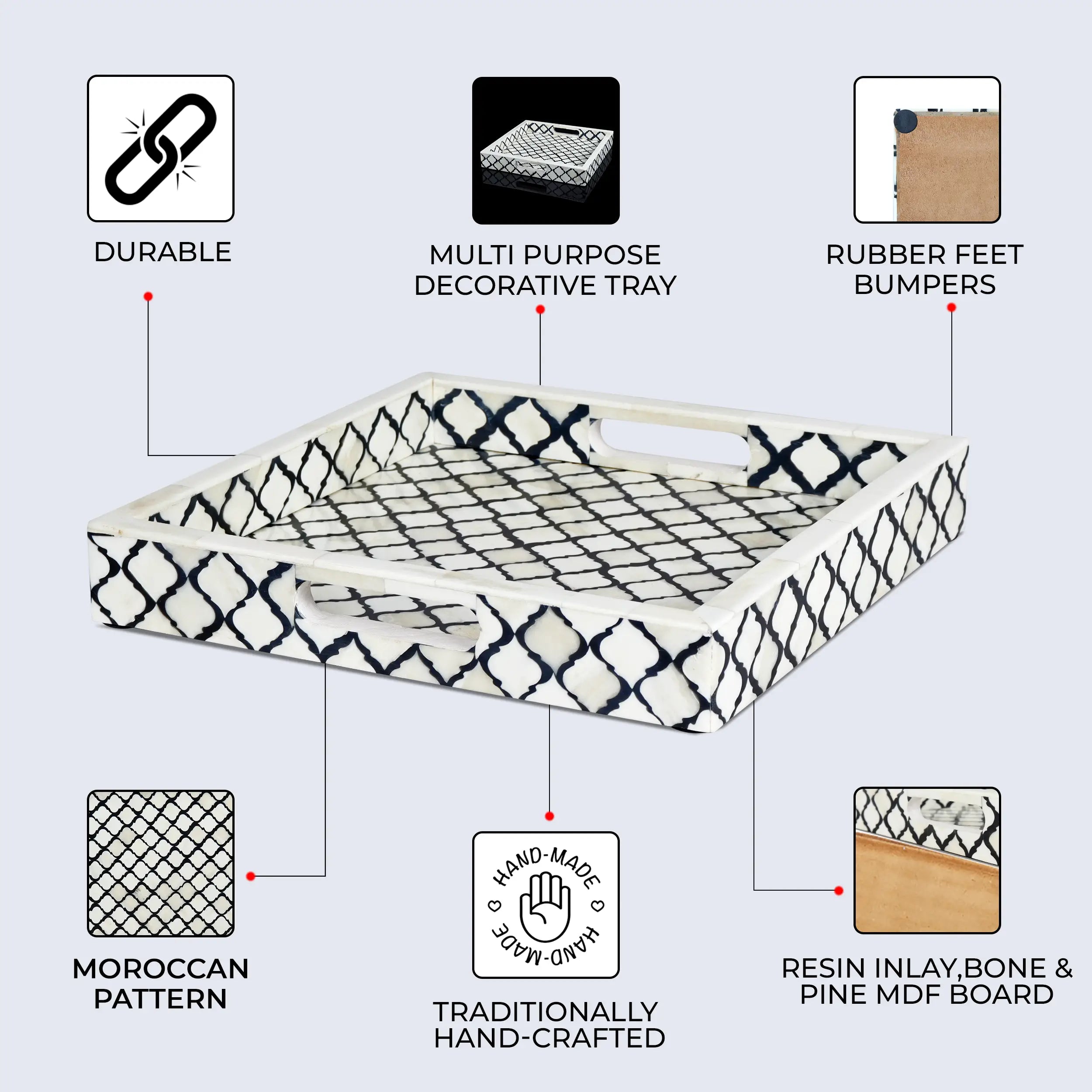 Decorative Tray Moroccan Pattern Bone & Resin Inlay Collection in 3 Sizes, Black & White
