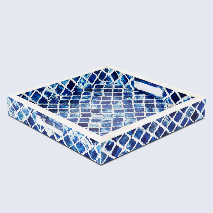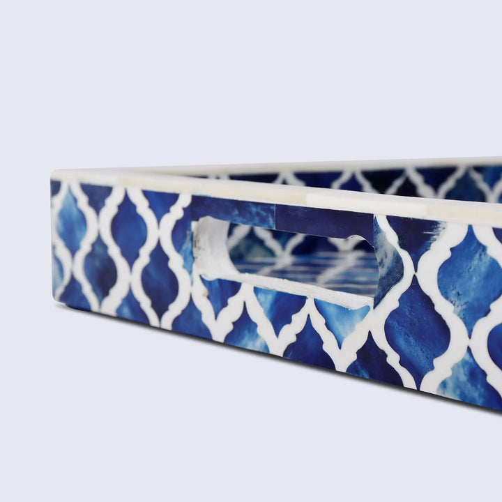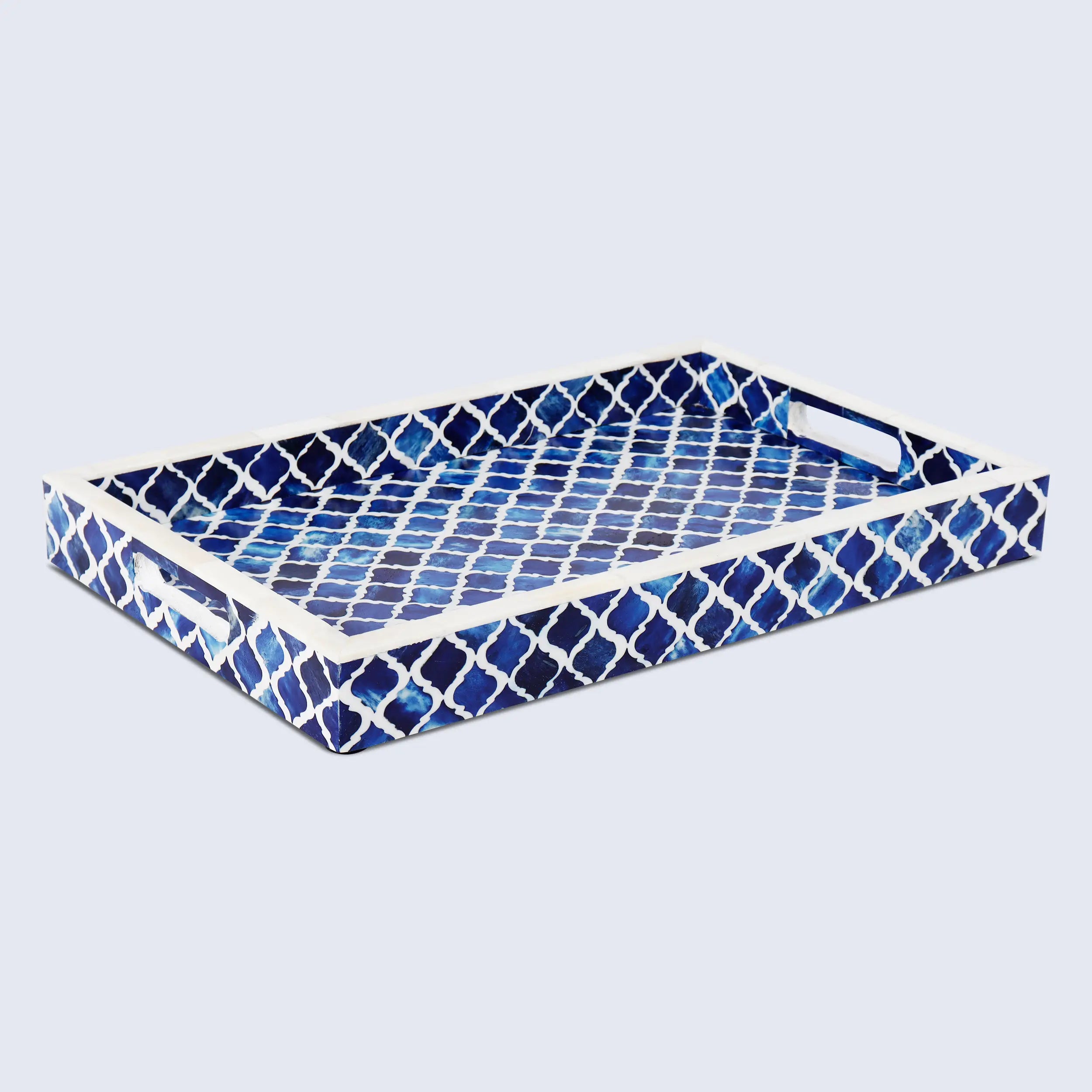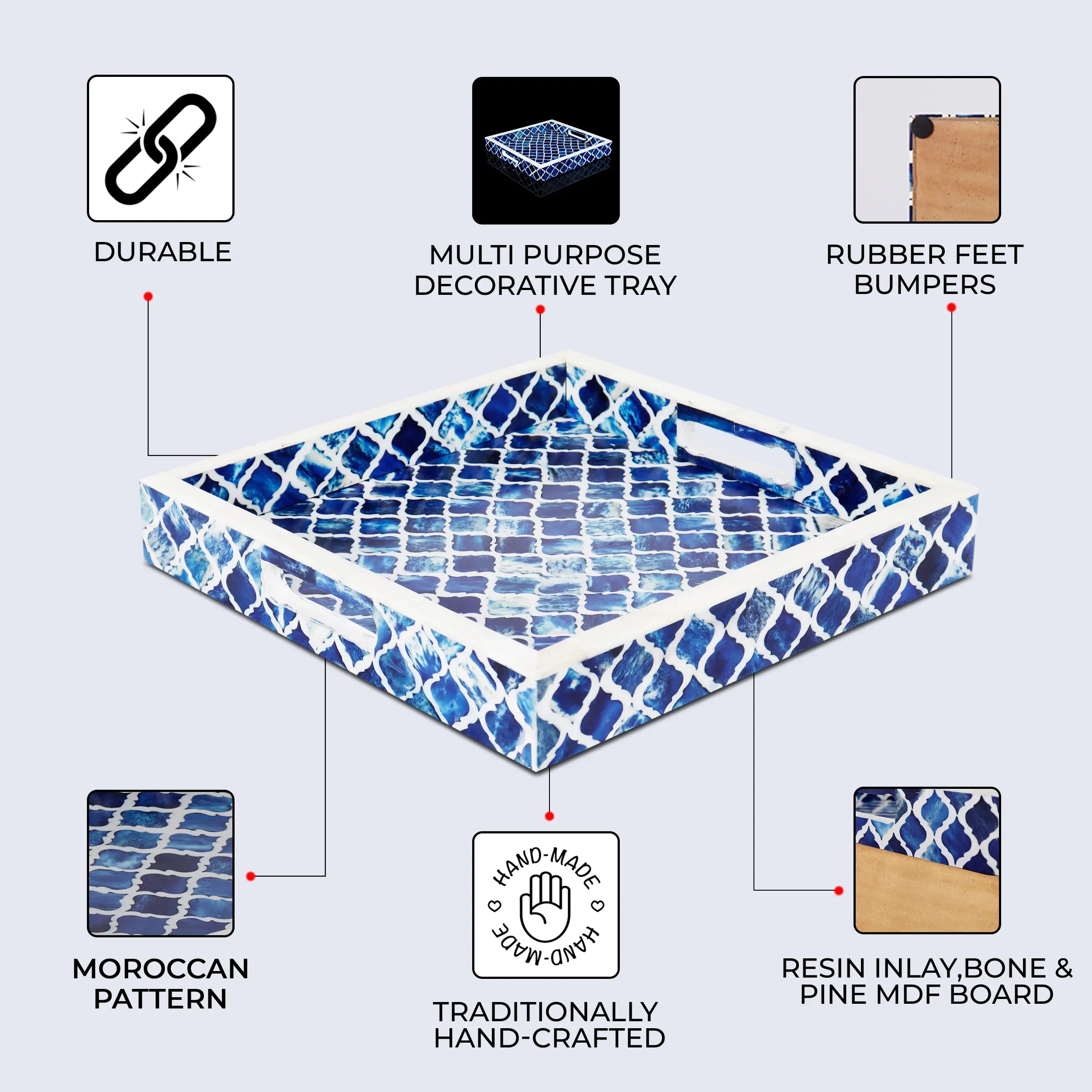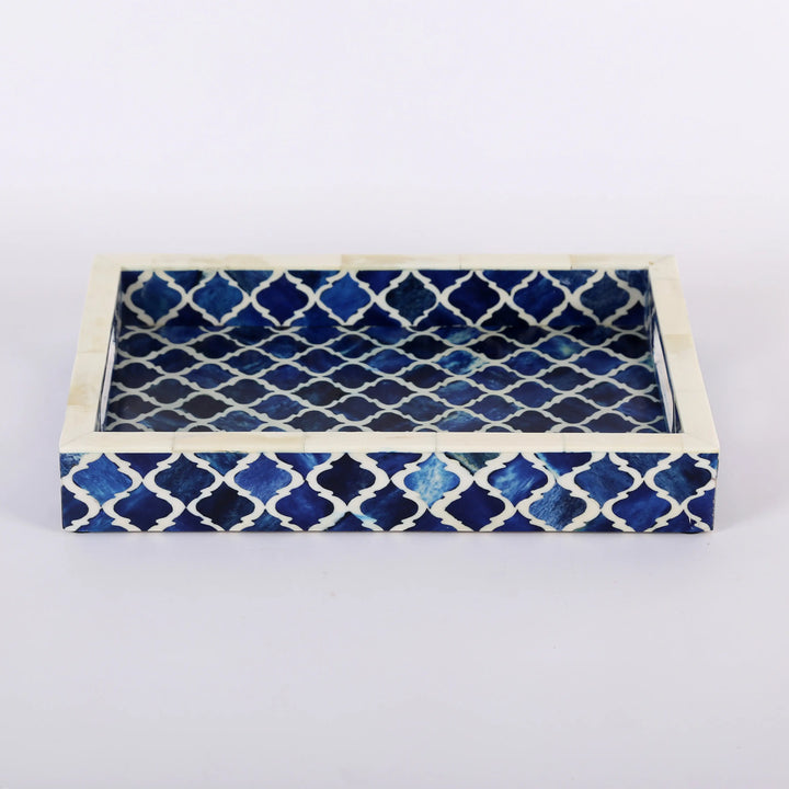 Decorative Tray Moroccan Pattern Bone & Resin Inlay Collection in 3 Sizes, Blue & White