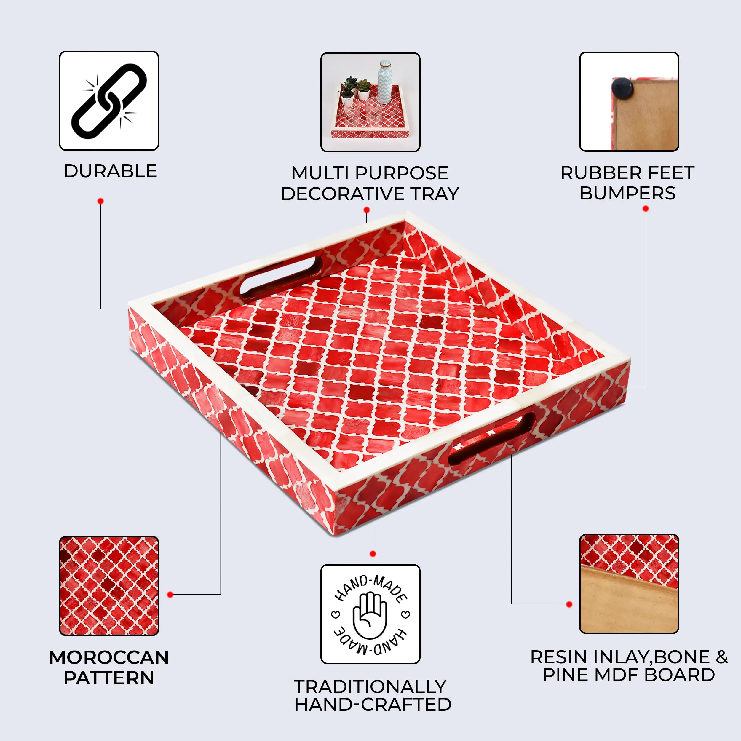 Decorative Tray Moroccan Pattern Bone & Resin Inlay Collection in 3 Sizes, Red & White