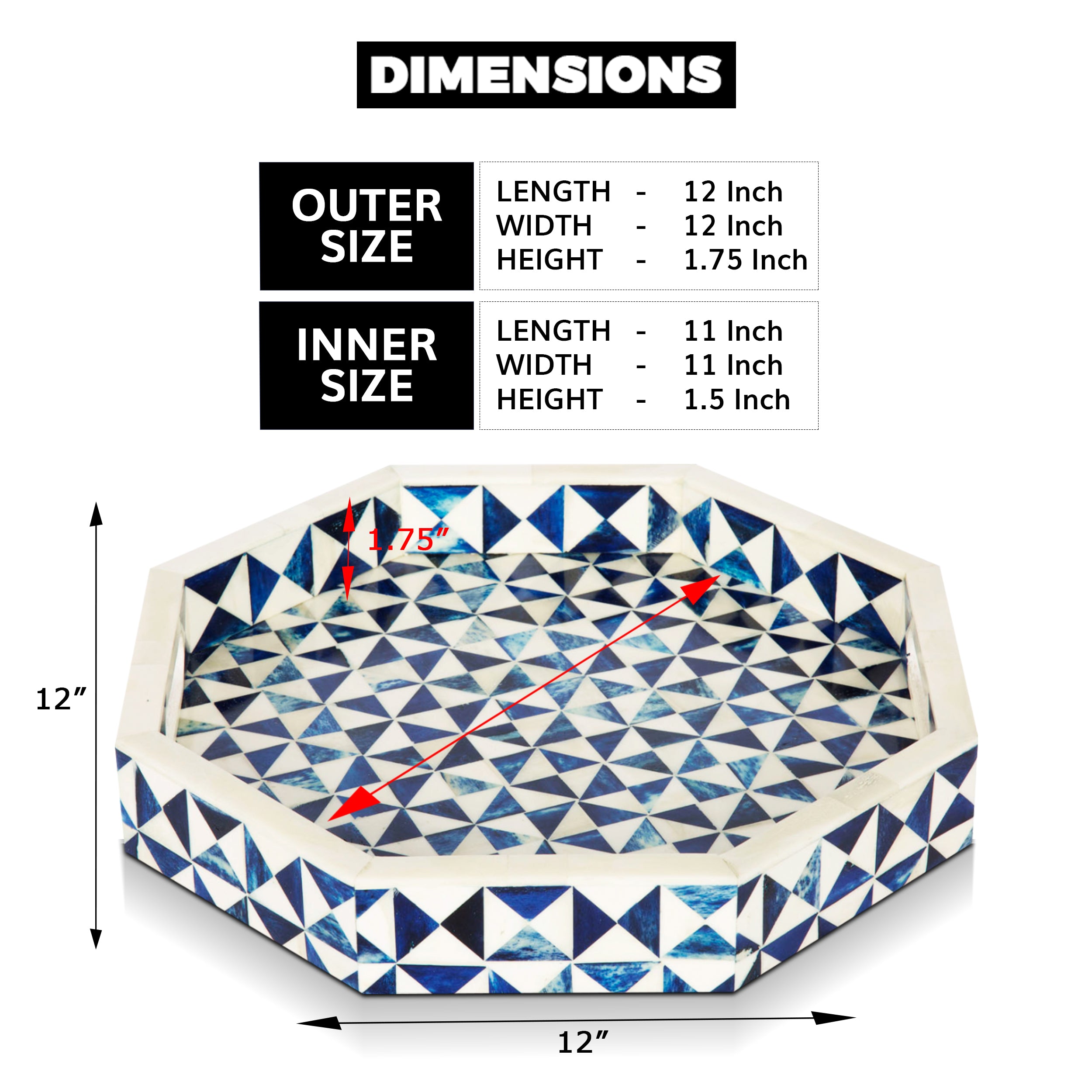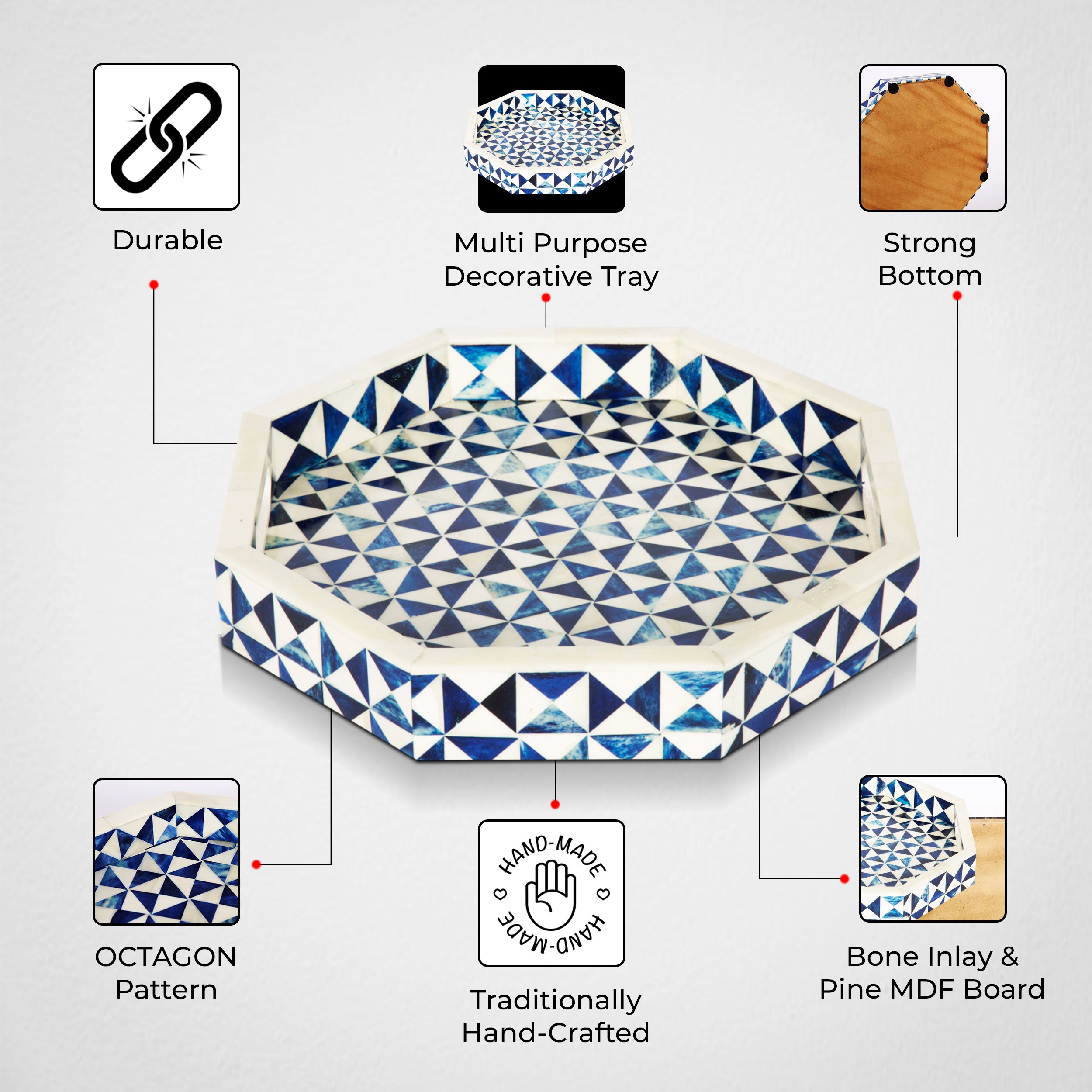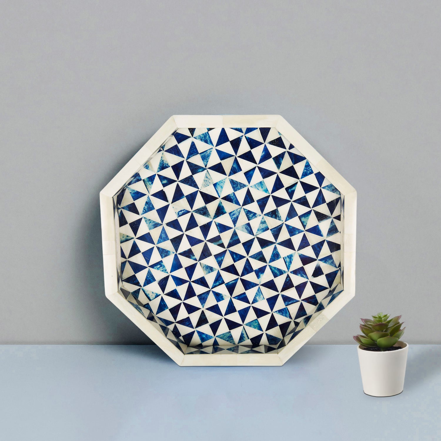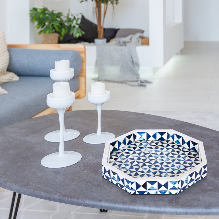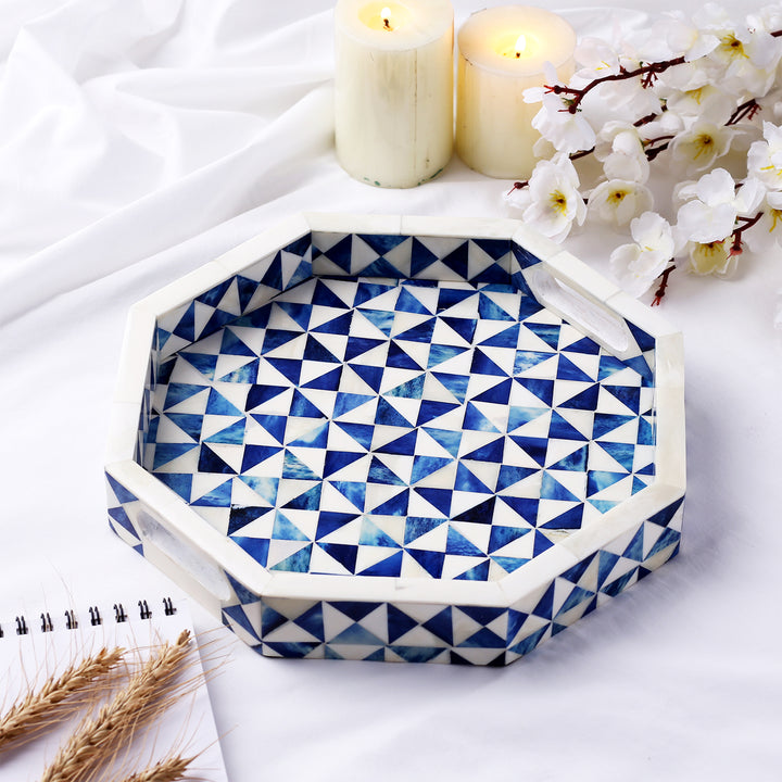 Decorative Tray Octagon Pattern Bone Inlay, White & Blue, 12" x 12"
