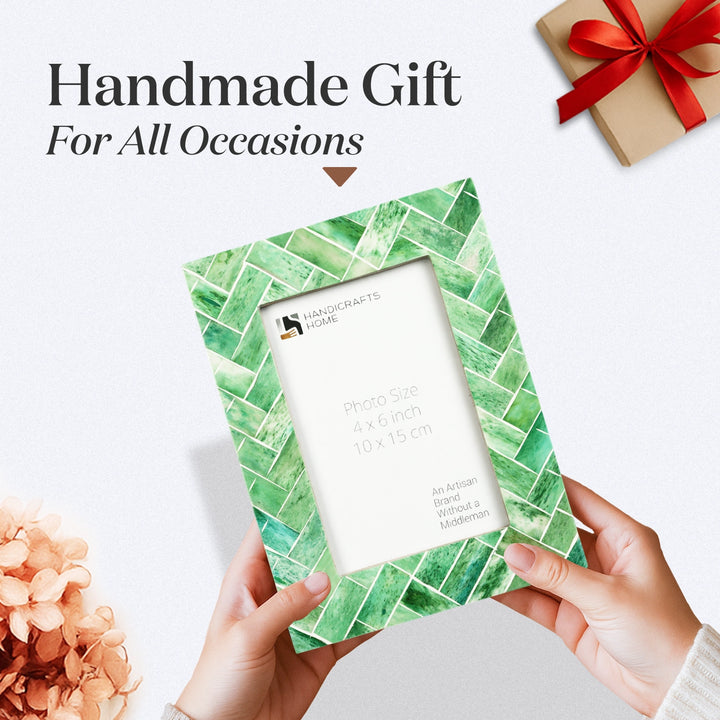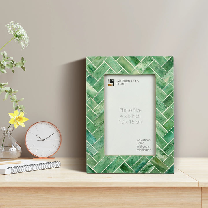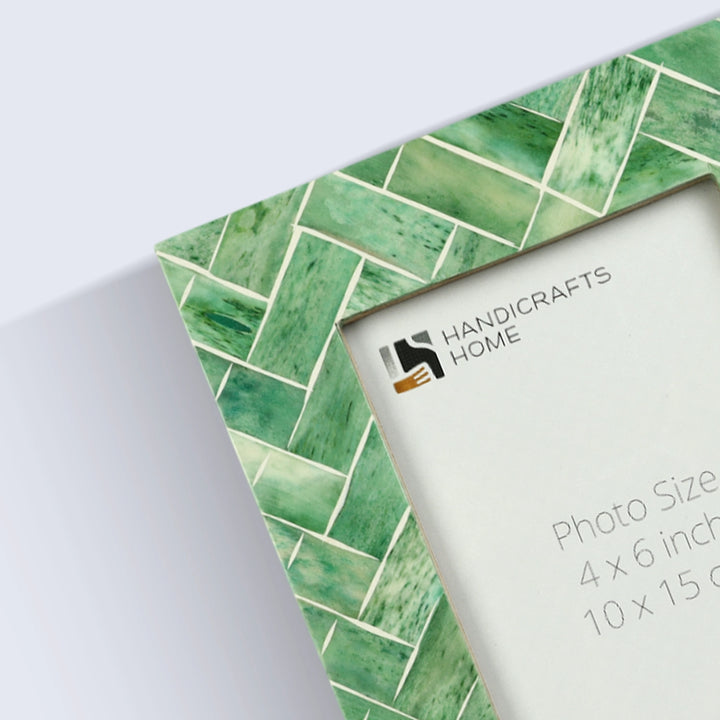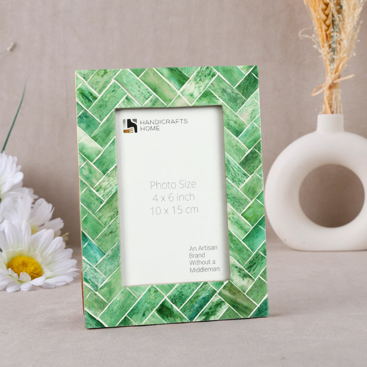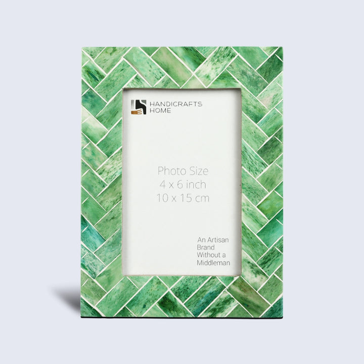 Handicrafts Home presents the Green Leaf Inspiration with Bone Inlay Green & White 4x6 Picture Frame, a beautifully handcrafted piece designed to enhance any space. This photo frame features green bone inlay with hand carved white line and backing with sturdy pine MDF, ensuring both elegance and durability.