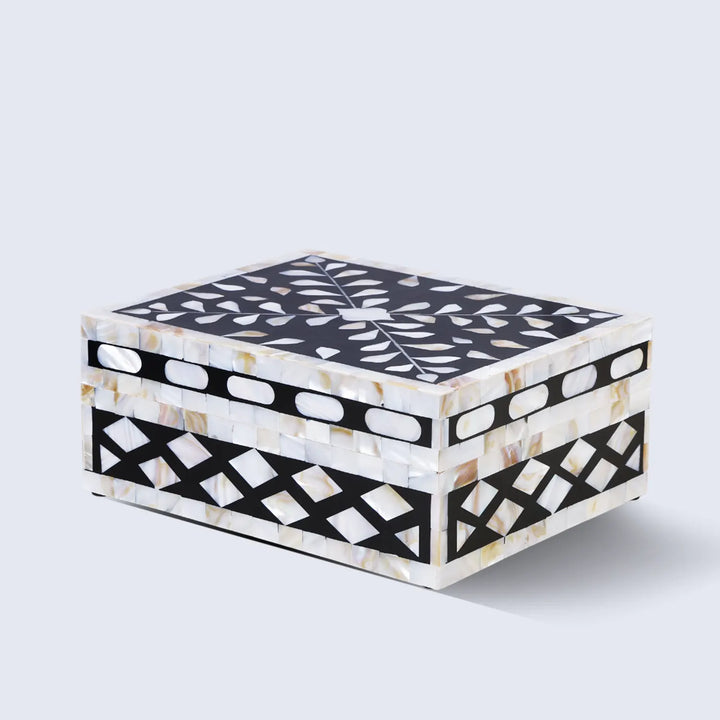 Stylish Decorative Storage Box for Home Decor: Enhance your living space with a modern yet timeless decorative box featuring elegant handcrafted Alhambra Negra patterns. Perfect as a coffee table decor accent, mantle piece, shelf organizer, or hallway console accessory, this box blends seamlessly with modern, boho, vintage, western, or minimalist interiors.