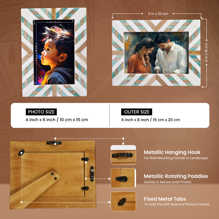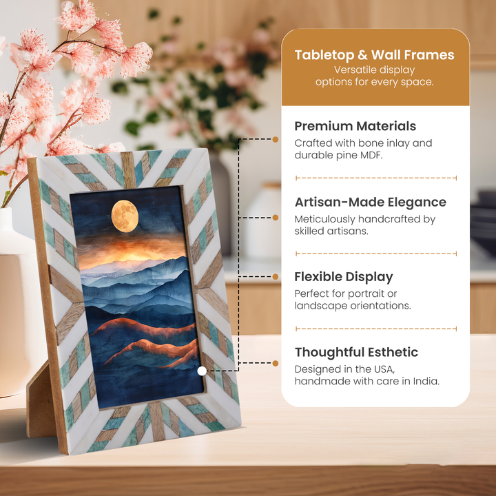 Bring timeless charm to your home with Handicrafts Home’s handcrafted green and white bone inlay and wood photo frame. Made from sturdy pine MDF and showcasing the unique Hypno Saga pattern, this modern boho-style frame blends effortlessly with contemporary, rustic, or coastal decor. Whether displayed on a tabletop, shelf, or wall, it’s the perfect way to highlight your most treasured memories.