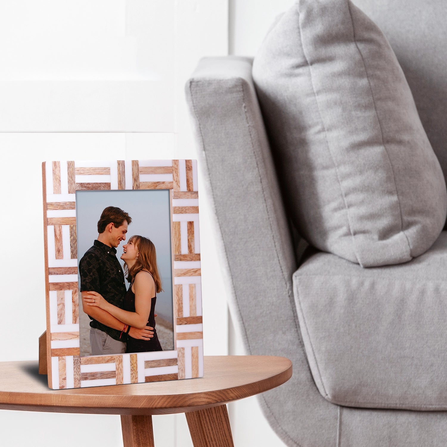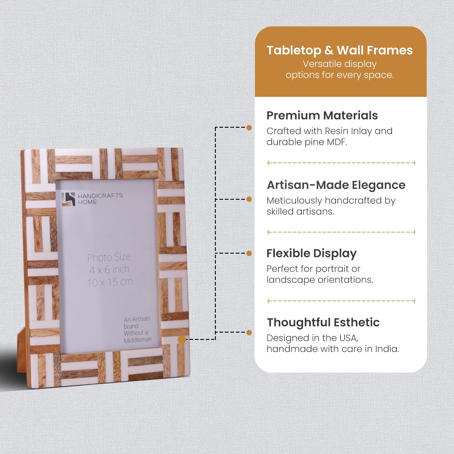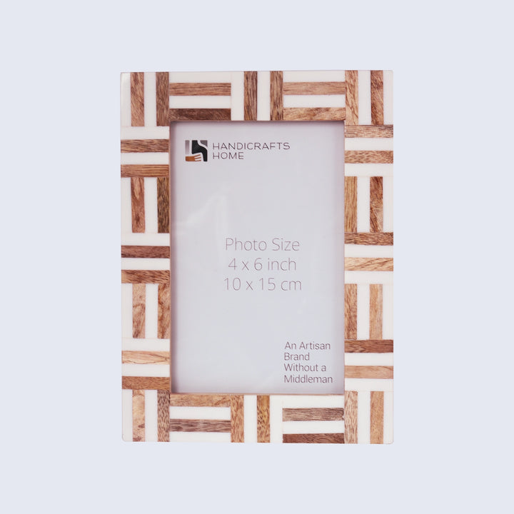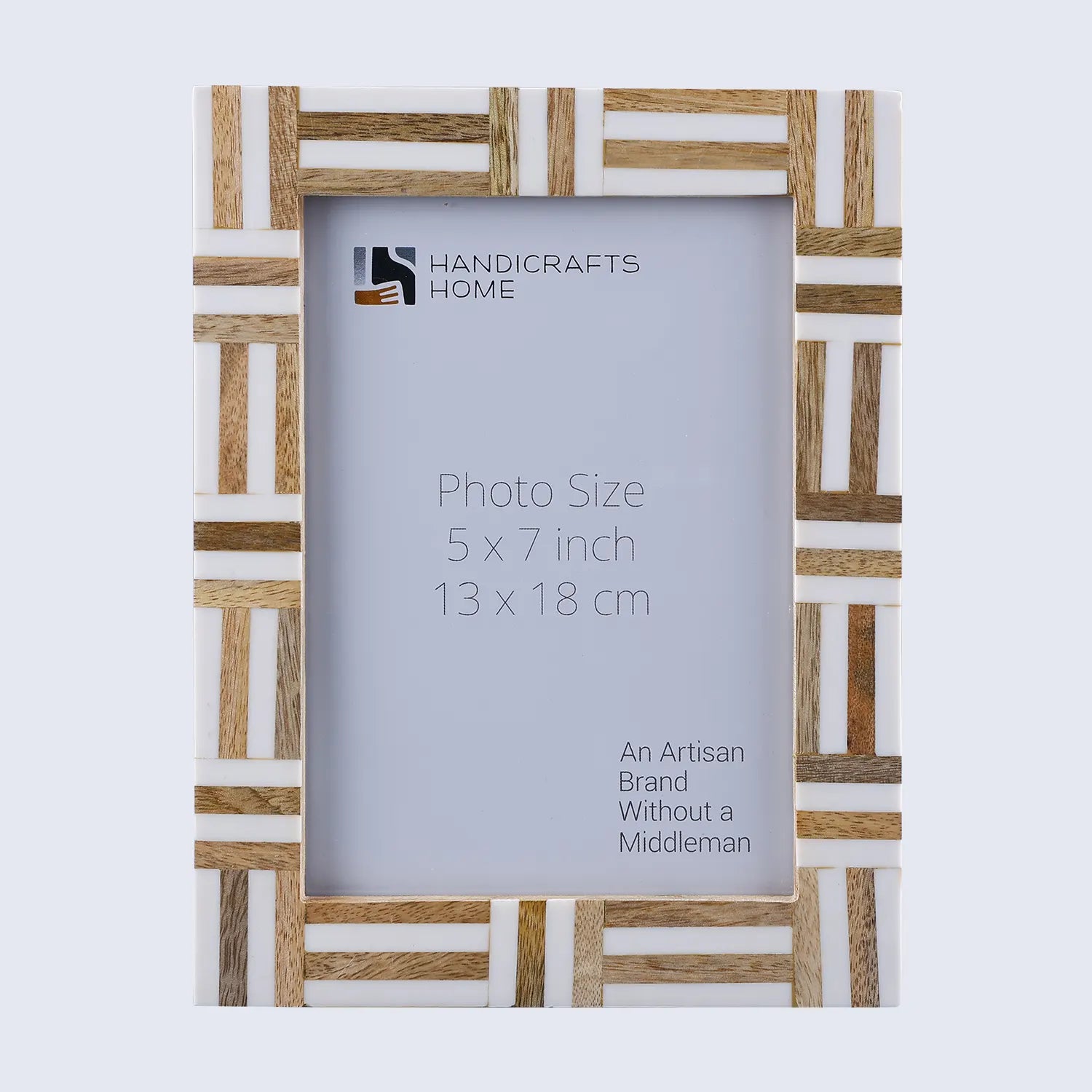 Enrich your space with this artisan-crafted photo frame by Handicrafts Home, designed to blend modern lines with earthy warmth. Featuring the refined Marquet Grid pattern, the frame pairs brown and white resin inlay with a polished wooden base for a timeless look.