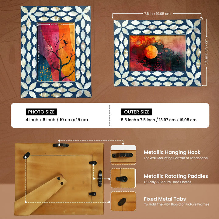 Add timeless elegance to your space with the Handicrafts Home 4x6 photo frame, meticulously handcrafted with a stunning Avant Floral pattern in rich navy blue and luminous pearl white. Featuring a refined blend of mother-of-pearl inlay and smooth resin detailing on a durable Pine MDF base, this luxury photo frame reflects artistic craftsmanship and modern charm.