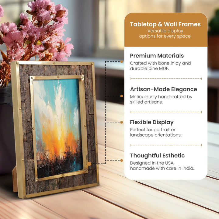 Introducing the Blacksmith Bastion Collection: a vintage-inspired wood and brass picture frame that blends raw natural texture with refined metal artistry. Handcrafted by skilled artisans using solid textured wood and brass corner detailing, each frame carries a uniquely weathered character. Making it a striking accent for fall décor, winter cozy corners, holiday styling, and year round home decor.