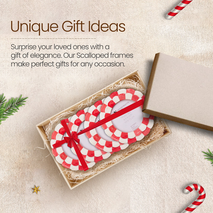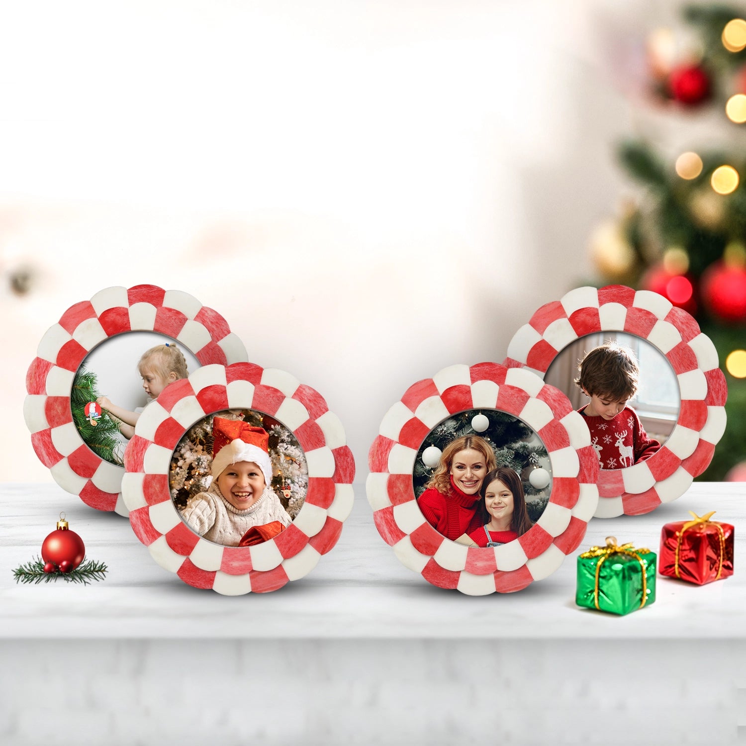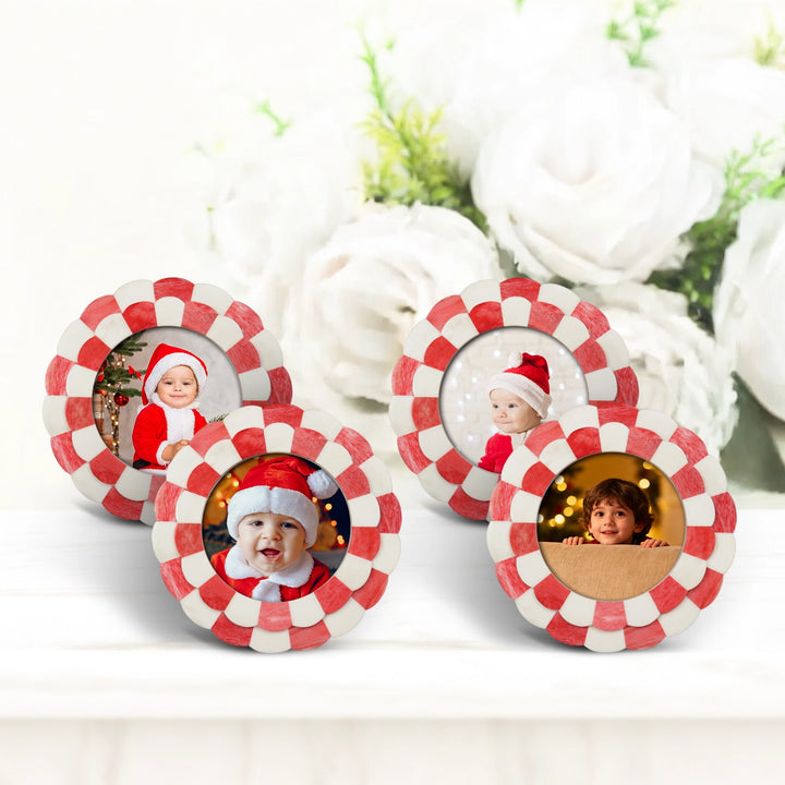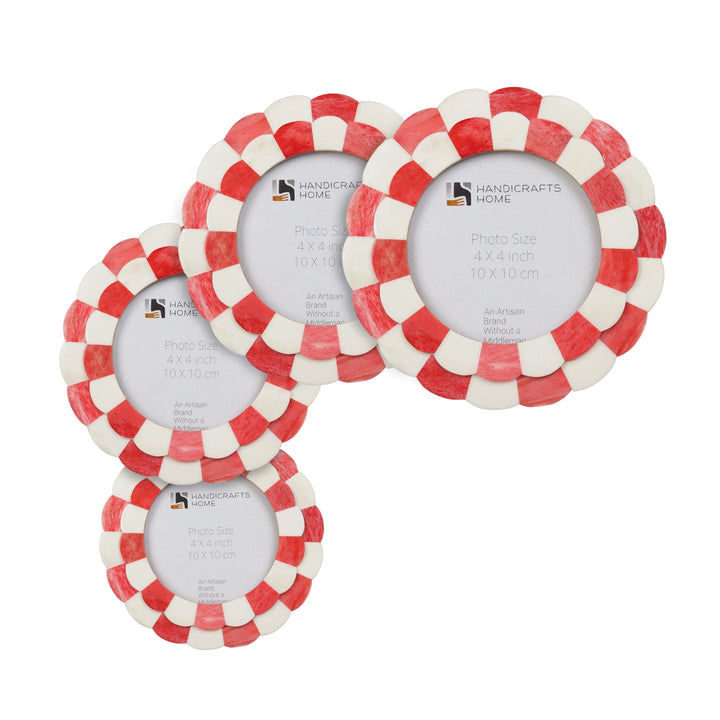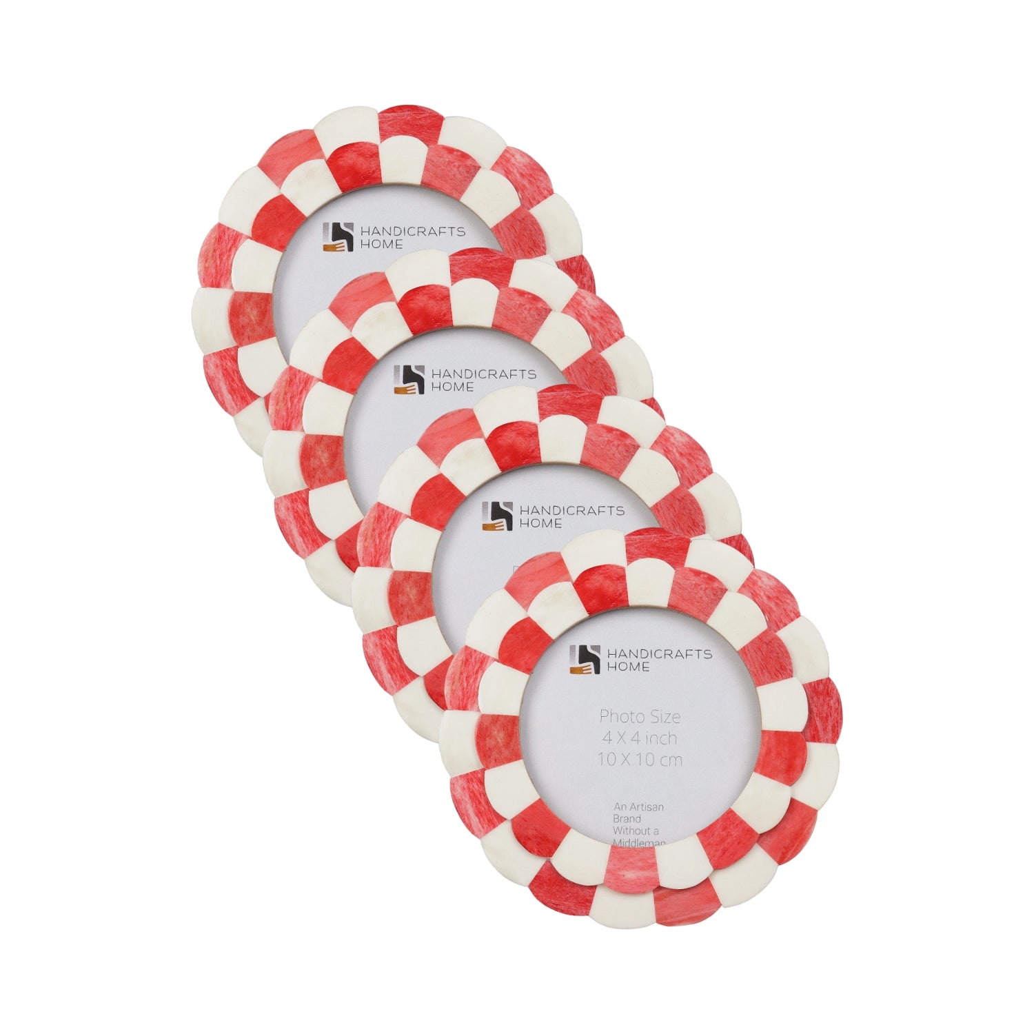 Round Baby Picture Frames Scalloped Pattern Bone Inlay 4"x4", Red