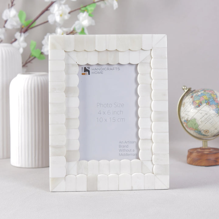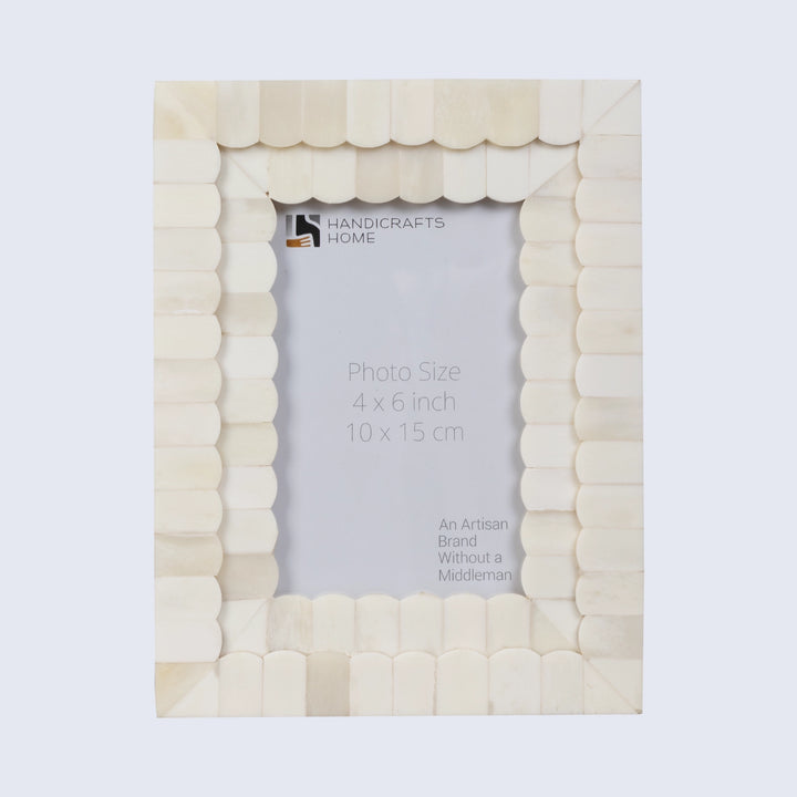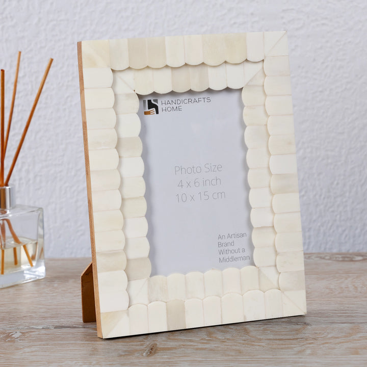 Crafted using authentic bone inlay, this photo frame features a stunning scallop design in classic white, blending beautifully into bohemian, coastal, or minimalist interiors. A true statement piece with artisan charm.