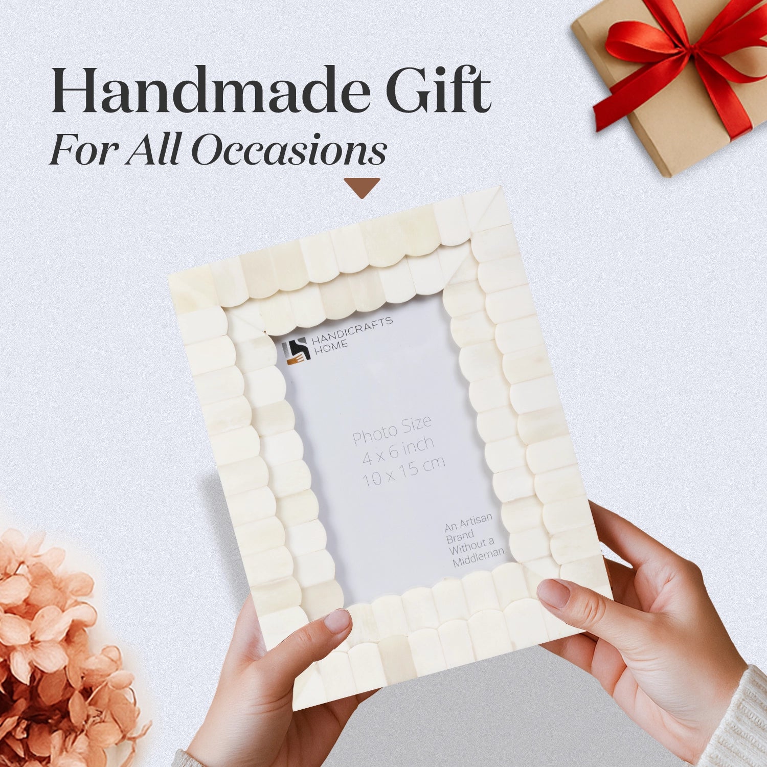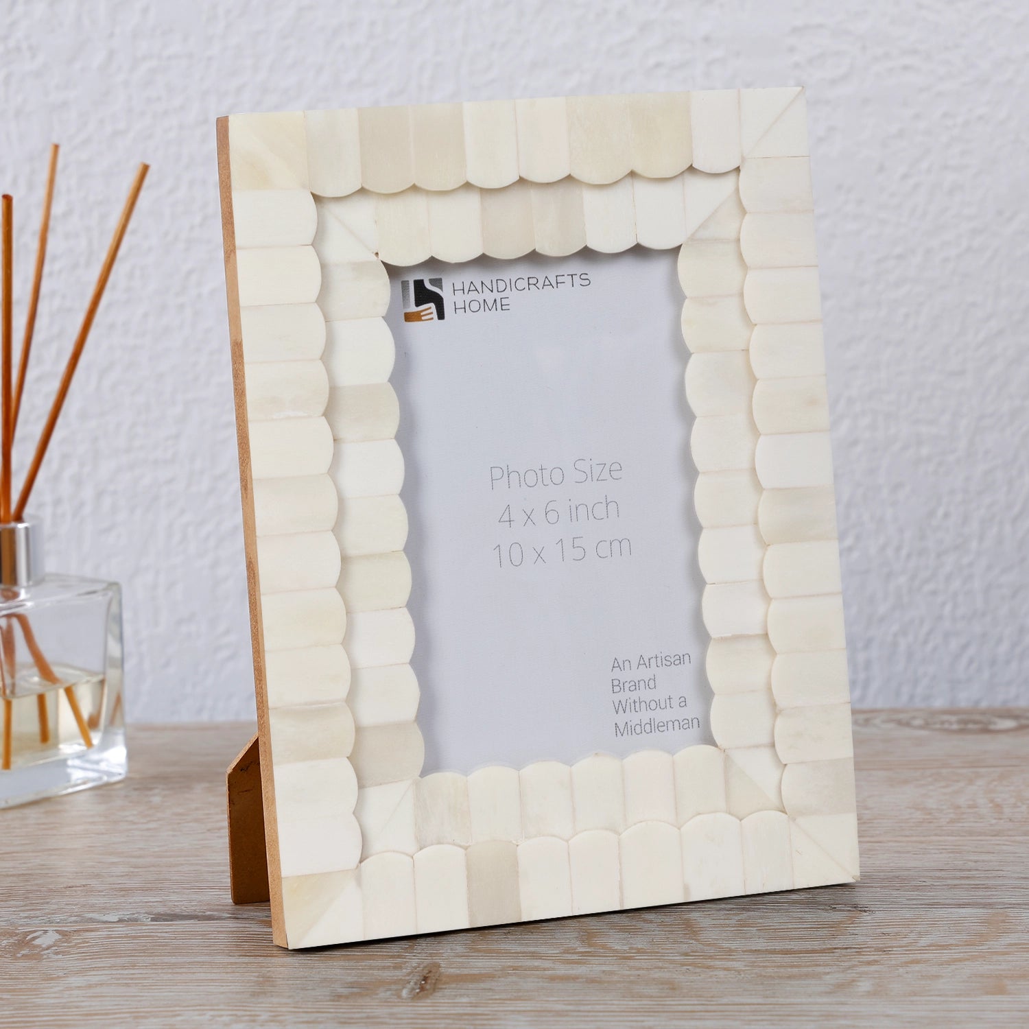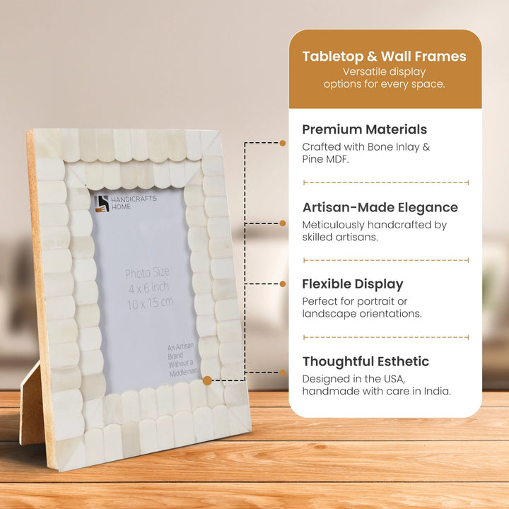 Add timeless charm to your home with the Handicraft Home White Bone Inlay Photo Frame, available in 4x6 and 5x7 sizes. Expertly handcrafted by skilled artisans, this elegant frame features a delicate white scallop pattern made from ethically sourced bone inlay, perfect for boho, coastal, or vintage-inspired spaces. A beautiful way to display photos, prints, or artwork with artisan style.