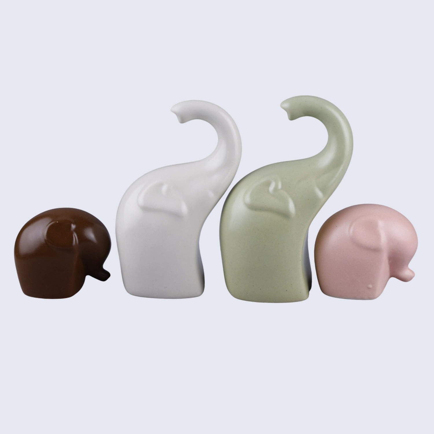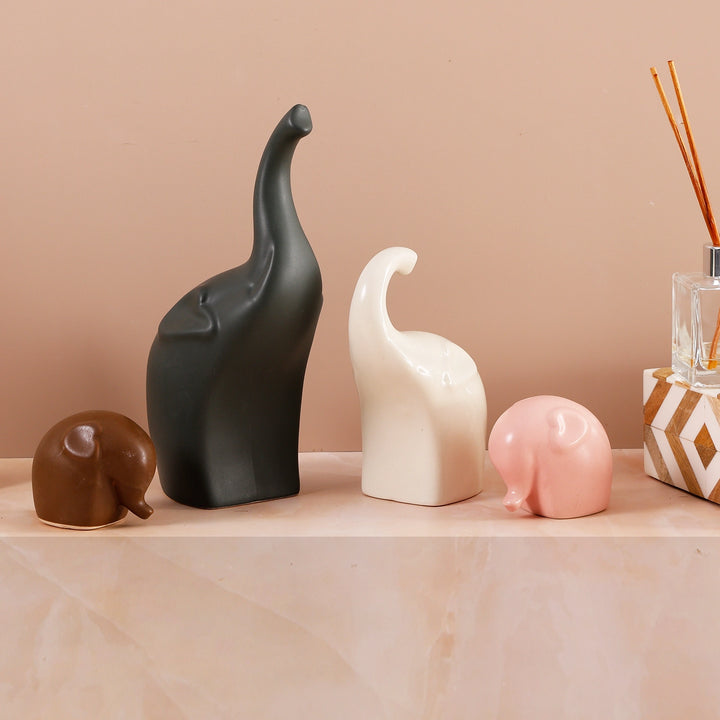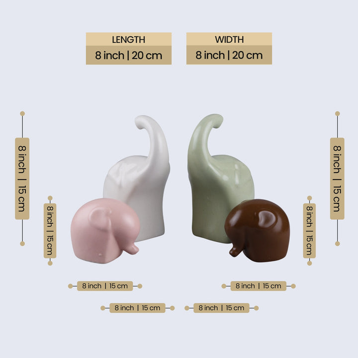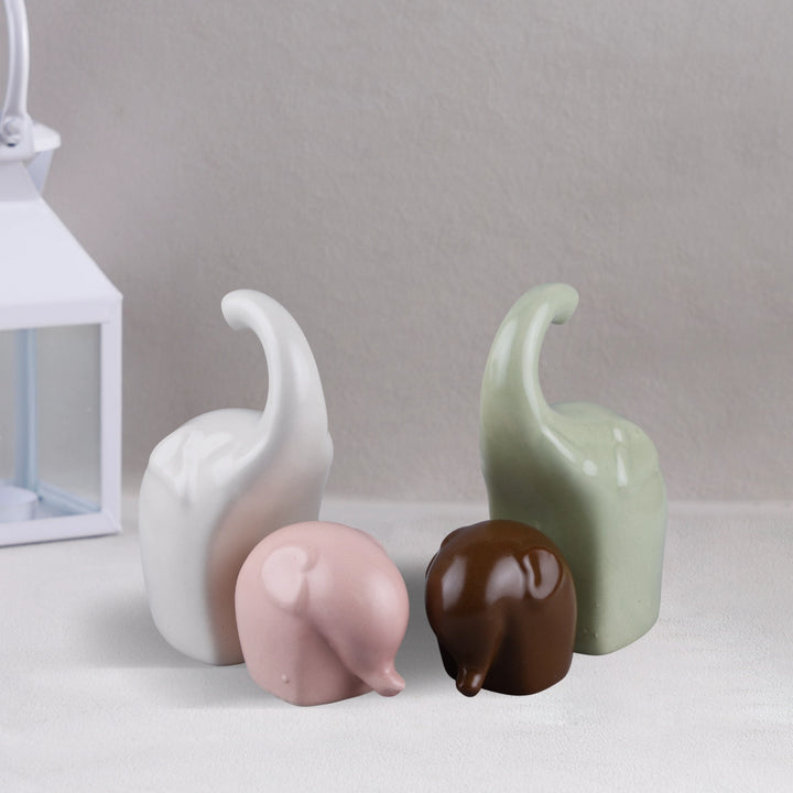 Bring timeless charm and modern elegance into your space with this Handicrafts Home Multicolours Elephant Sculpture Set. Made from high-quality ceramic and finished in a glossy white, green, pink & maroon tone, this stylish Trunkfami brings a symbolic and decorative touch to any room. Whether placed on a shelf, mantel, or coffee table, this set of 4 elephants adds warmth, balance, and aesthetic value to your boho, farmhouse, or minimalist home decor.