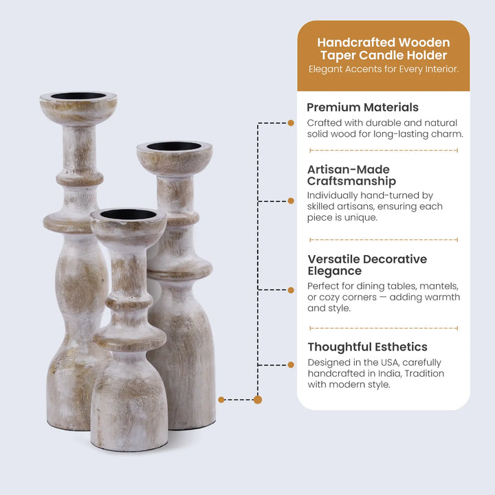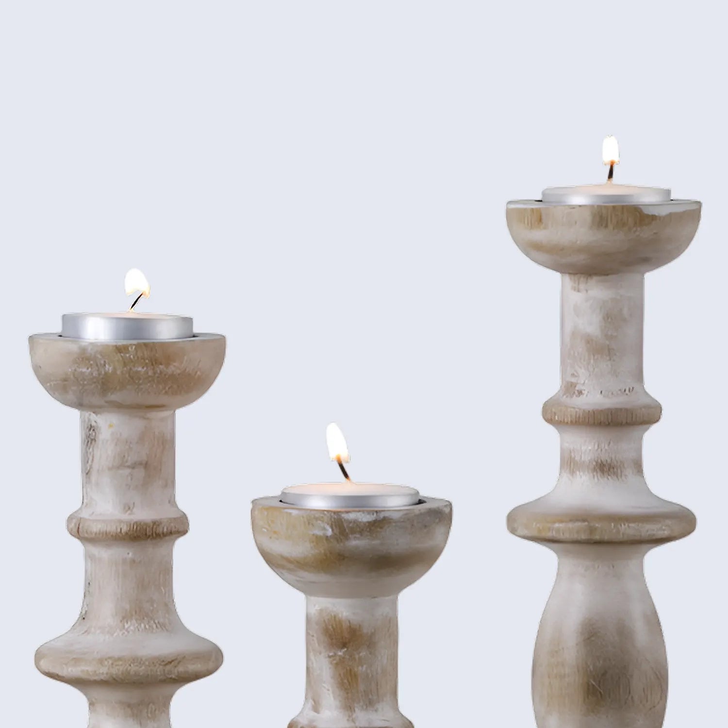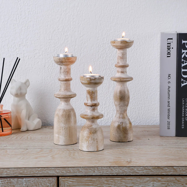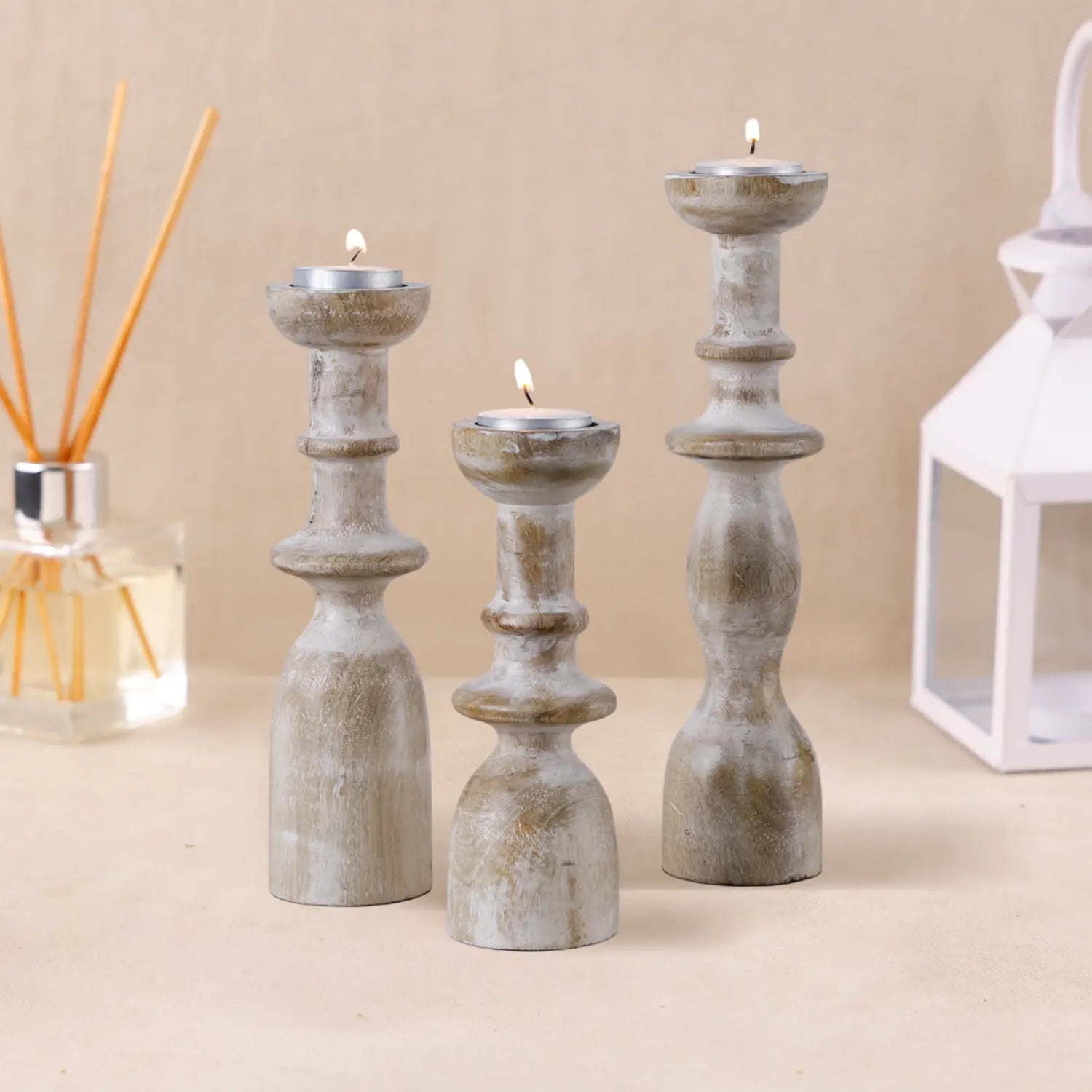 Wooden Pillar Candle Holders – Set of 3 Antique White Decor