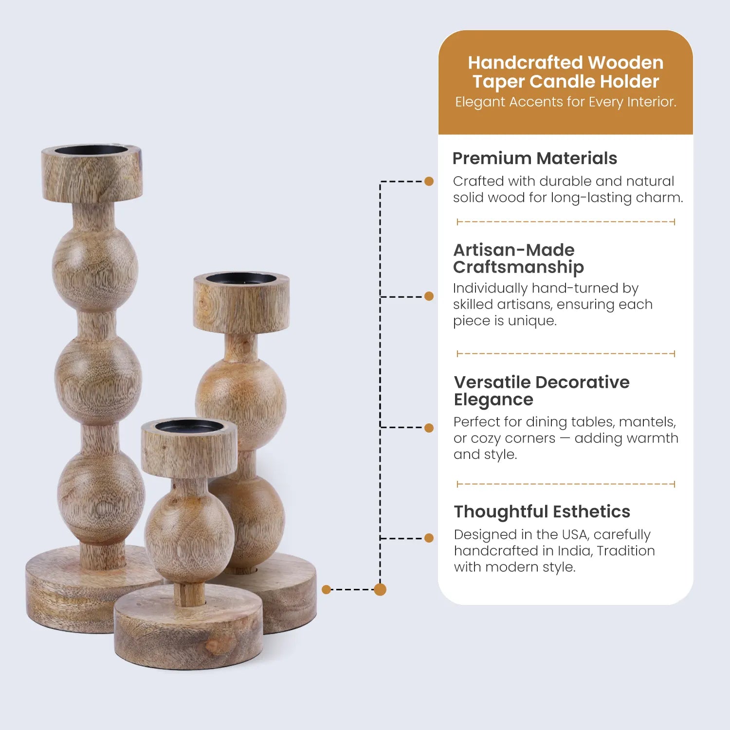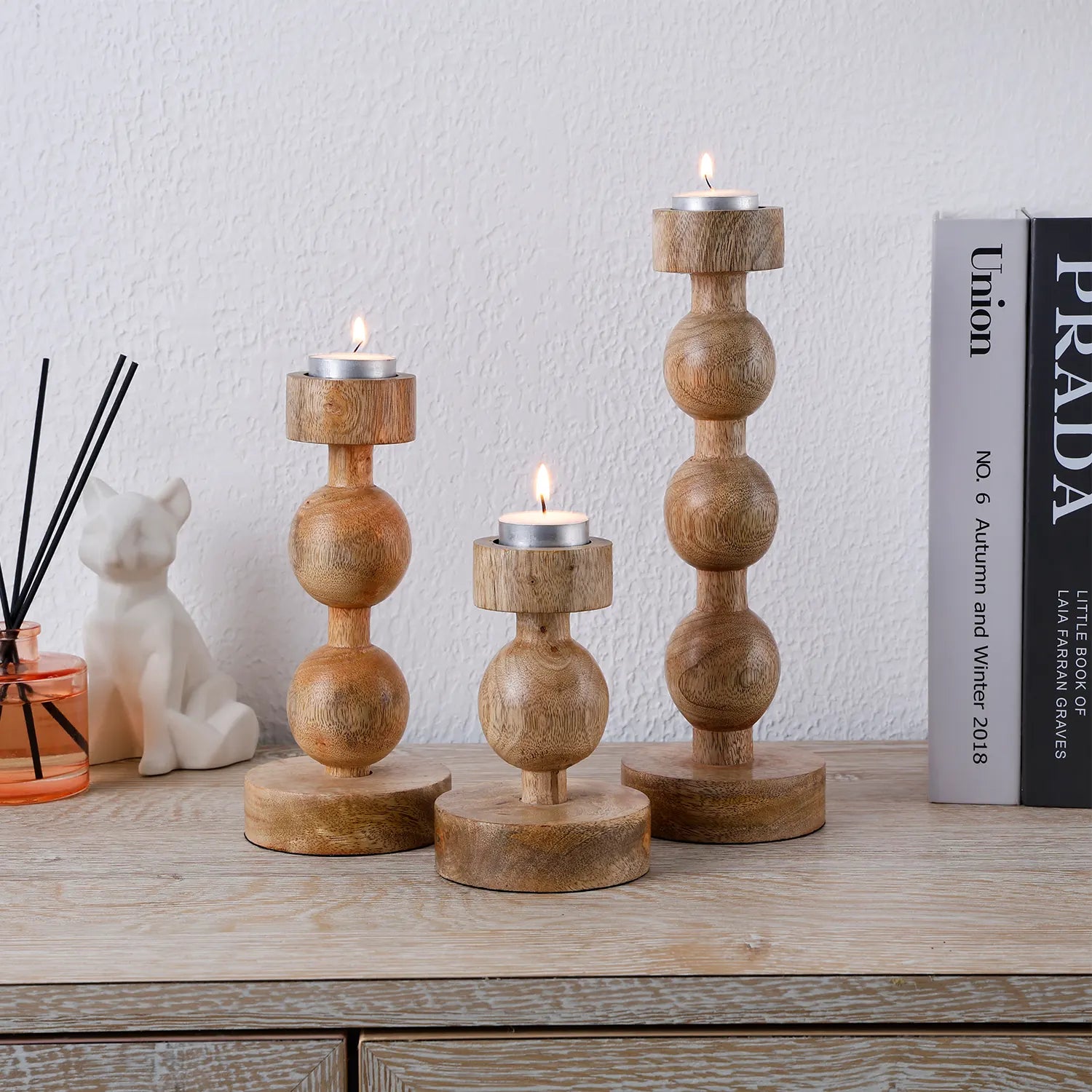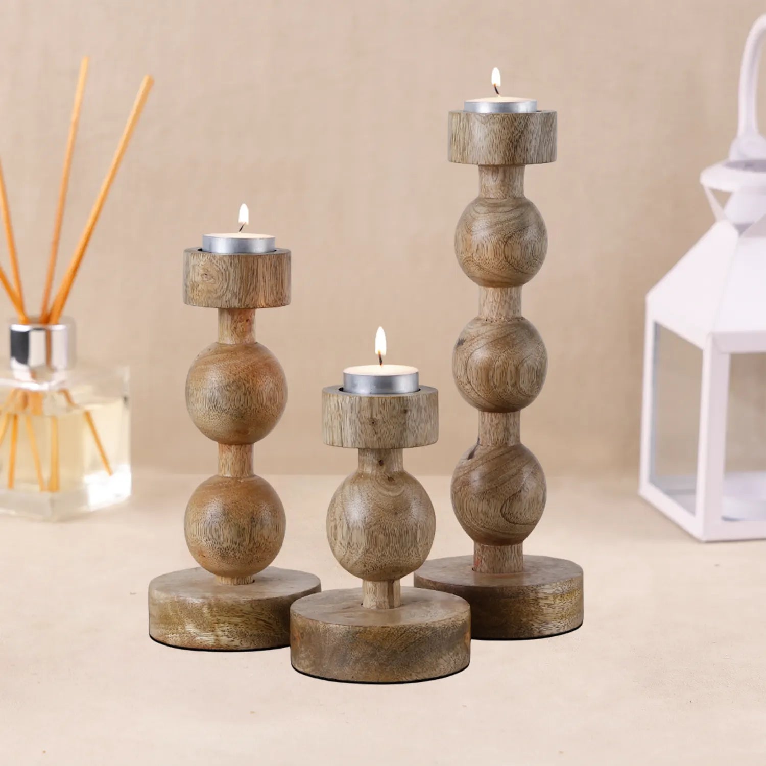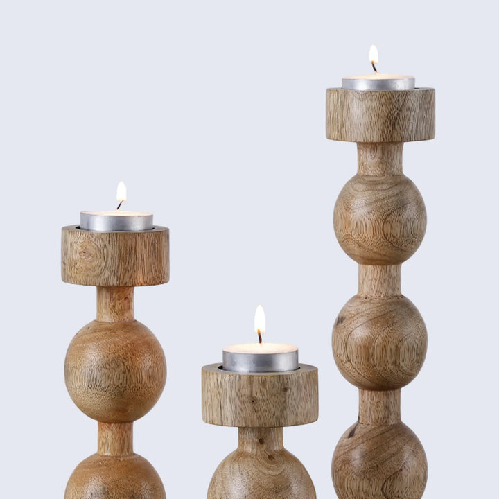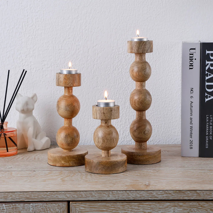 Wooden Pillar Candle Holders – Set of 3 Brown Ball Stand Style