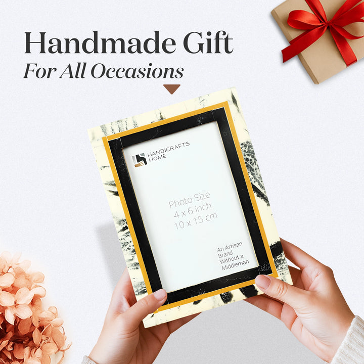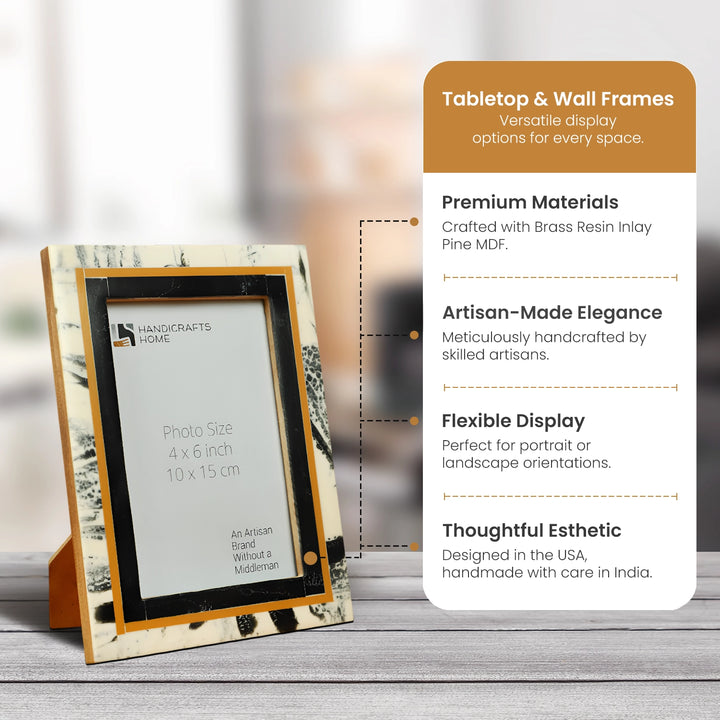 The Abstract Ink Collection Brass & Resin Inlay Black Picture Frame combines contemporary design with artisanal craftsmanship. Handcrafted using resin and brass inlay tiles arranged in an abstract ink-inspired pattern in deep black tones, this frame adds a sophisticated and striking touch to living rooms, bedrooms, offices, gallery walls, and décor displays. The contrasting textures and subtle variations make each frame unique and heirloom-quality, perfect for showcasing photographs, artwork, and decorative prints.