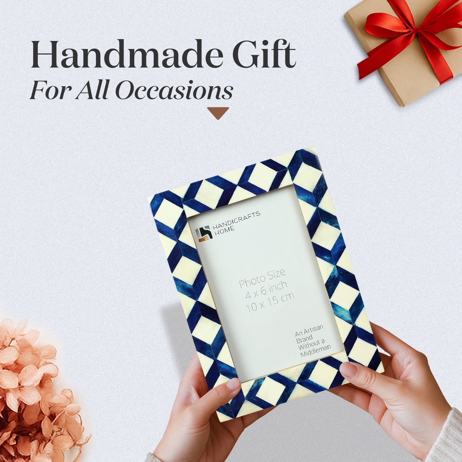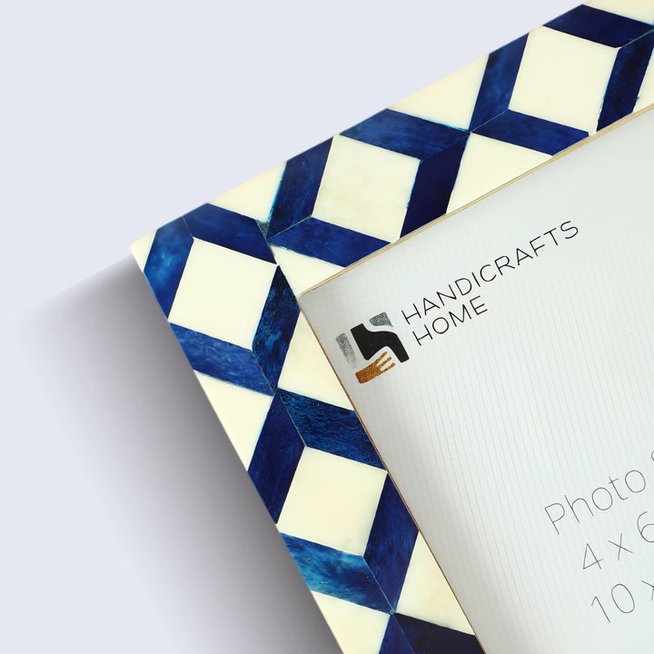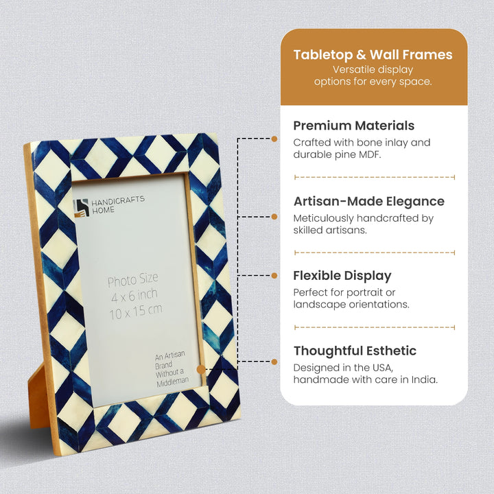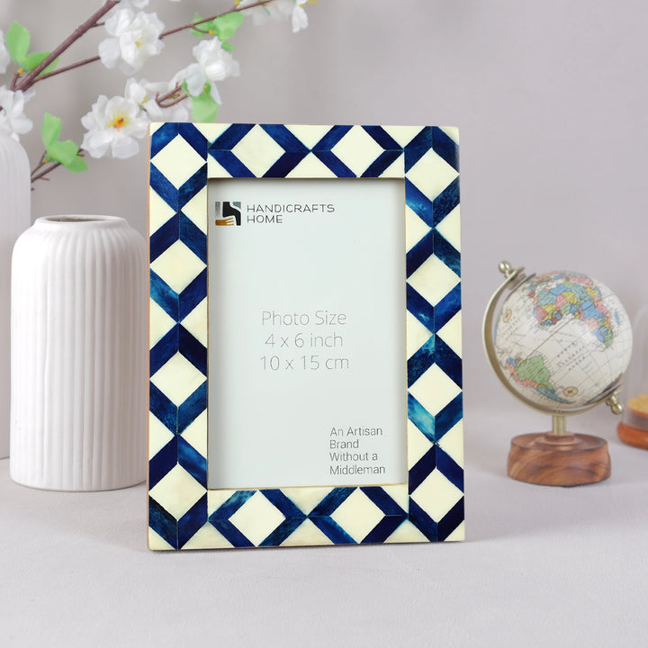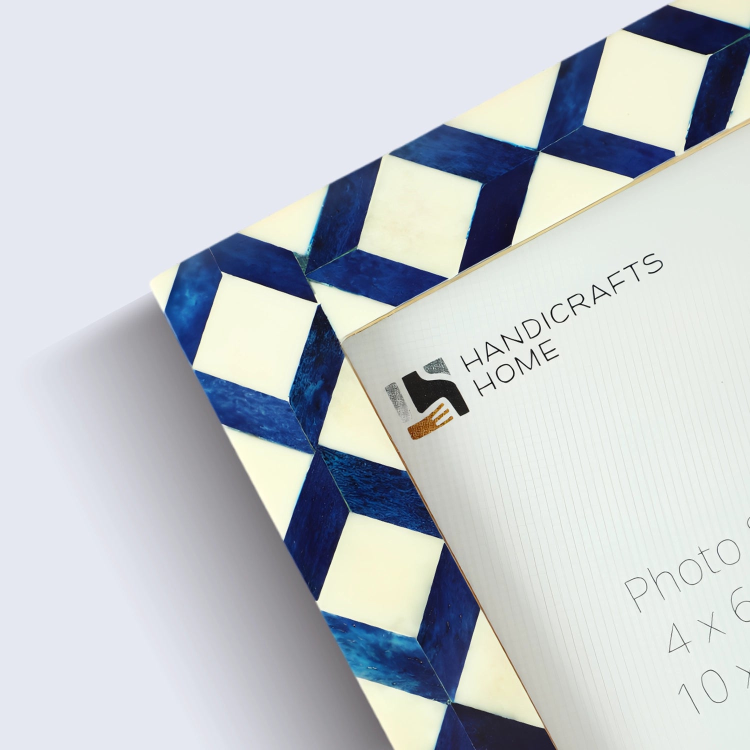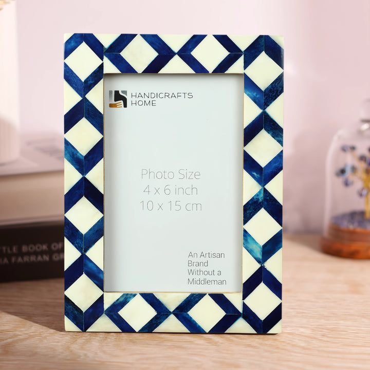 Add a touch of artisanal charm to your home with the Handicrafts Home Picture Frame, crafted in a classic blue & white diamond tile pattern. Handcrafted with precision, the frame features authentic bone inlay set on sturdy pine MDF, offering a unique blend of durability and design. This elegant photo frame brings timeless sophistication to living room walls, side tables, or bedroom shelves, making it a standout decorative piece in any interior.