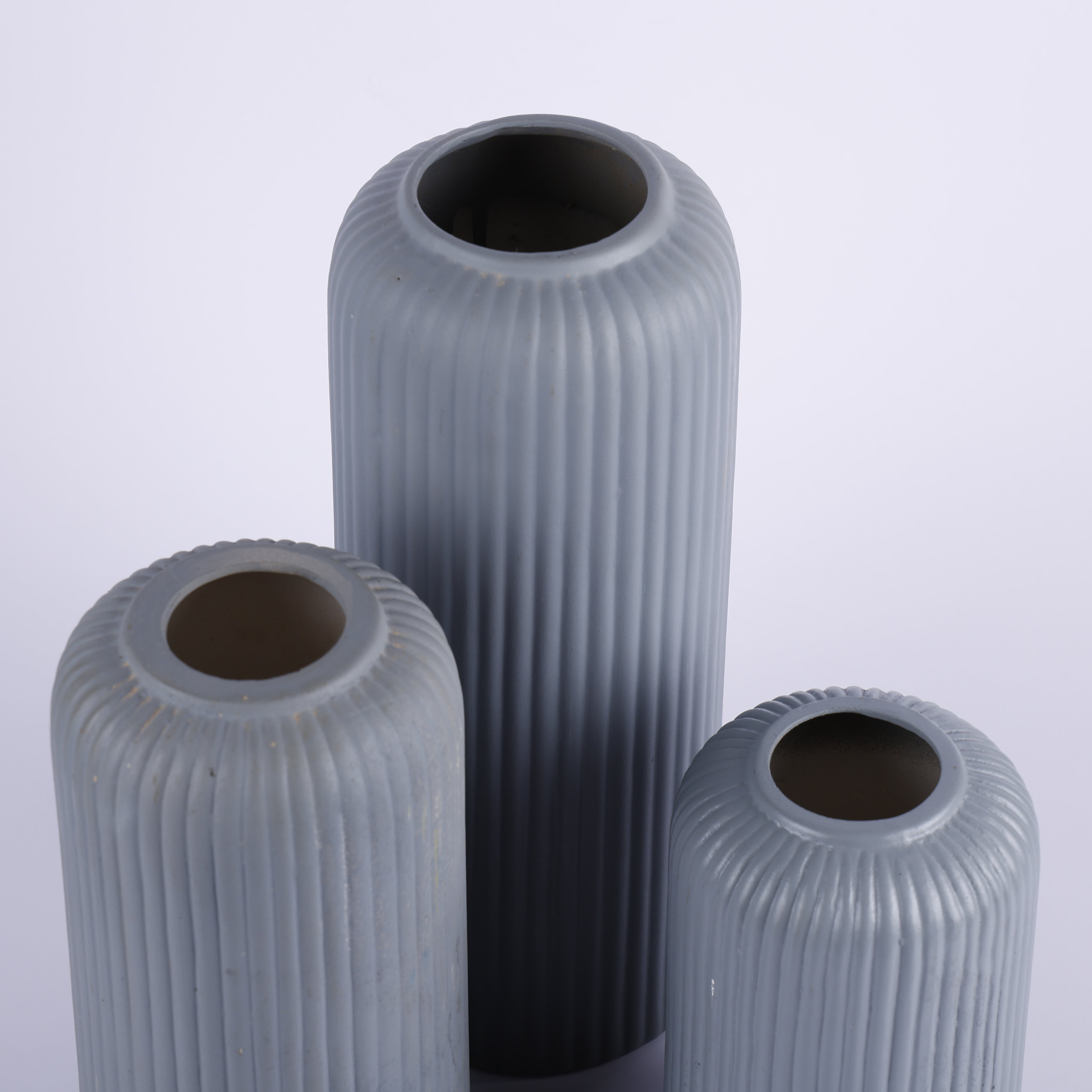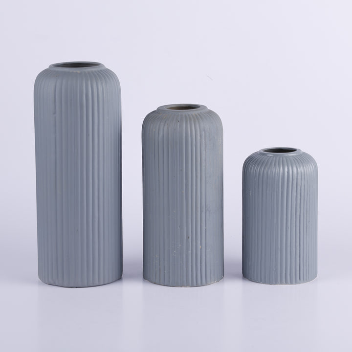 Transform your space with the calming hues of this grey ceramic vase trio from Handicrafts Home. Each vase features a vertically stripped pattern with matte finish for a natural tactile feel and timeless style. Measuring 3.5x6.25”, 4x8.5", and 4x10.5", this set is ideal for layered decor—whether styled together or separately across your home.