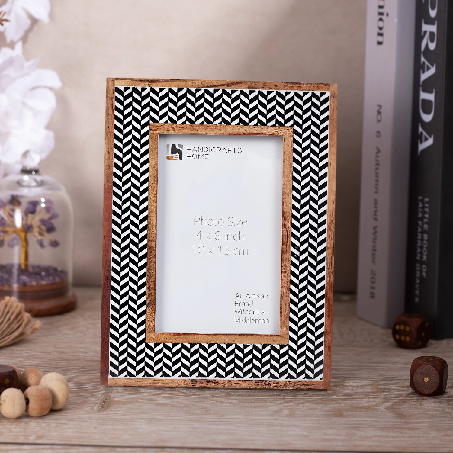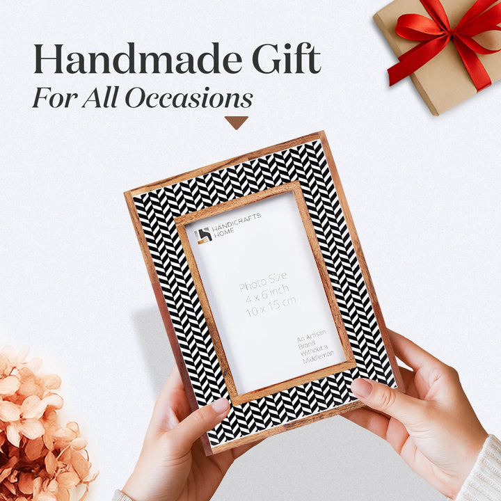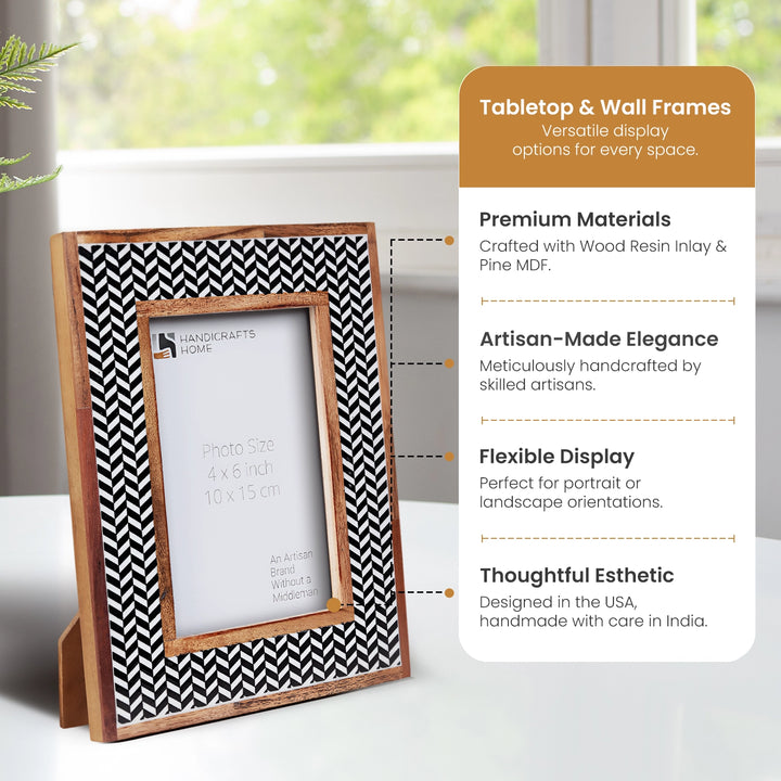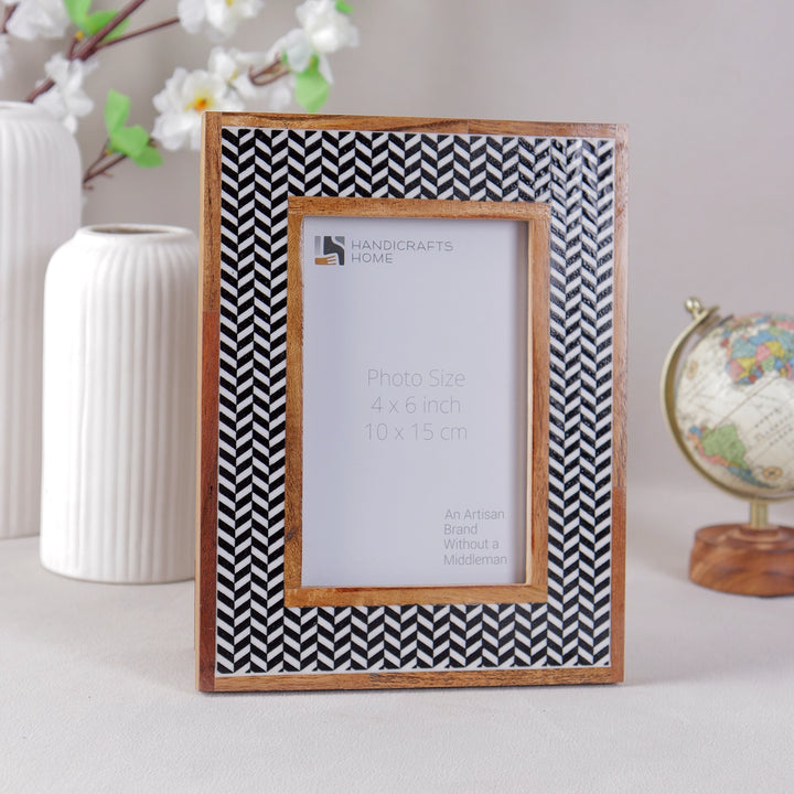 Chevron Herringbone Resin Inlay Picture Frame with Wooden Border, Black & White