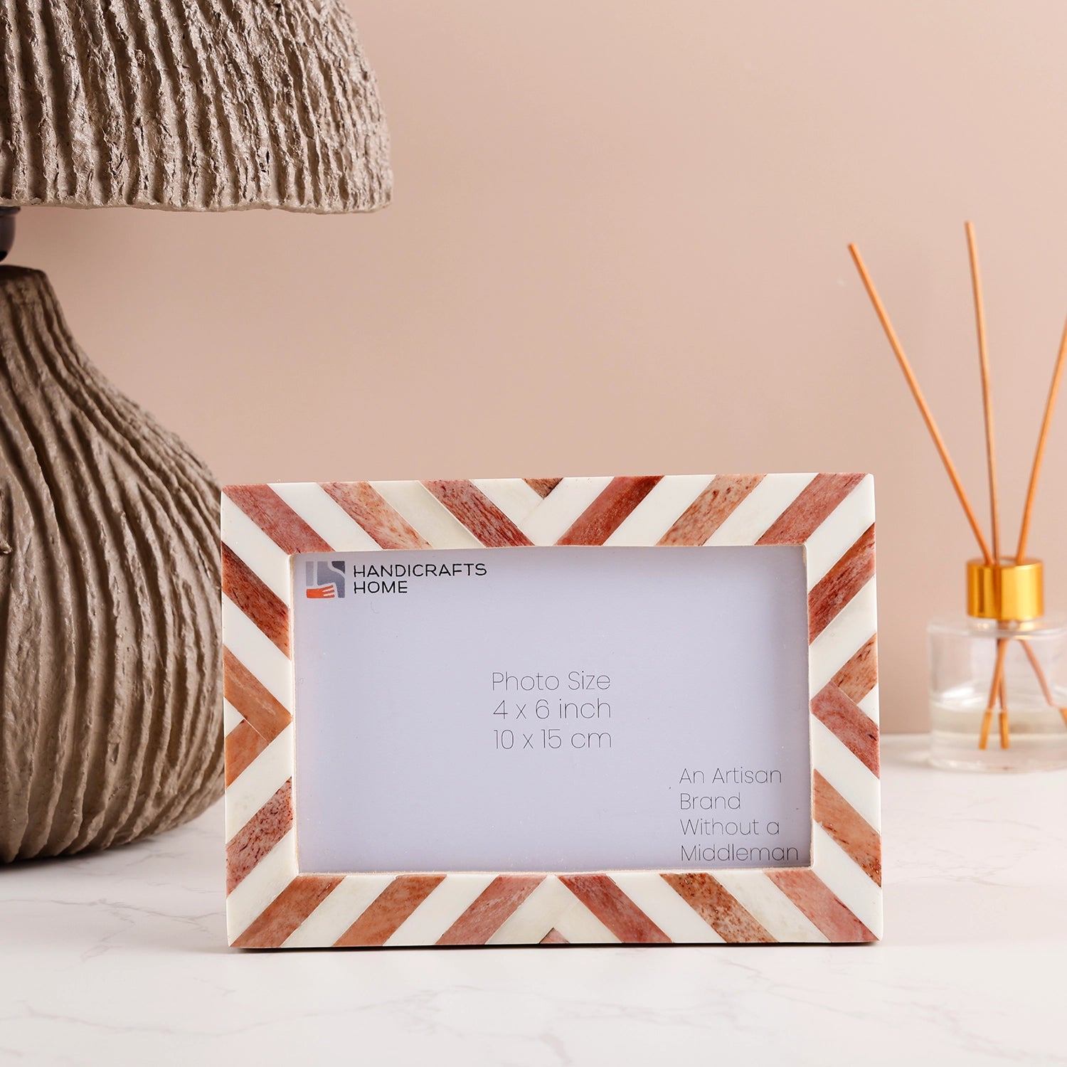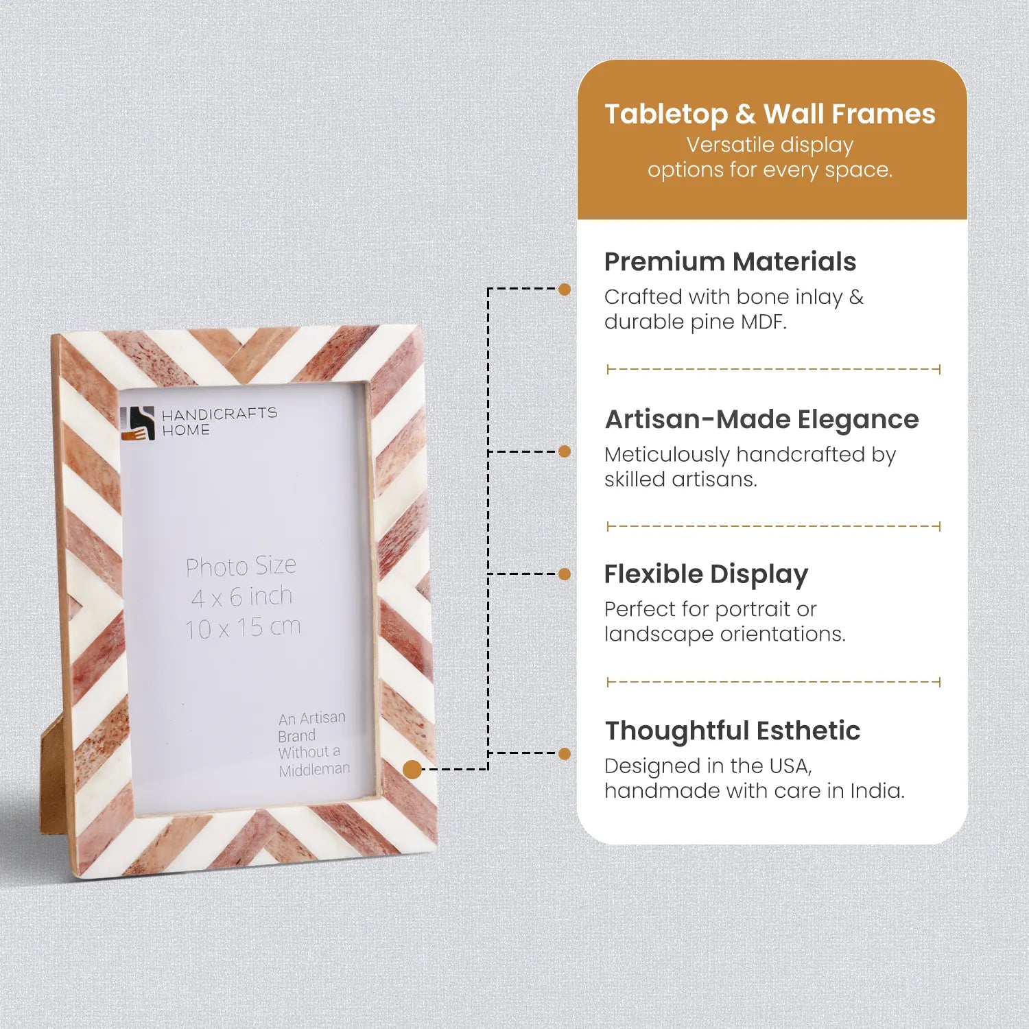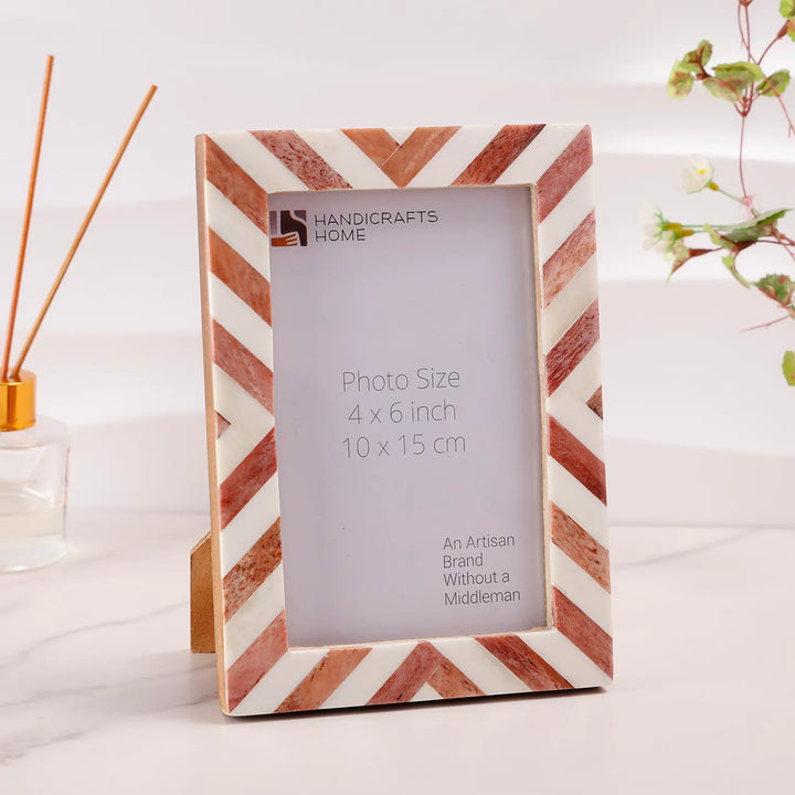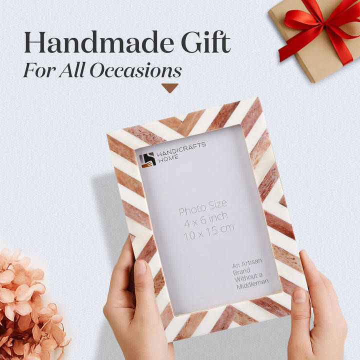 The Chevron Pattern Collection Brown Bone Inlay Picture Frames in 4 Sizes bring warm, handcrafted elegance and timeless charm to your home. Each frame features hand-cut Bone Inlay tiles arranged in a bold chevron pattern, creating a visually striking design. The rich brown tones complement modern, boho, farmhouse, rustic, and classic interiors. Designed for both wall and tabletop display, these frames enhance shelves, consoles, desks, mantels, entryways, bedside tables, and gallery walls.