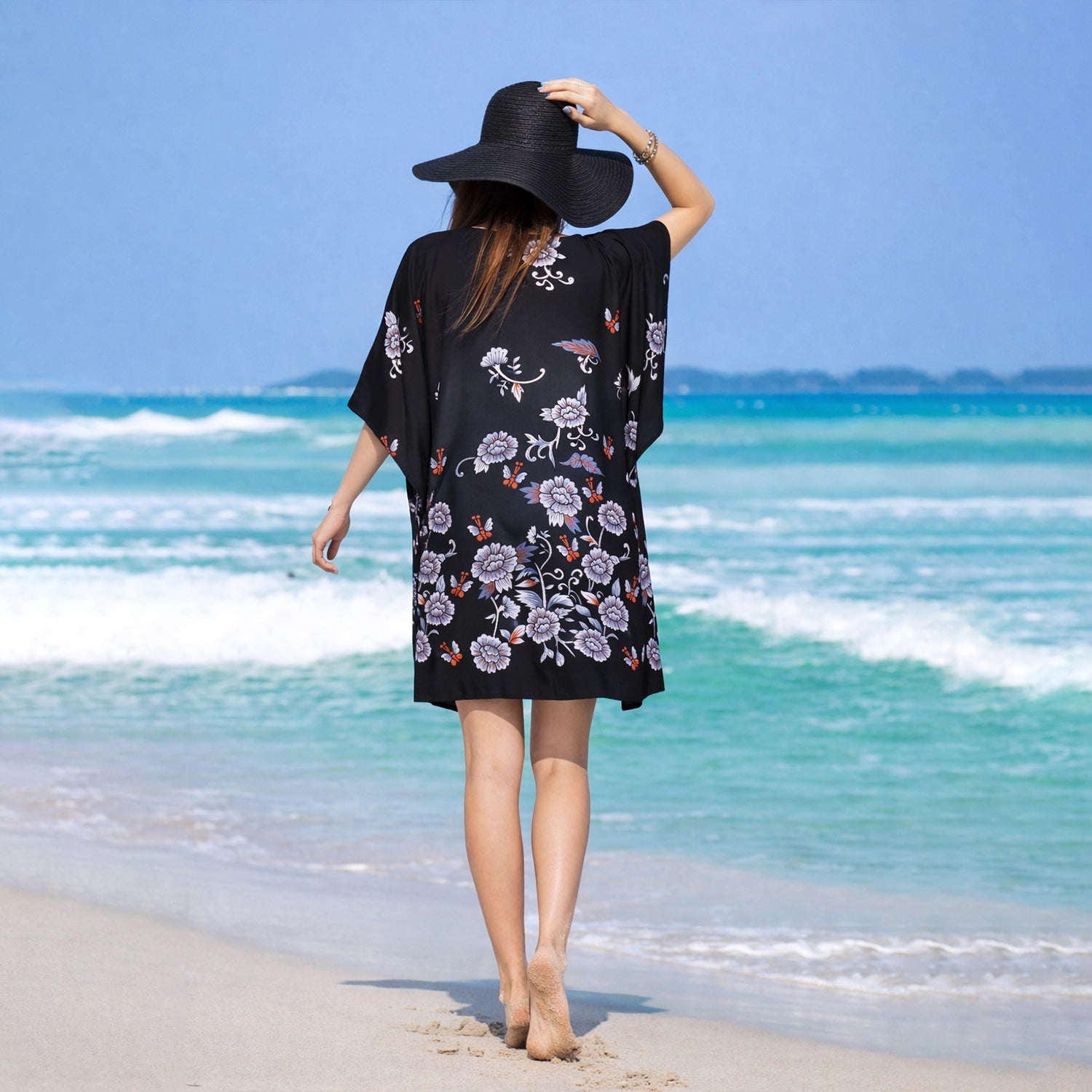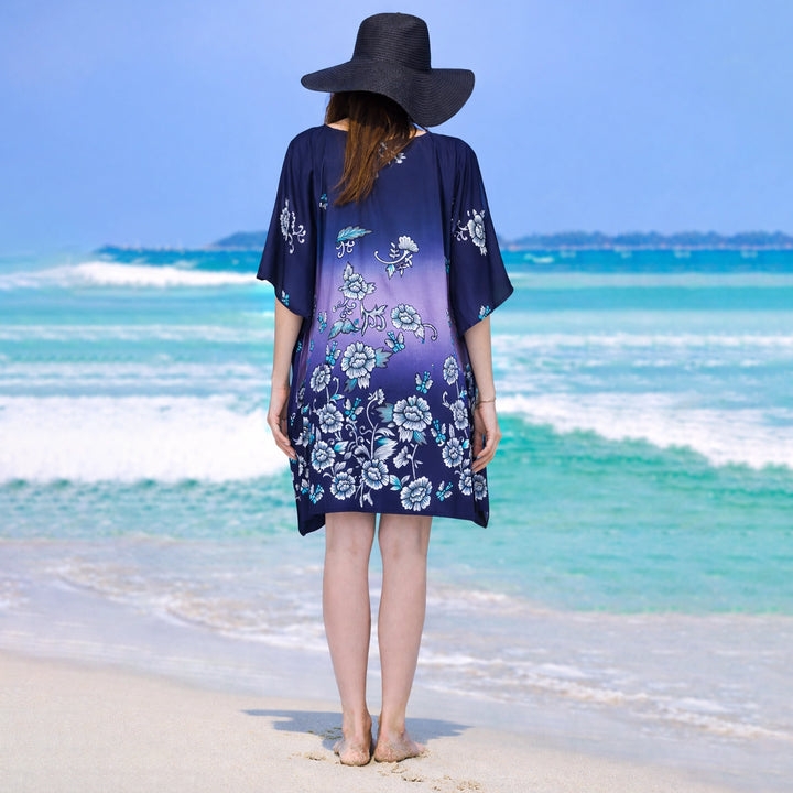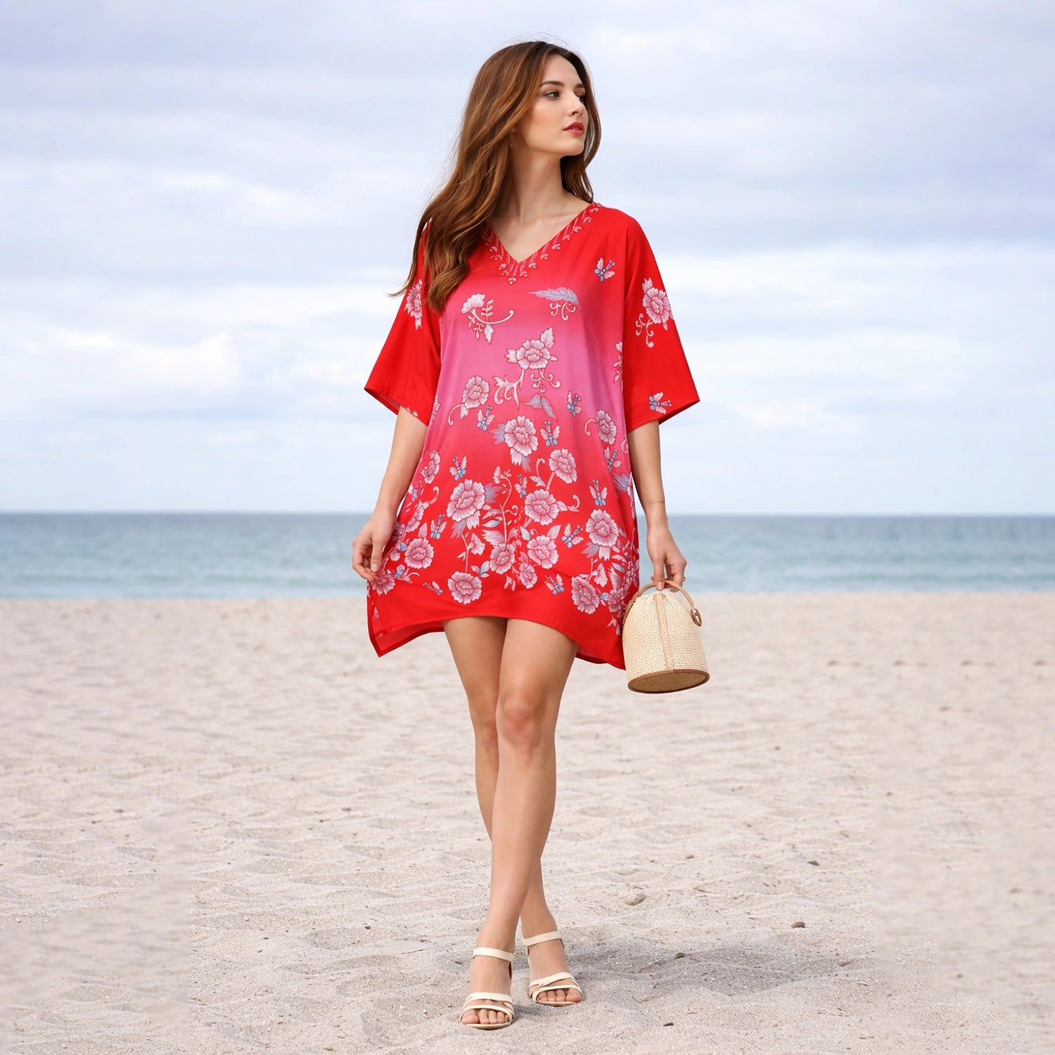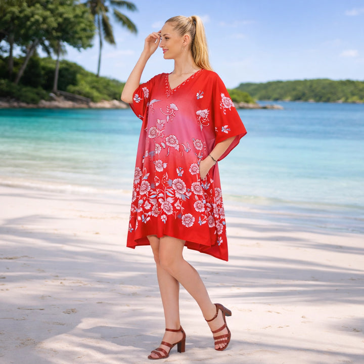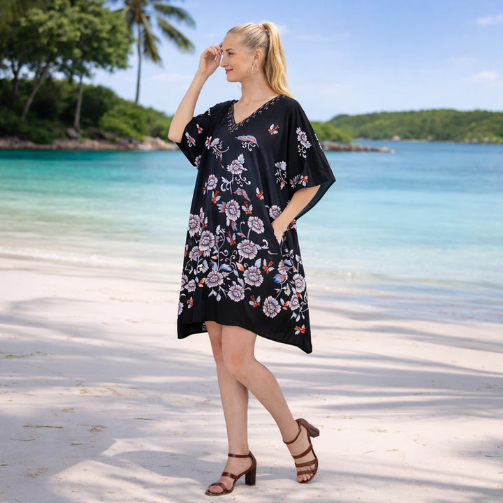 Floral Print Short Polyester Kaftan Dress with V Neck & Pockets