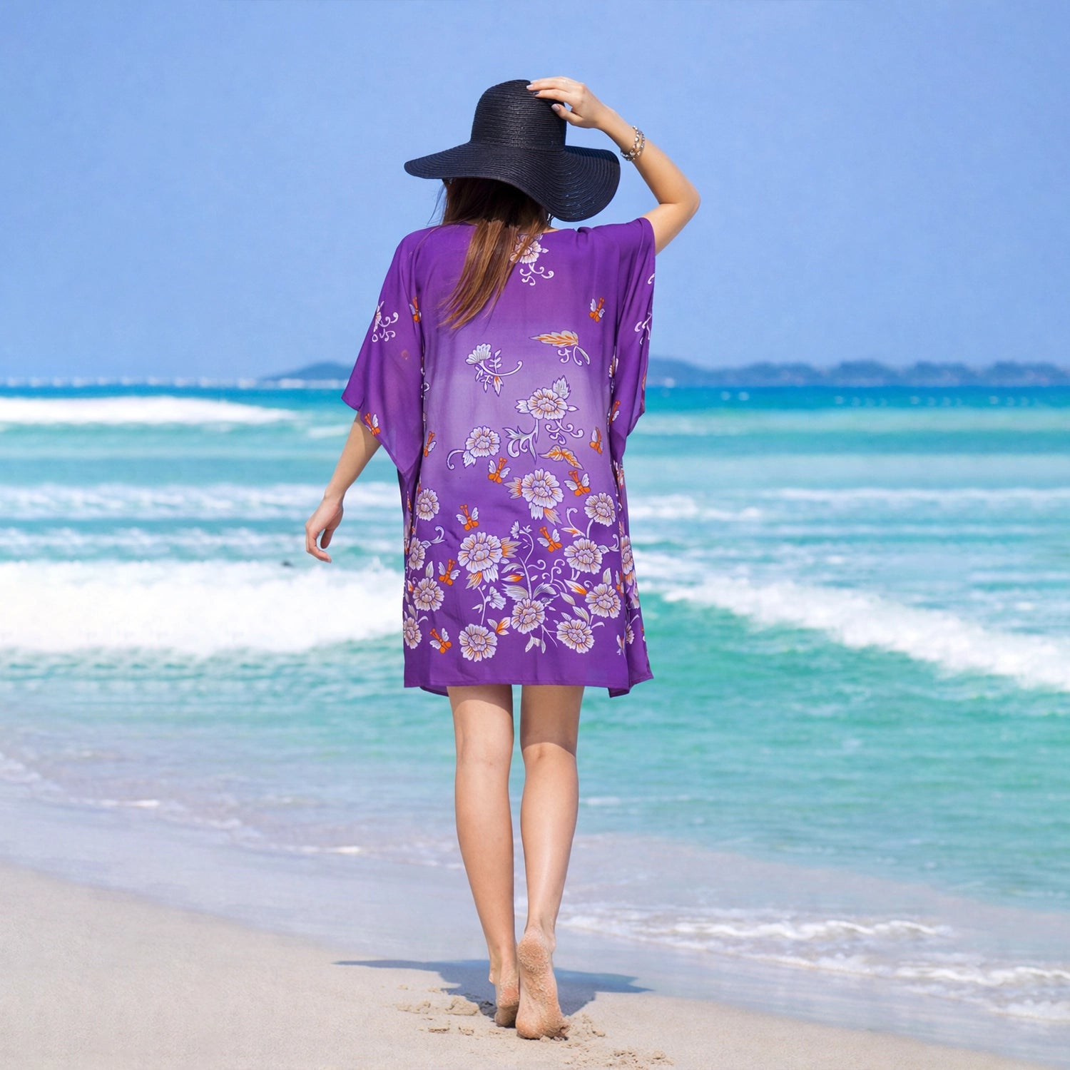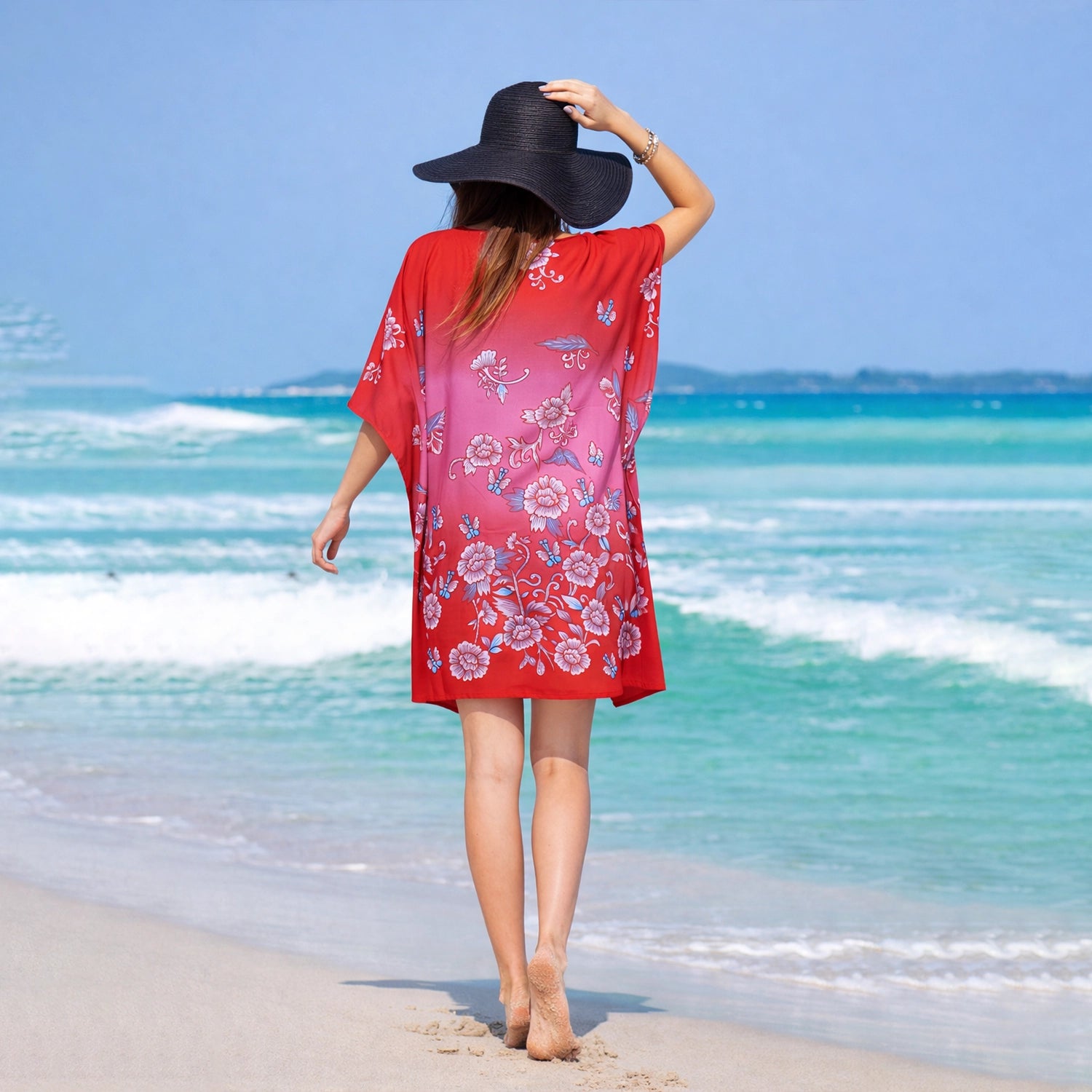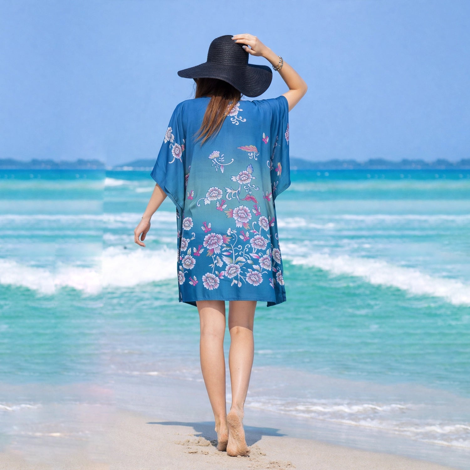 Floral Print Short Polyester Kaftan Dress with V Neck & Pockets
