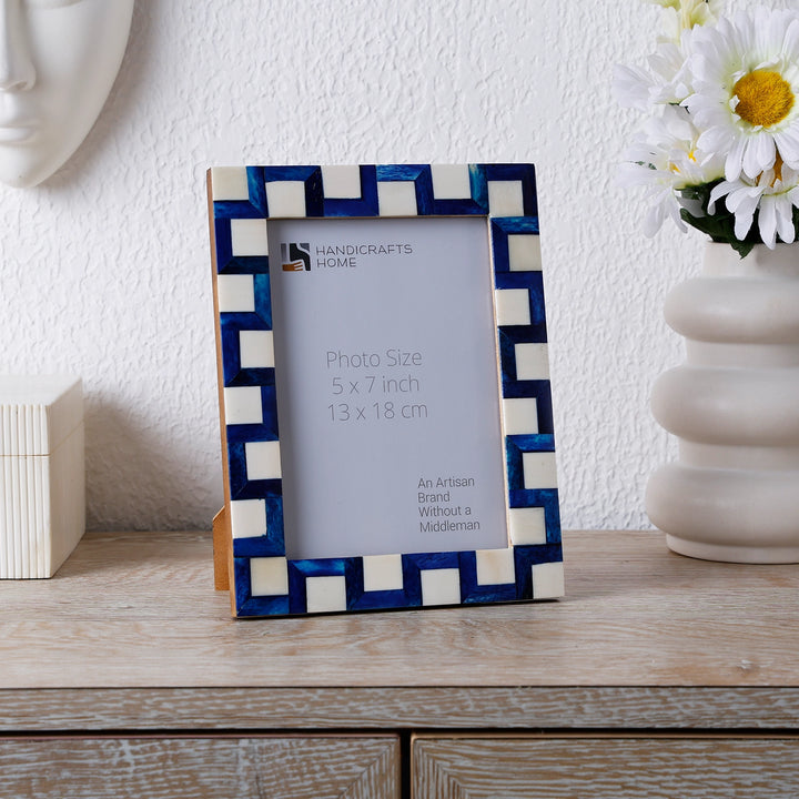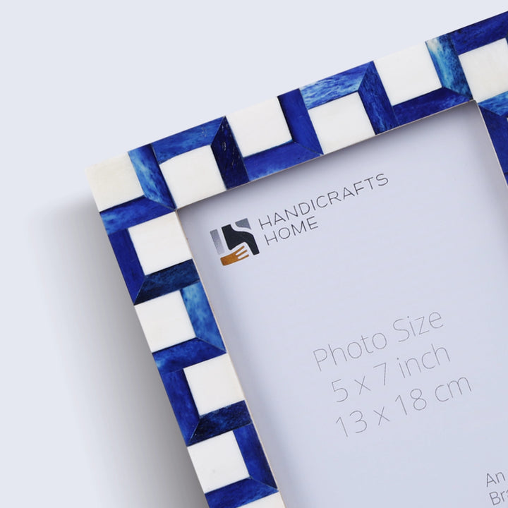 Made by skilled artisans, each frame features a geometric Escher cube pattern using bone inlay techniques. The detailed craftsmanship and earthy blue and white colour palette make this a perfect match for rustic, farmhouse, modern, or boho decor styles.