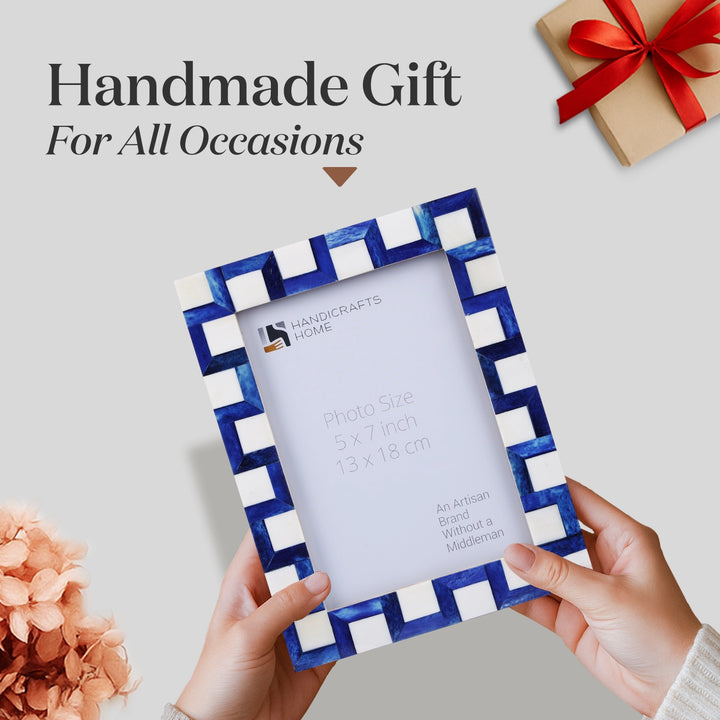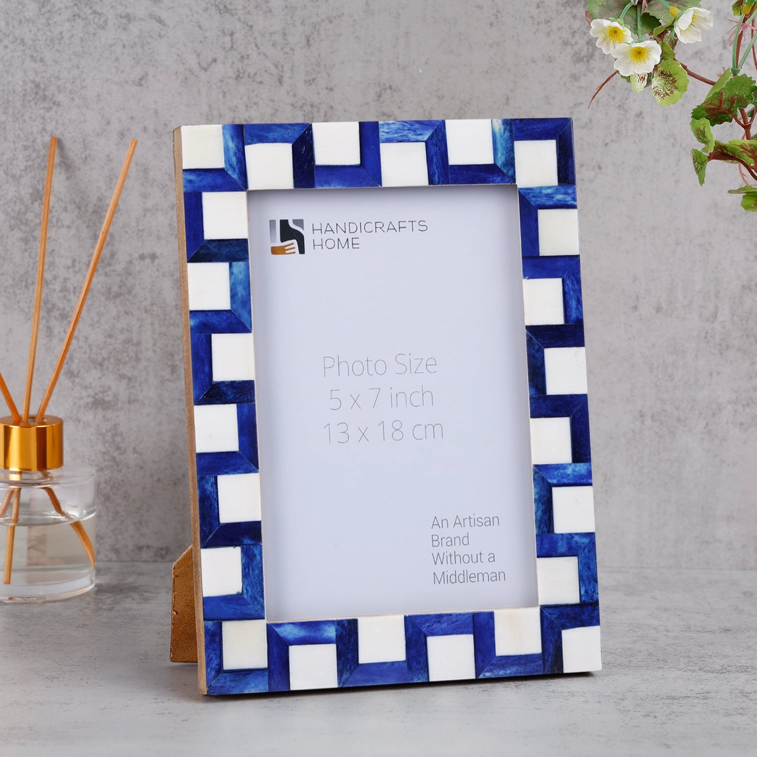 Bring warmth and texture to your décor with the Handicrafts Home Blue & White Bone Inlay Photo Frame, available in 4x6 and 5x7 sizes. Expertly handcrafted by skilled artisans, this elegant frame features a detailed Escher cube design, made from ethically sourced bone. Its bold geometric pattern and earthy tones create a striking visual statement that blends beautifully into rustic, bohemian, modern, or vintage-style interiors.
