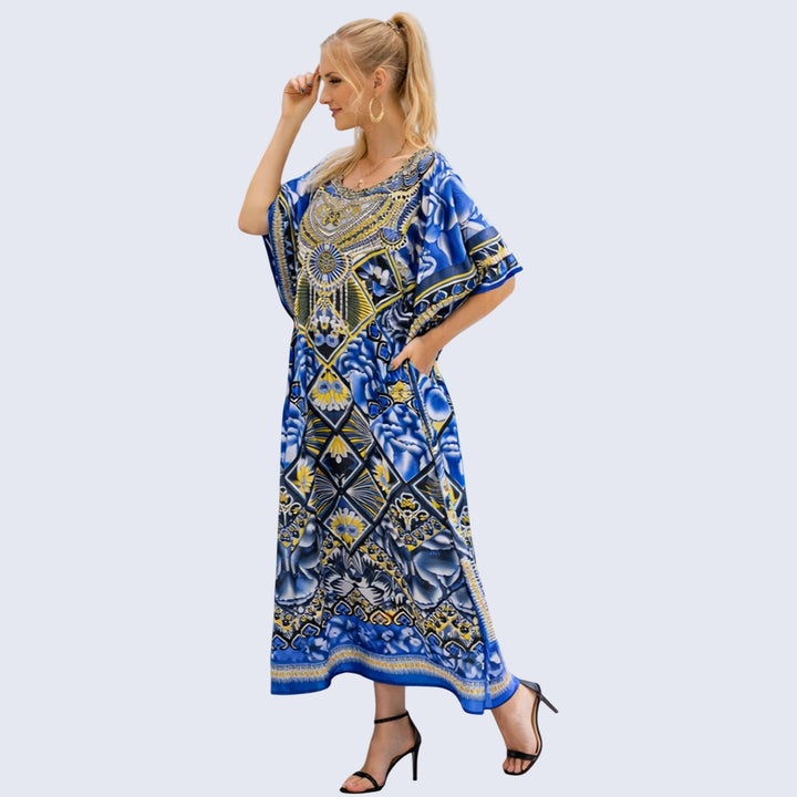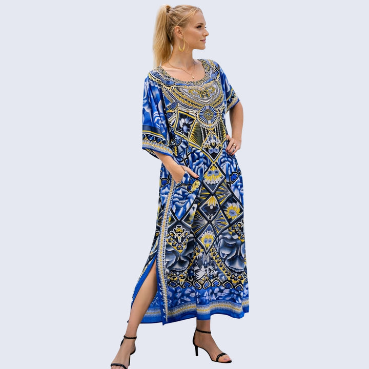 Ethnic Print Polyester Kaftan Dress with V Neck & Side Slits
