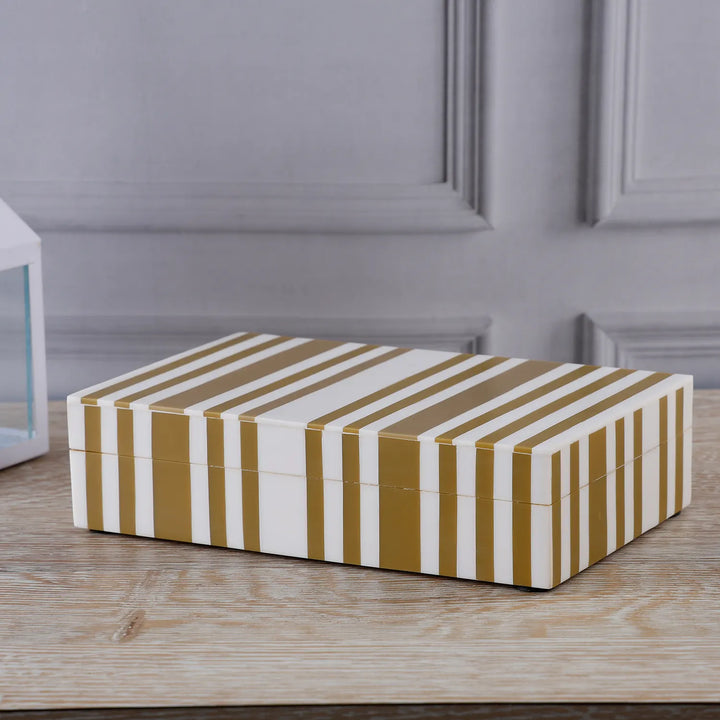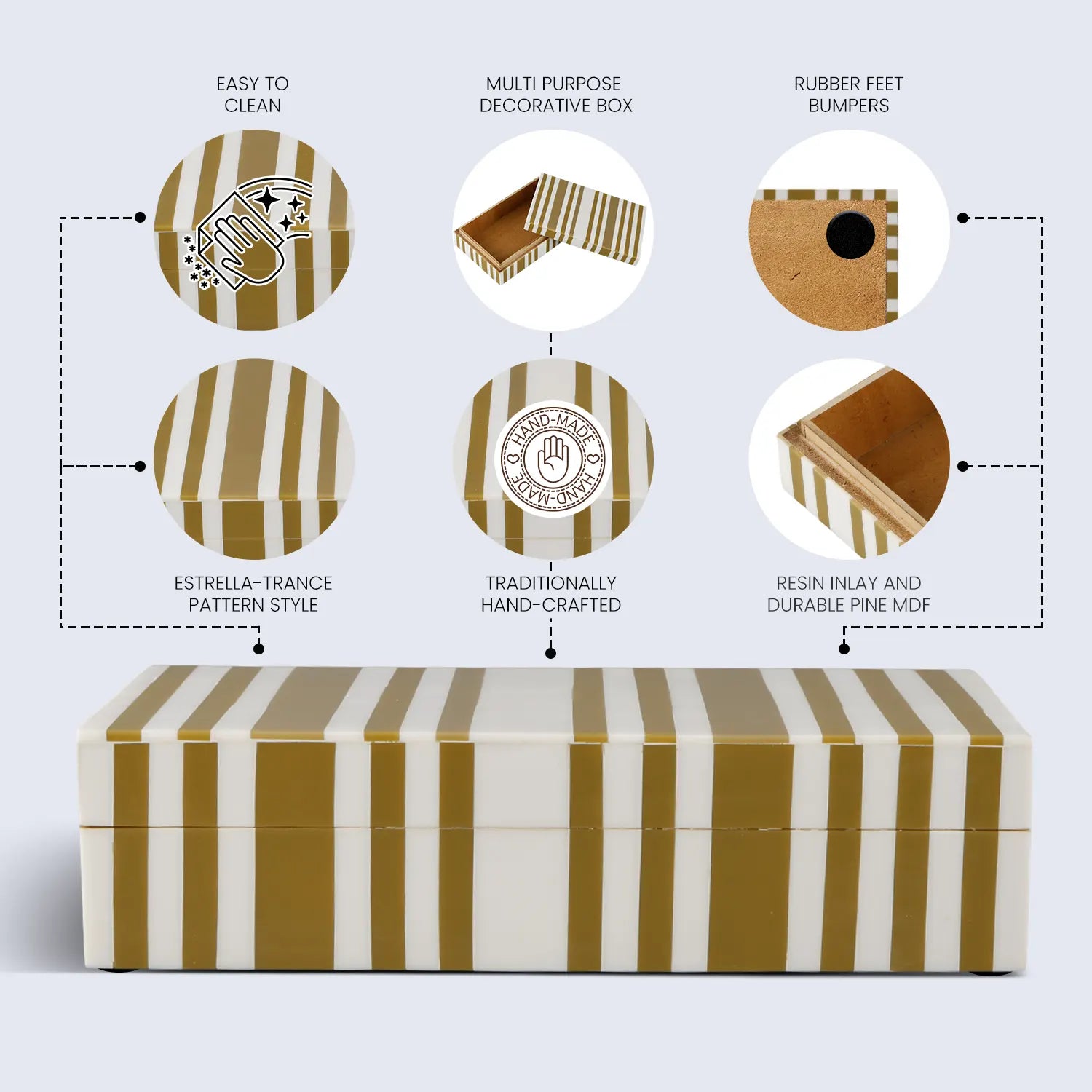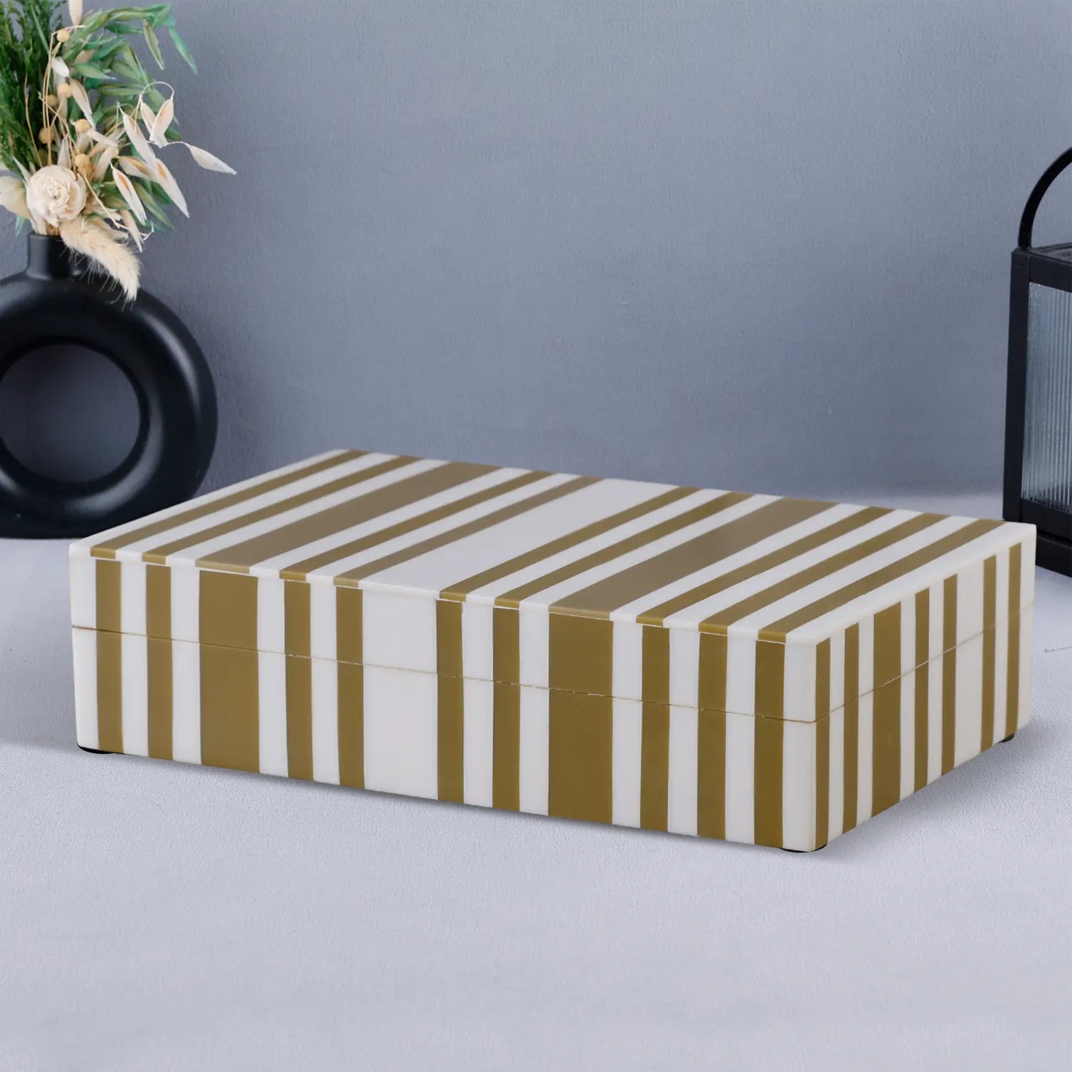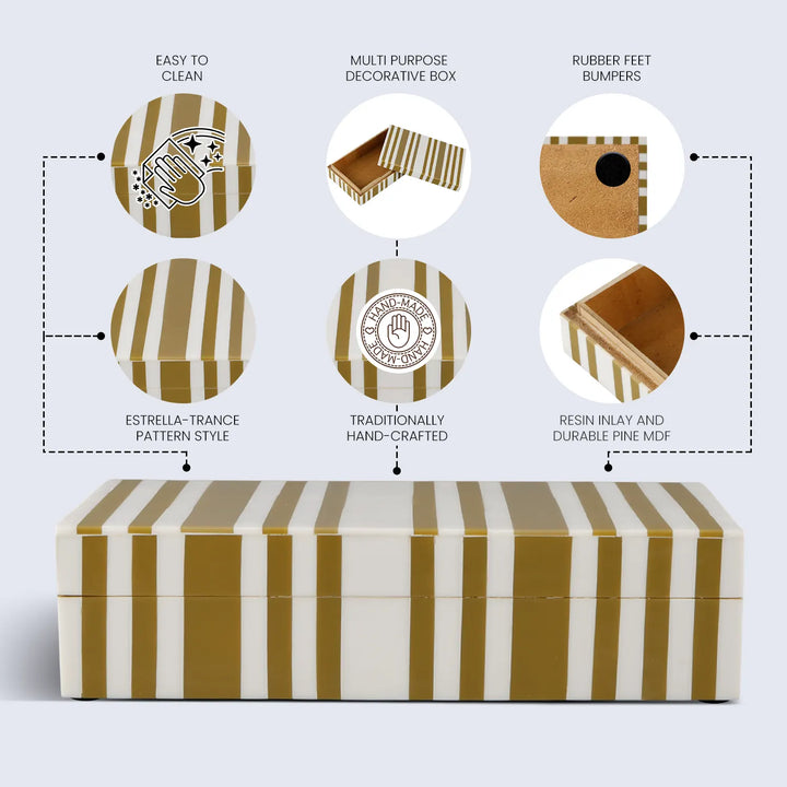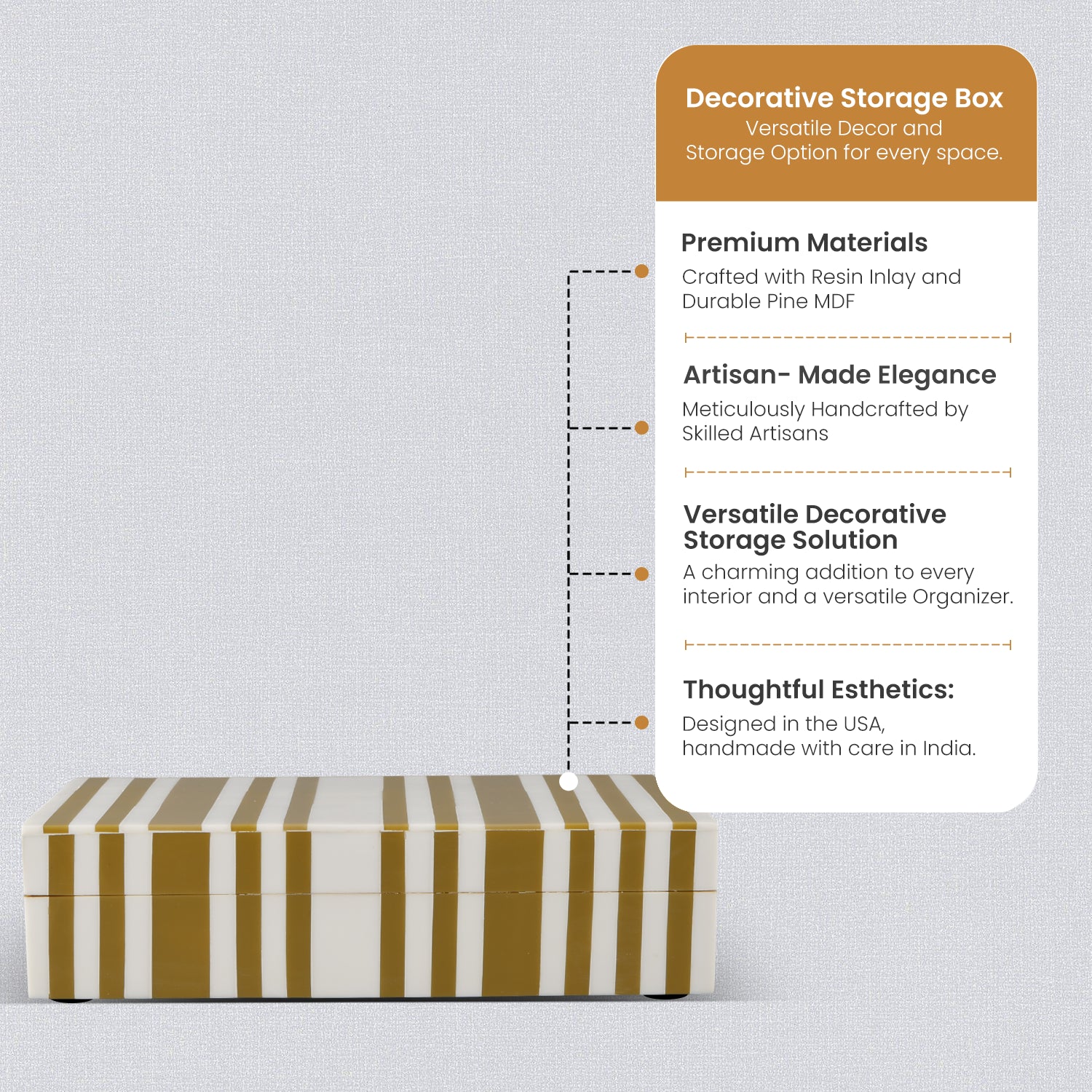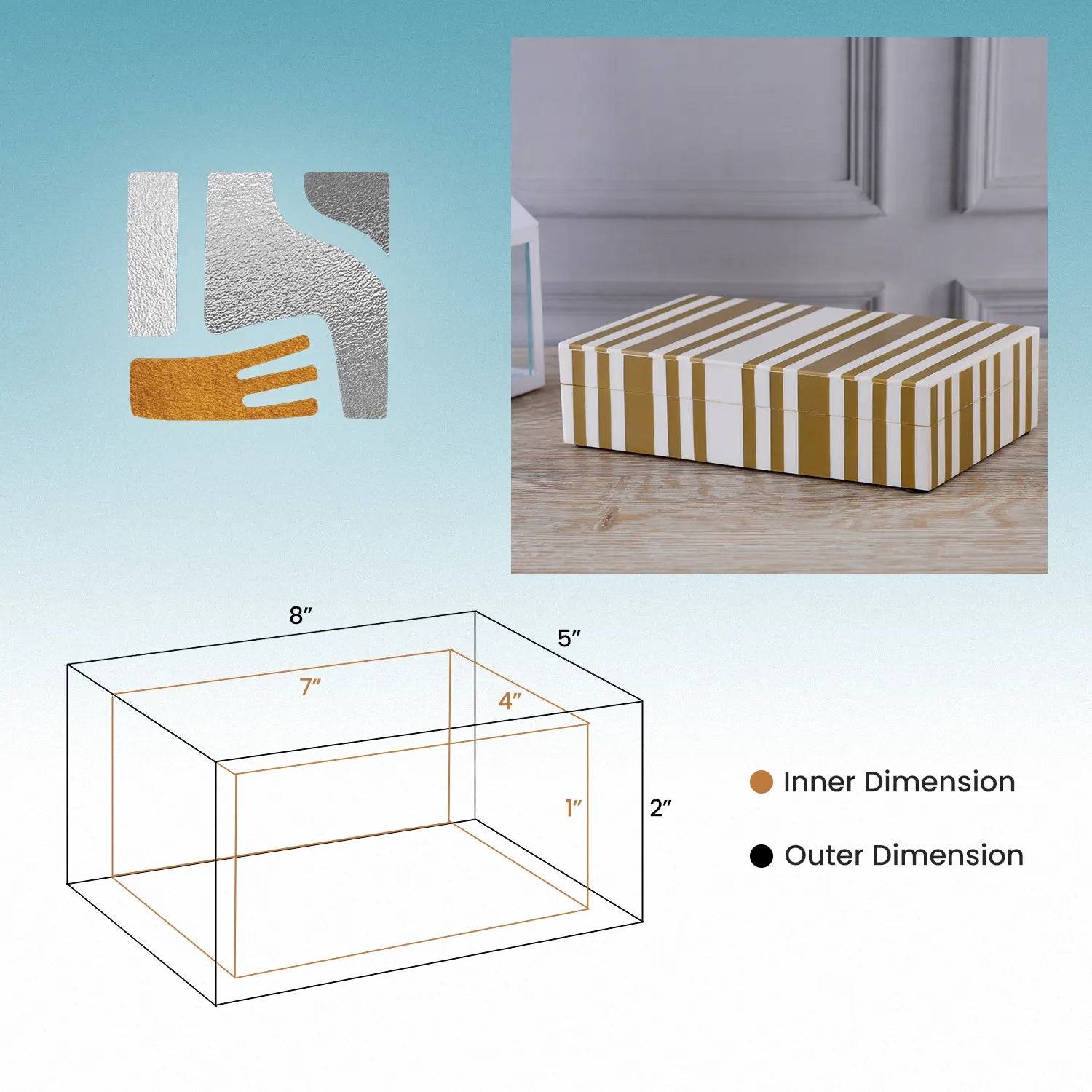 Bring timeless elegance into your home with this beautifully handcrafted decorative storage box from Handicrafts Home. Showcasing a sophisticated Ivory Stripped pattern in chic gold and white, this artisan-made box blends modern, boho, and farmhouse styles effortlessly. Whether you use it for storing jewelry, keepsakes, or small treasures, it offers a perfect balance of functionality and style. Ideal as a thoughtful gift or a stylish accent to elevate any room.