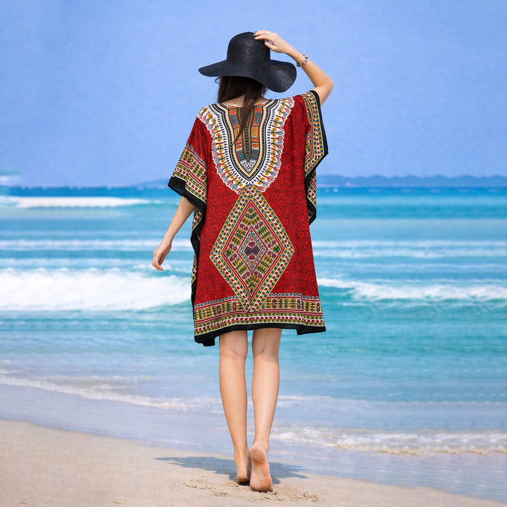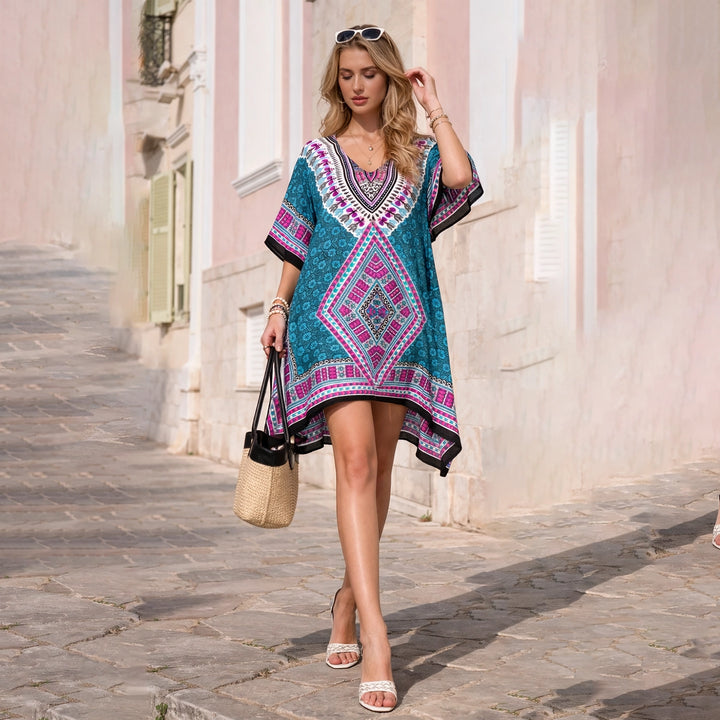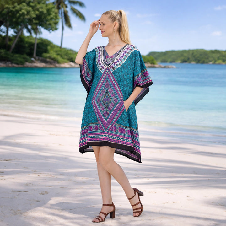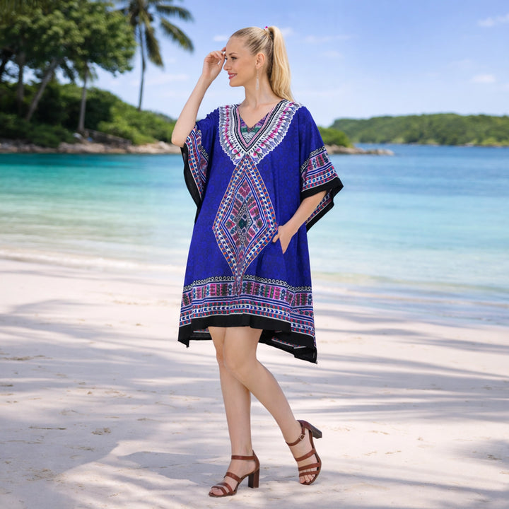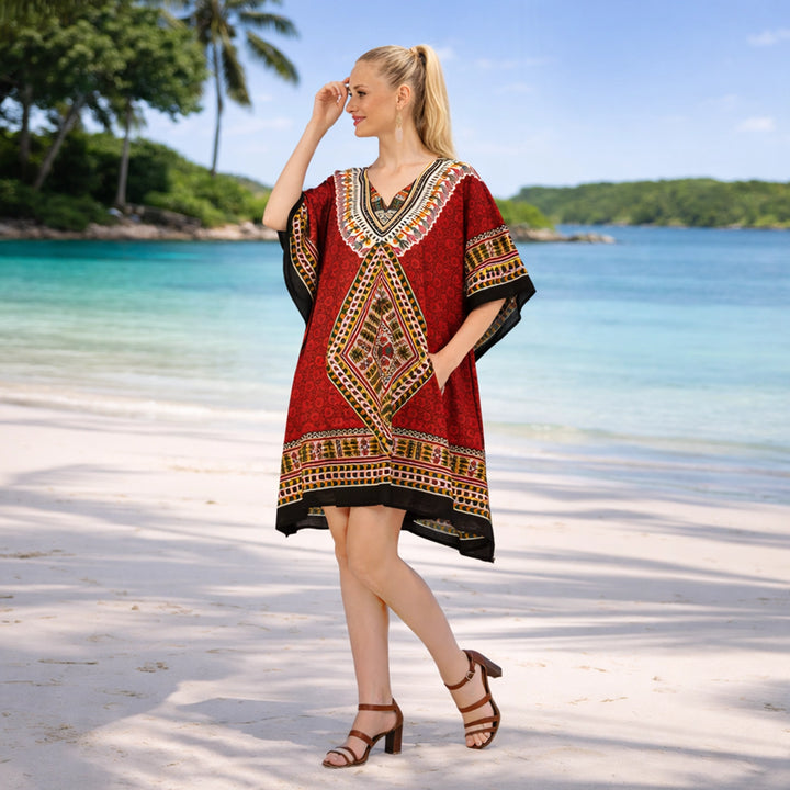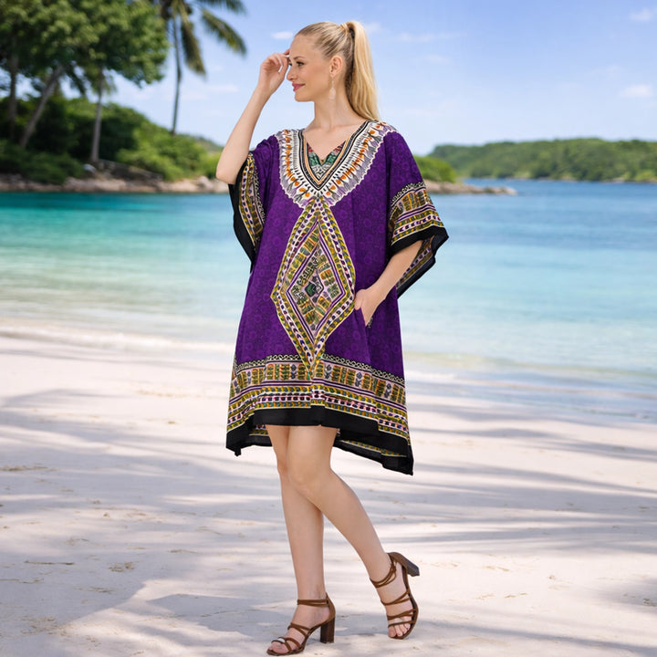 Tribal Geometric Dashiki Print Short Polyester Kaftan Dress with V Neck & Pockets