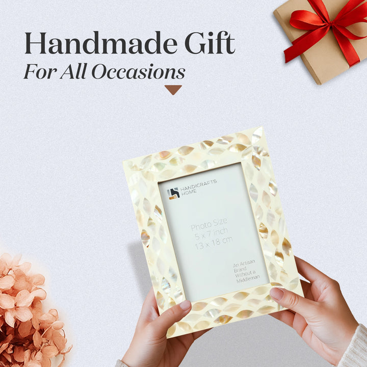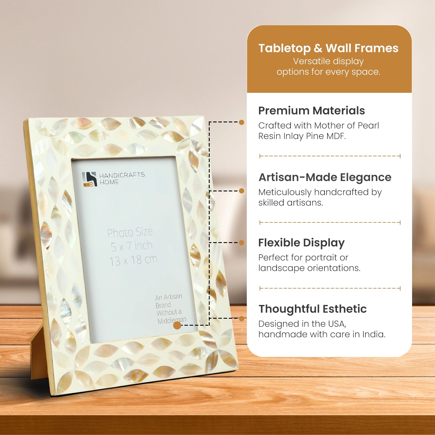 Add timeless elegance to your space with the Handicrafts Home 5x7 photo frame, meticulously handcrafted with a stunning Avant Floral pattern in rich navy blue and luminous pearl white. Featuring a refined blend of mother-of-pearl inlay and smooth resin detailing on a durable Pine MDF base, this luxury photo frame reflects artistic craftsmanship and modern charm.