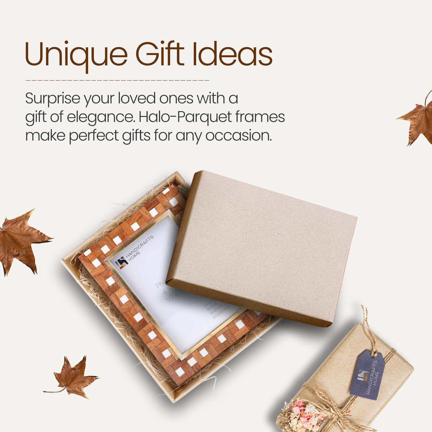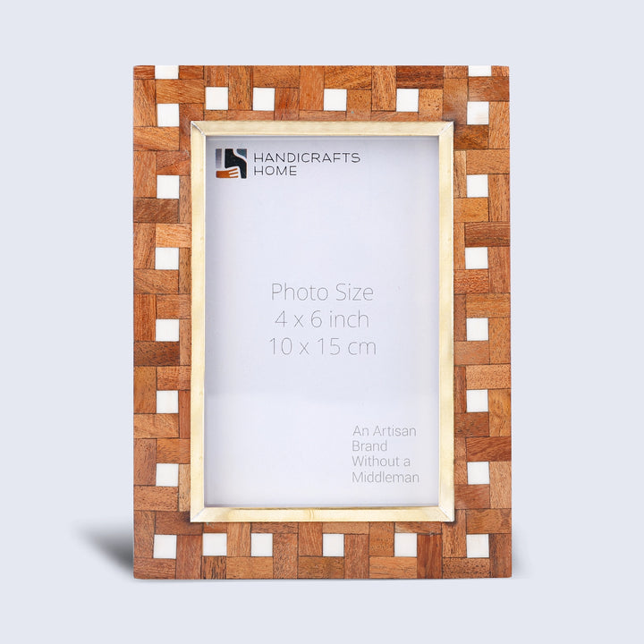 Introducing the Halo Parquet Collection, a celebration of natural craftsmanship and refined design. Every Halo Parquet frame is handcrafted one piece at a time by skilled artisans carrying forward three generations of craftsmanship and over two decades of expertise. Individual wood elements are carefully cut, shaped, and arranged by hand to form a distinctive geometric pattern. The natural grain variations, warm tones, and handcrafted detailing give each piece its own unique character and heirloom quality finish.