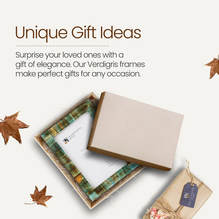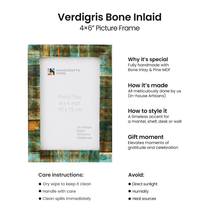 The Verdigris Collection brings heritage craftsmanship and vintage elegance into your home. Each bone inlay picture frame is handcrafted one piece at a time. Skilled artisans carefully cut and arrange individual bone chips into a richly textured mosaic, set into a durable pine MDF base. The layered blue-green tones create a refined yet rustic aesthetic that enhances vintage decor, farmhouse decor, cottage core decor, boho home decor, and modern farmhouse interiors. Designed for both tabletop and wall display, the Verdigris frame works beautifully in kitchens, bedrooms, offices, living rooms, and gallery wall arrangements.