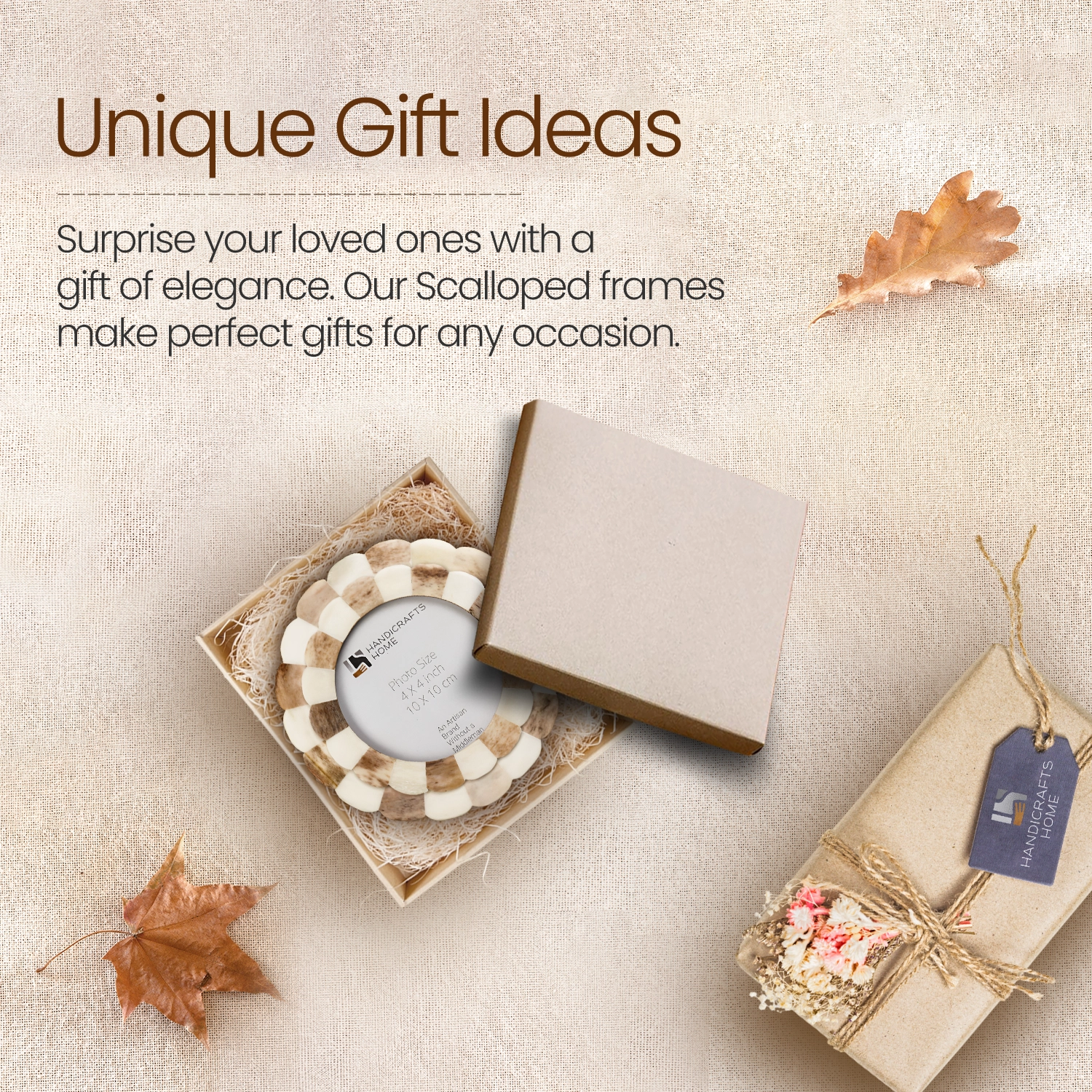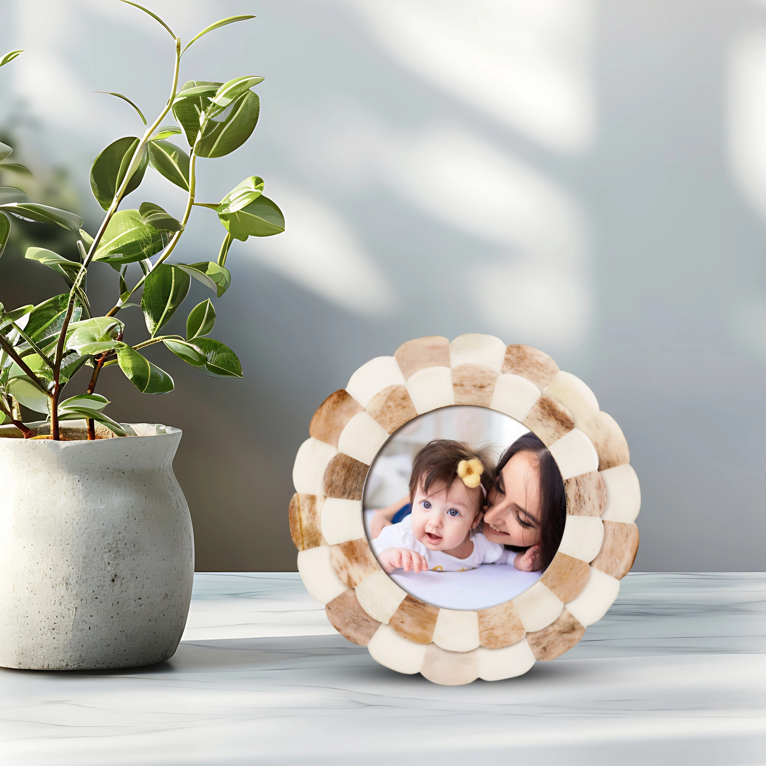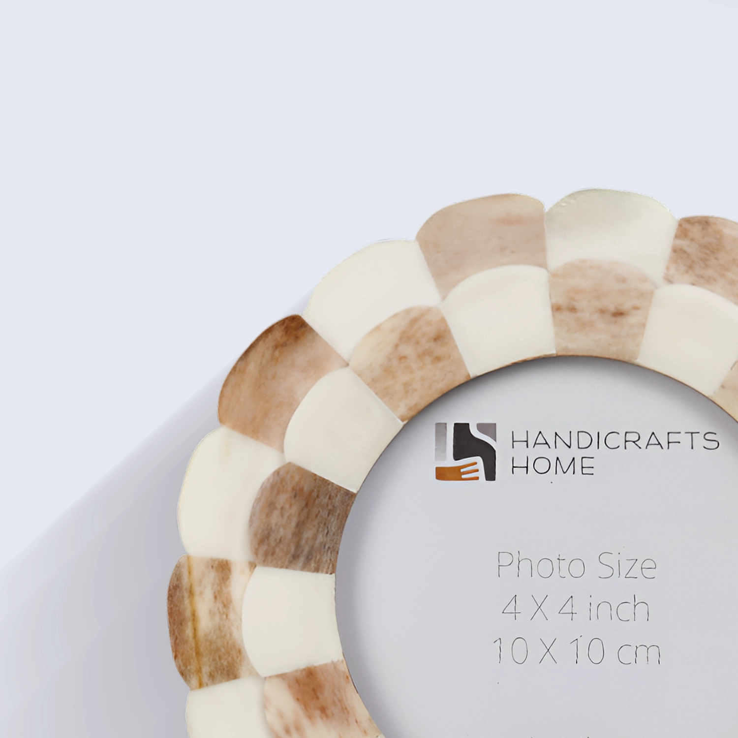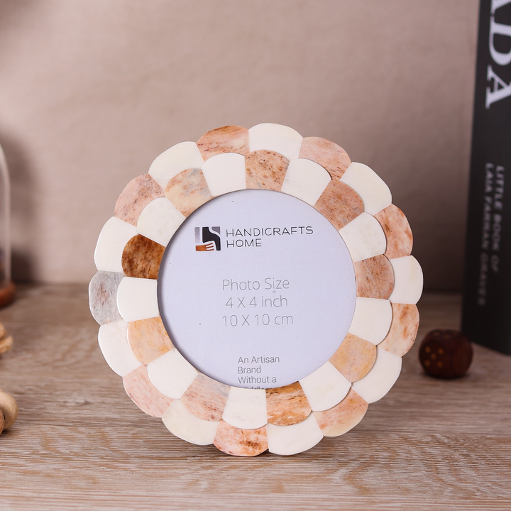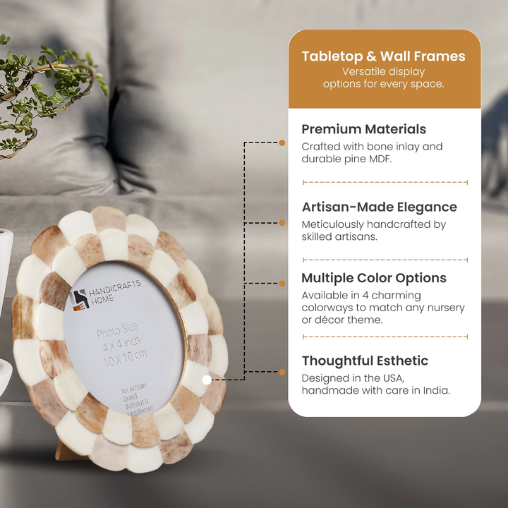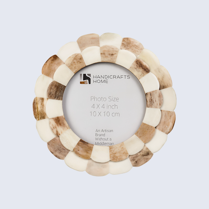 Round Baby Picture Frames Scalloped Pattern Bone Inlay 4x4 Inch, Brown