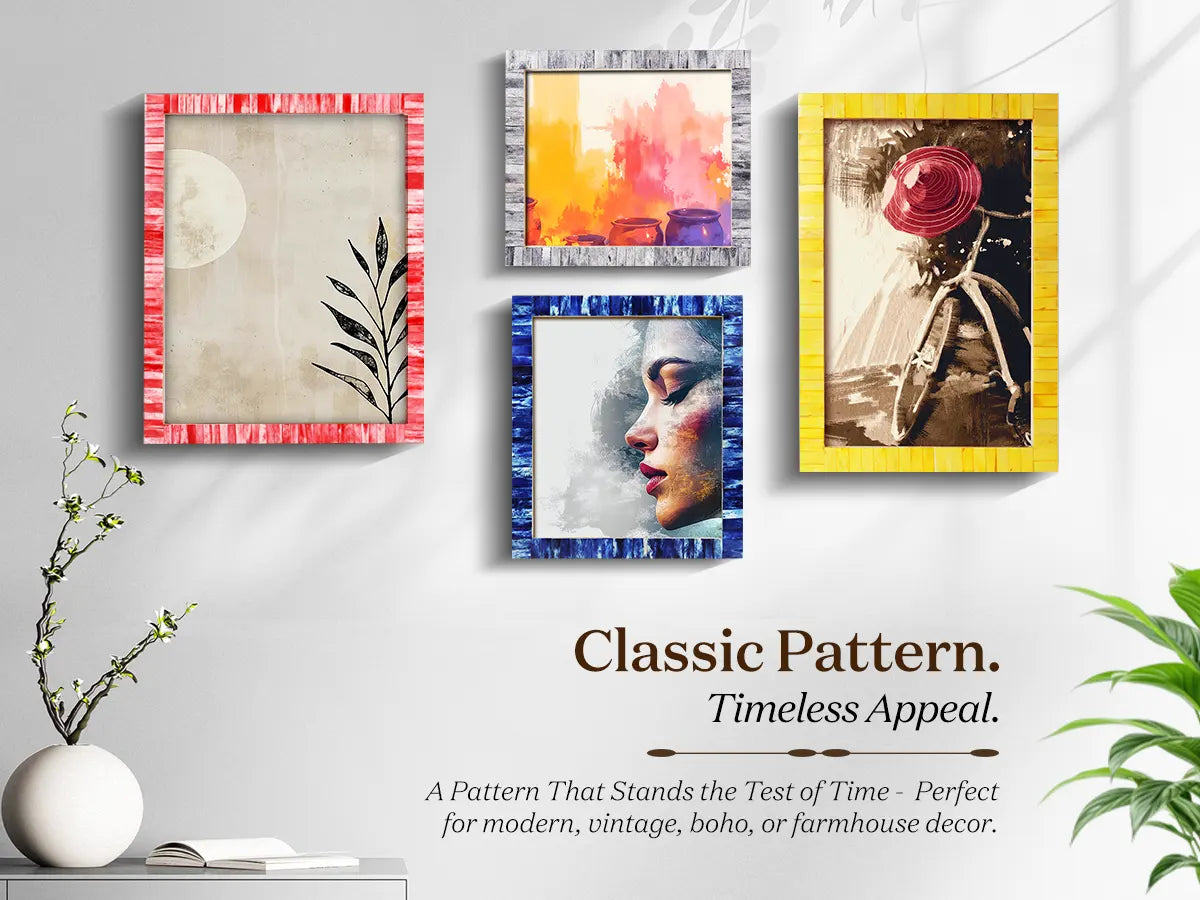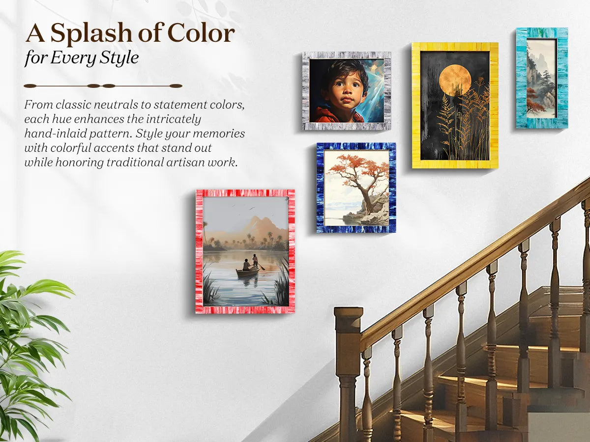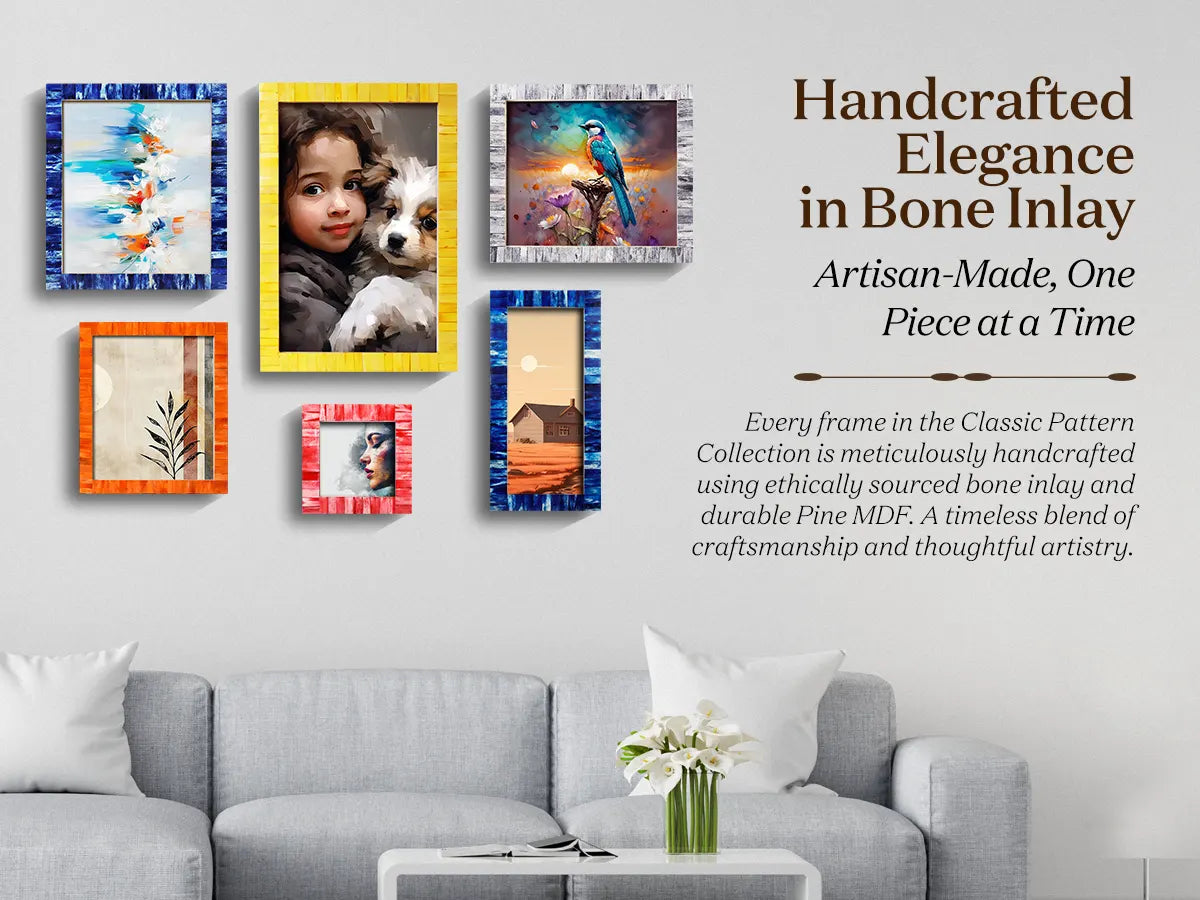 Each frame is individually handmade by skilled artisans using traditional bone inlay techniques. Slight variations in color, texture, and pattern make every piece one-of-a-kind.