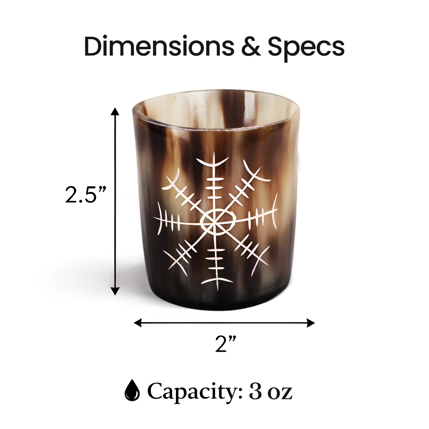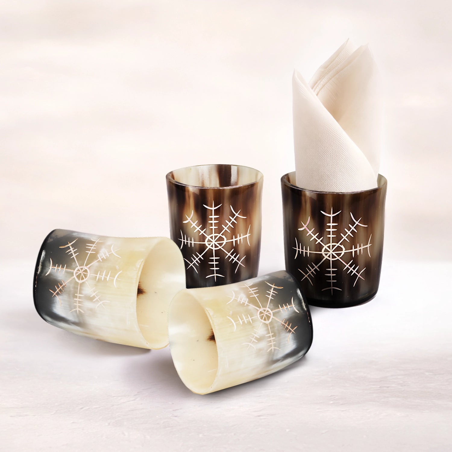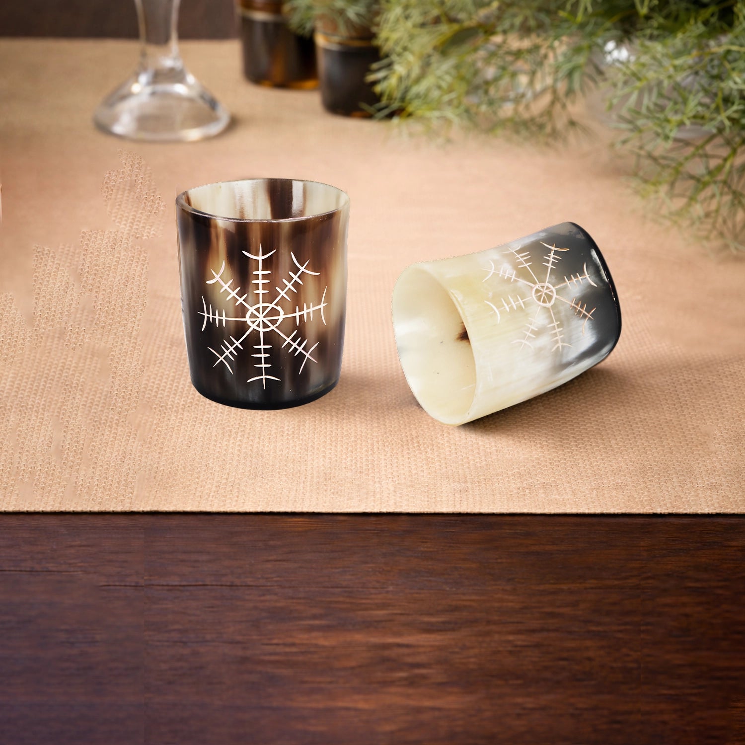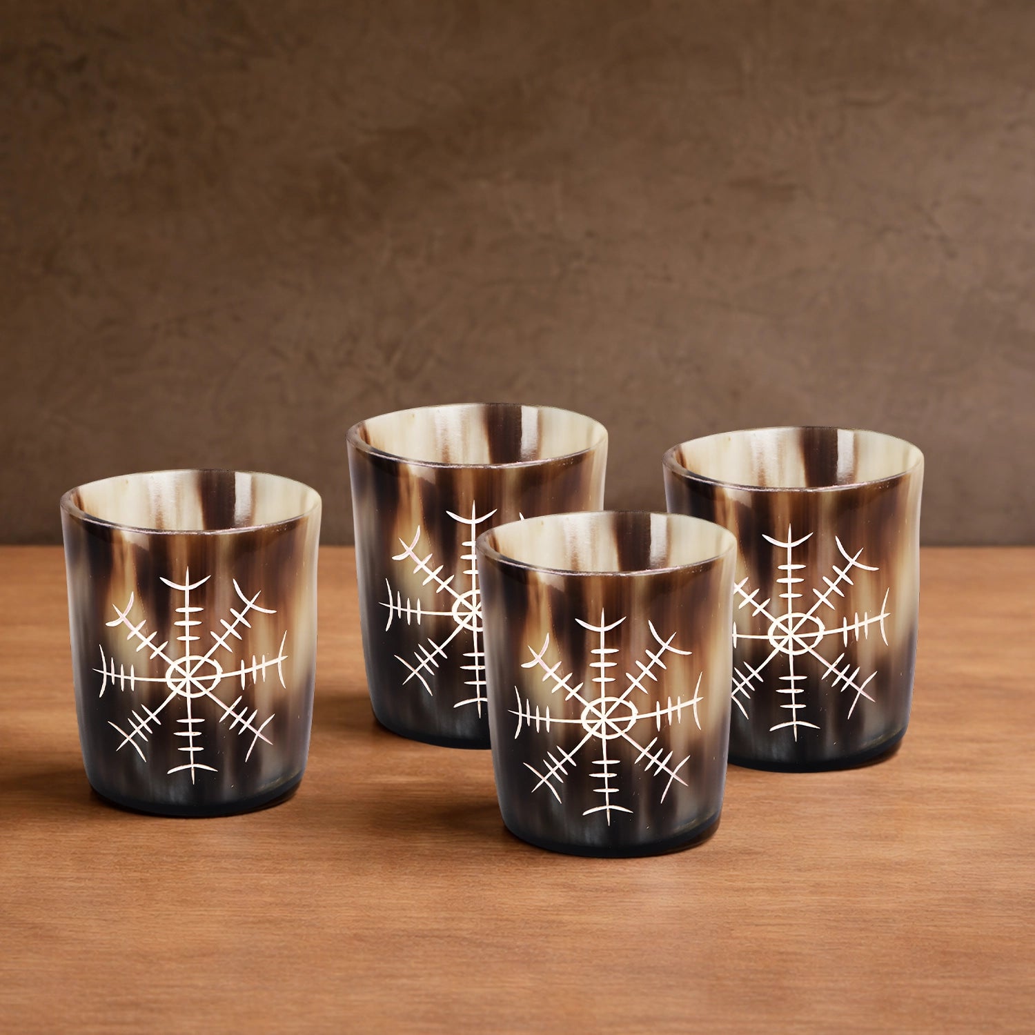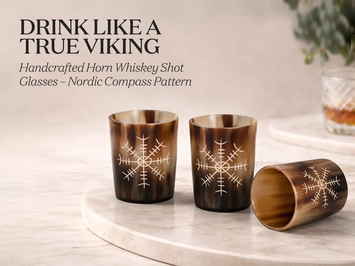 Whiskey Shot Cups Set Nordic Compass Pattern Real Ox Horn 6.5 oz, Pack 4, 8 & 12