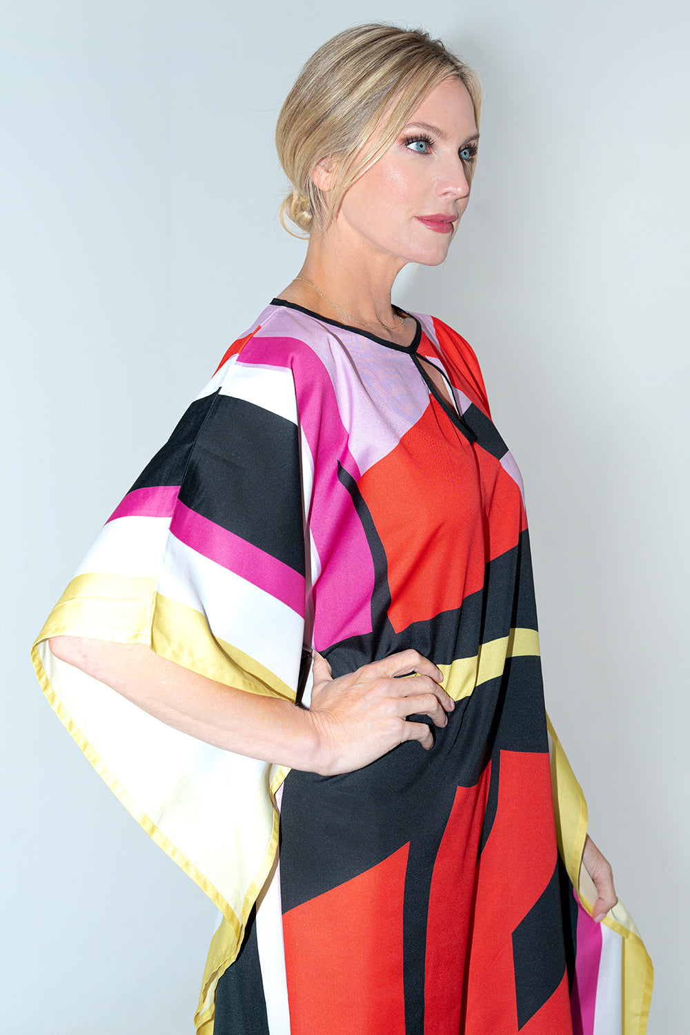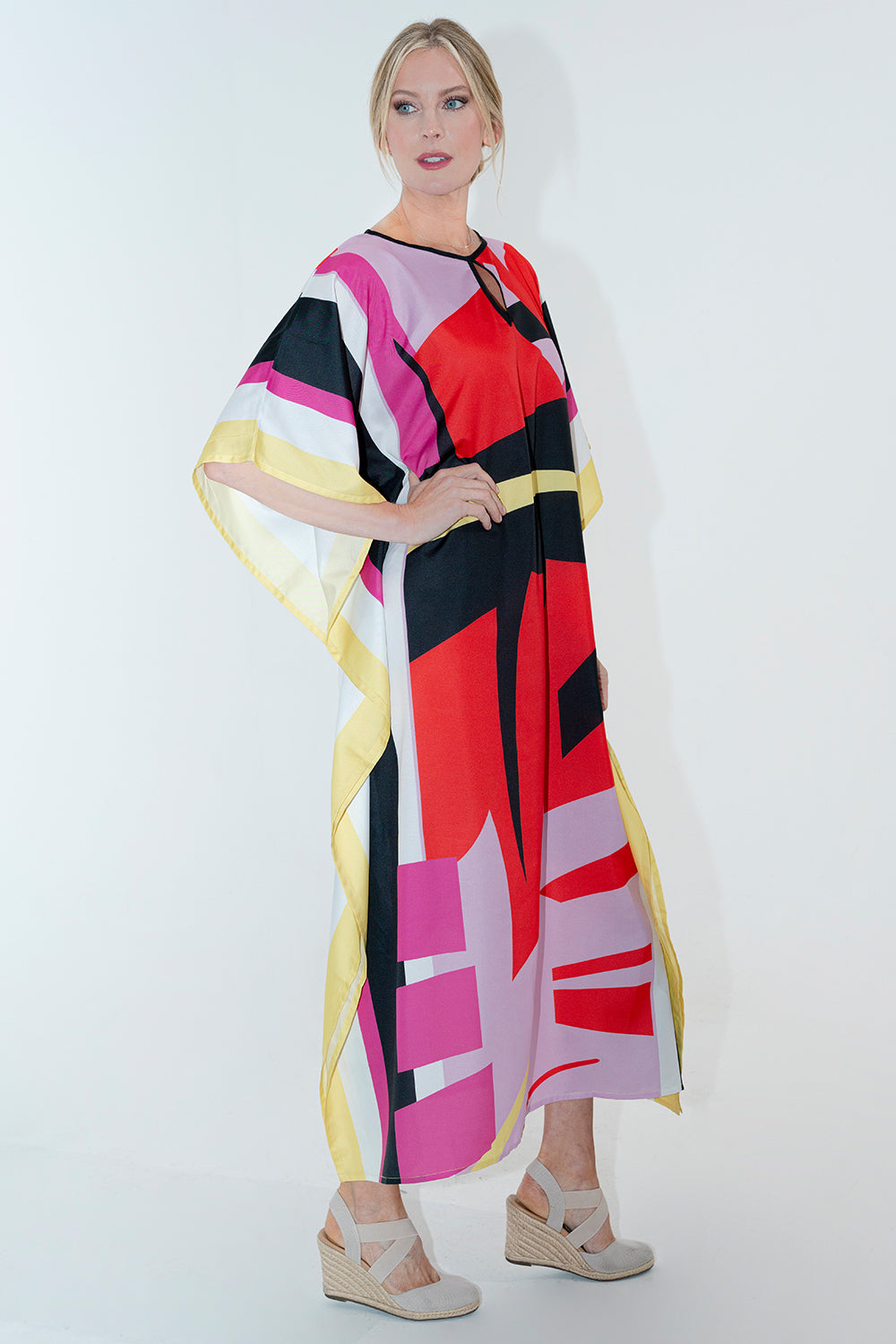 Abstract Print Polyester Kaftan Dress with Pockets & Side Slits