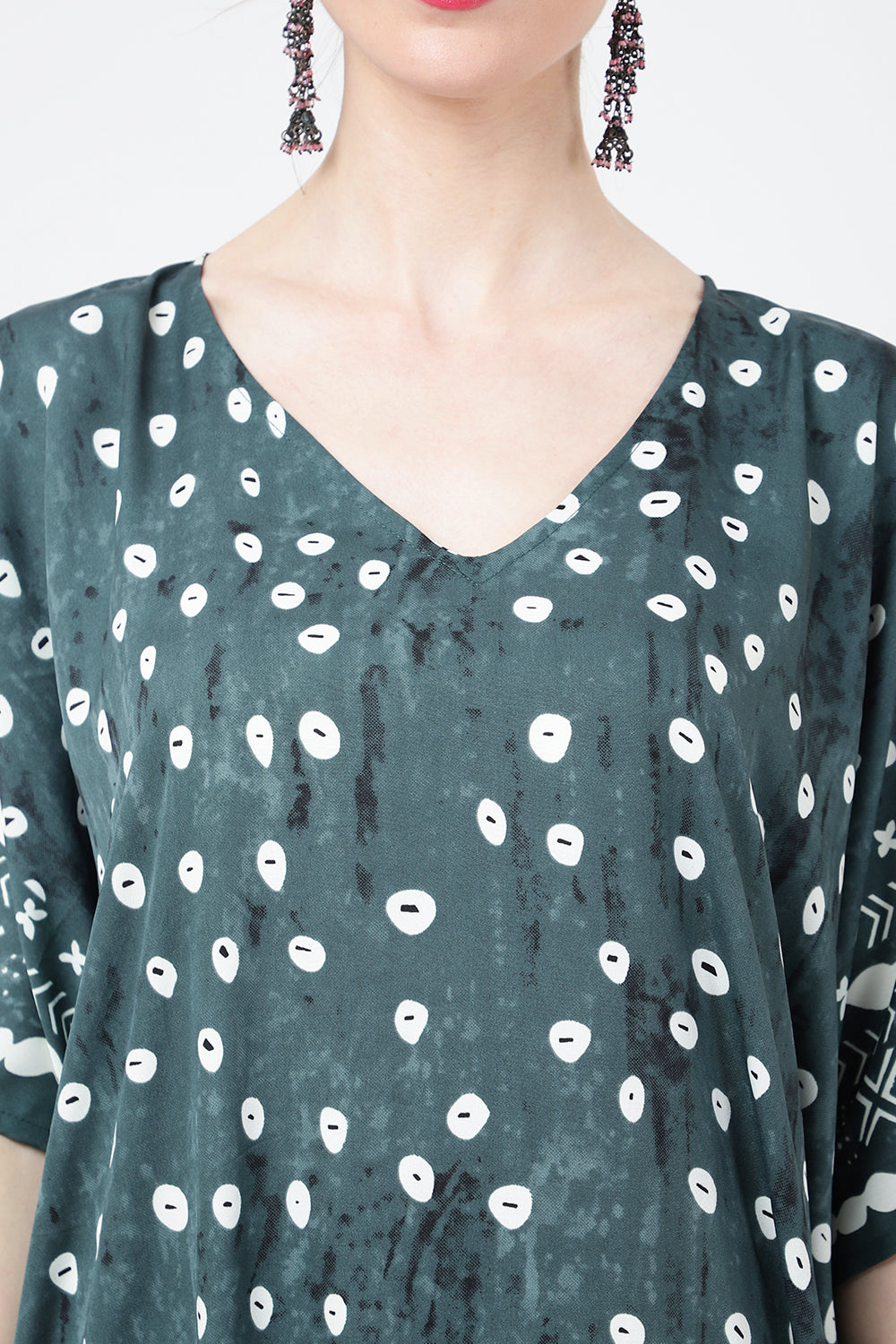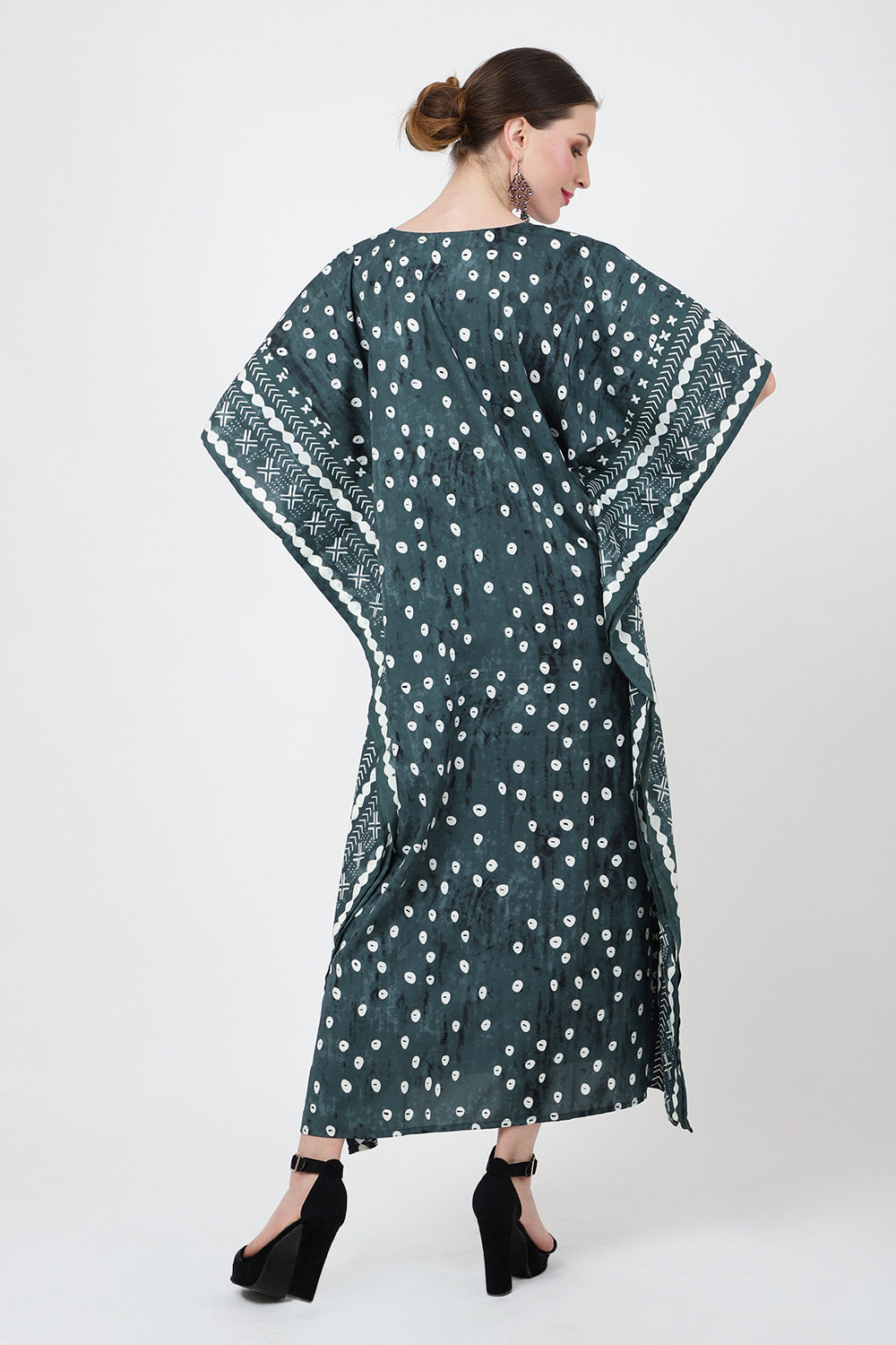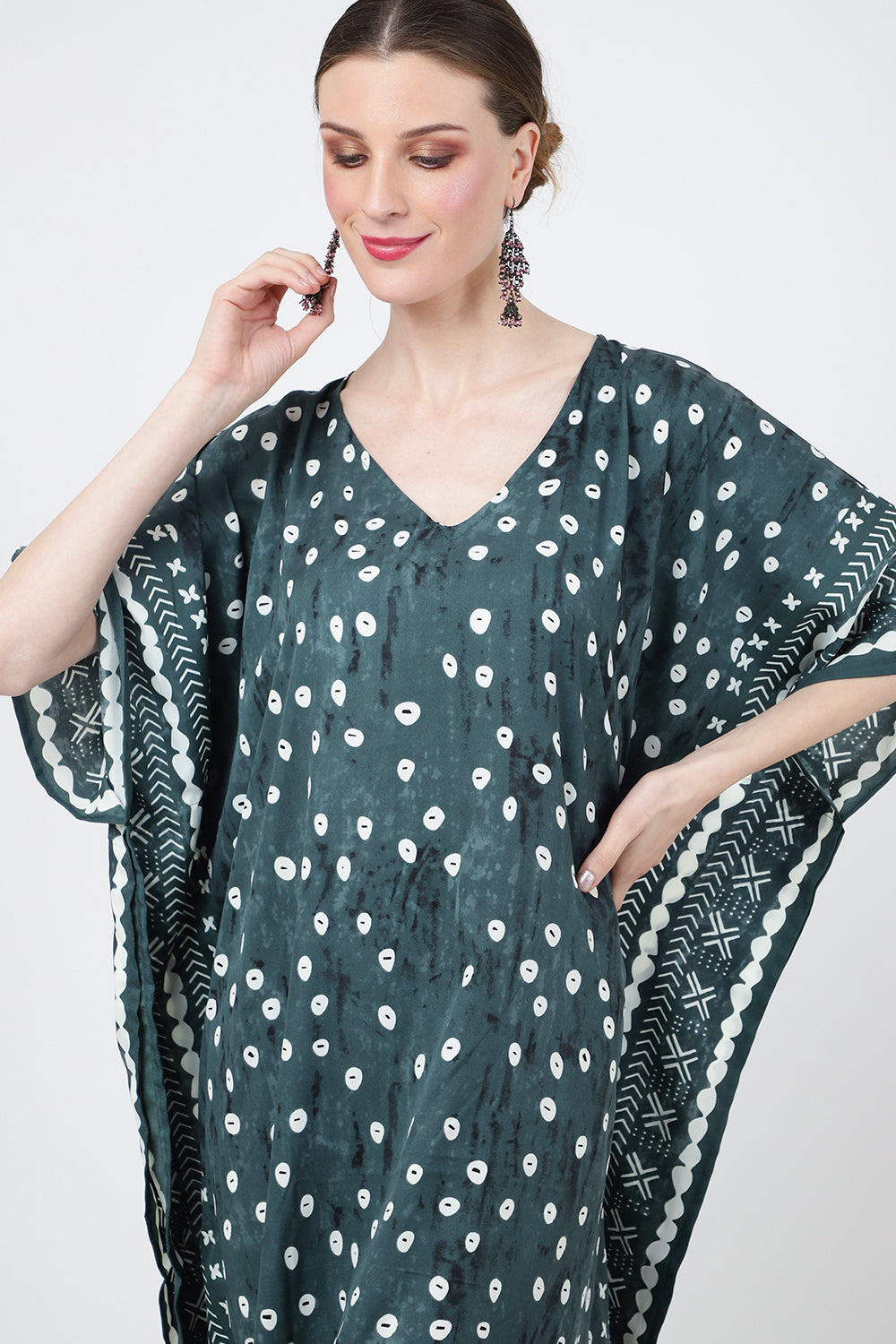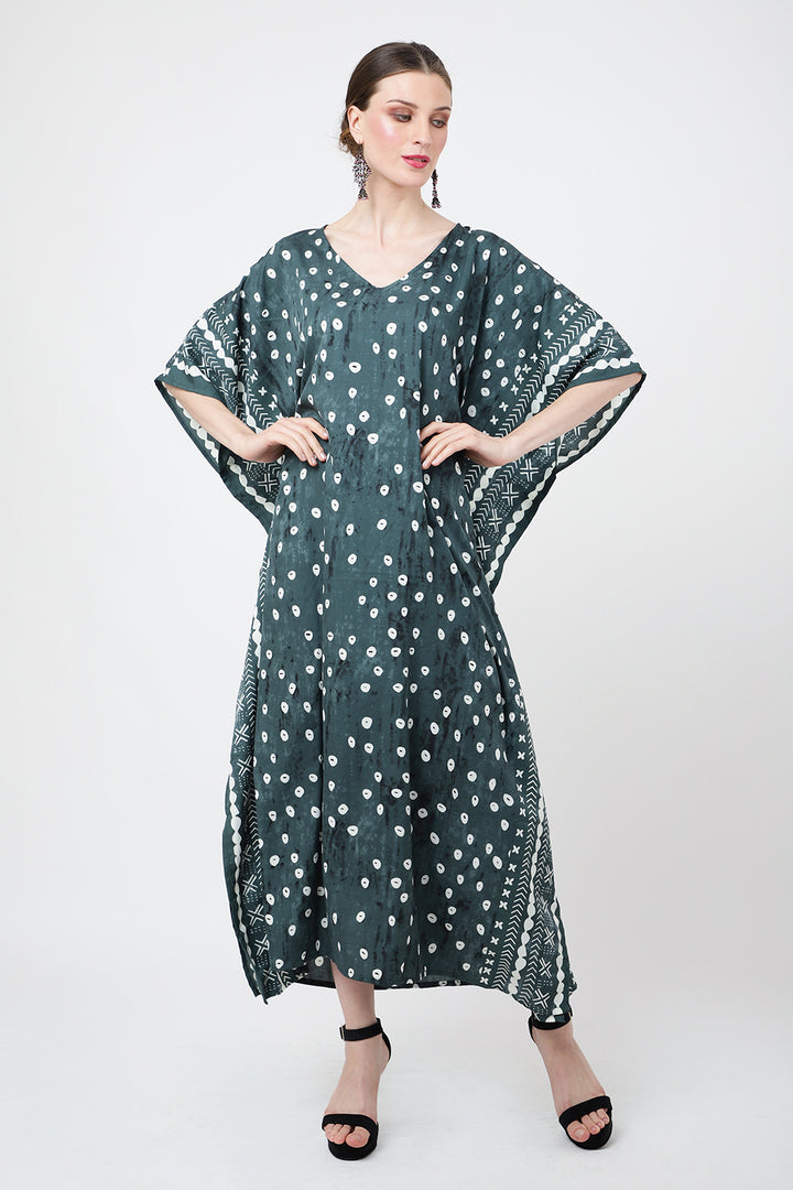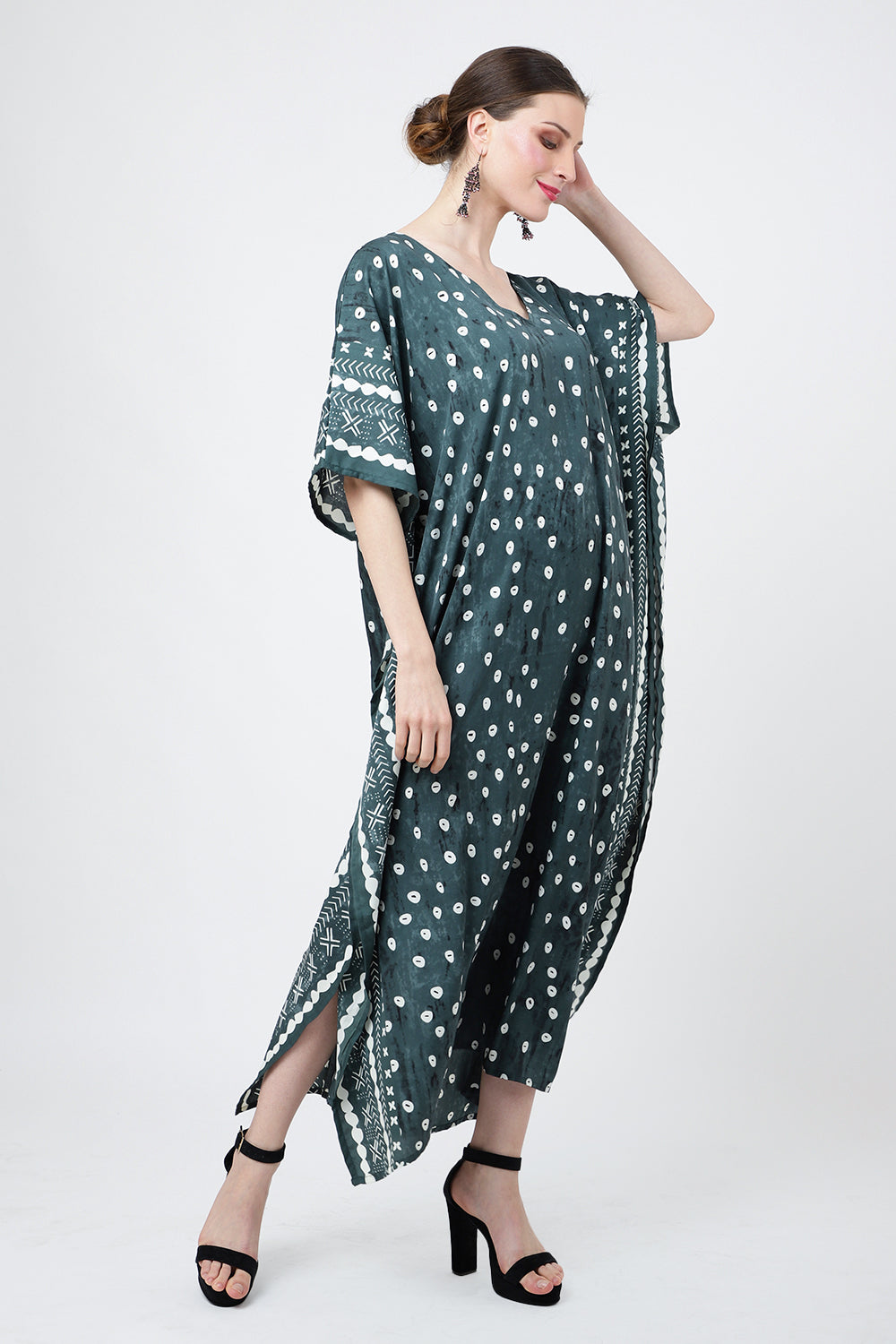 Ethnic Dot Print Polyester Kaftan Dress with Pockets & Side Slits
