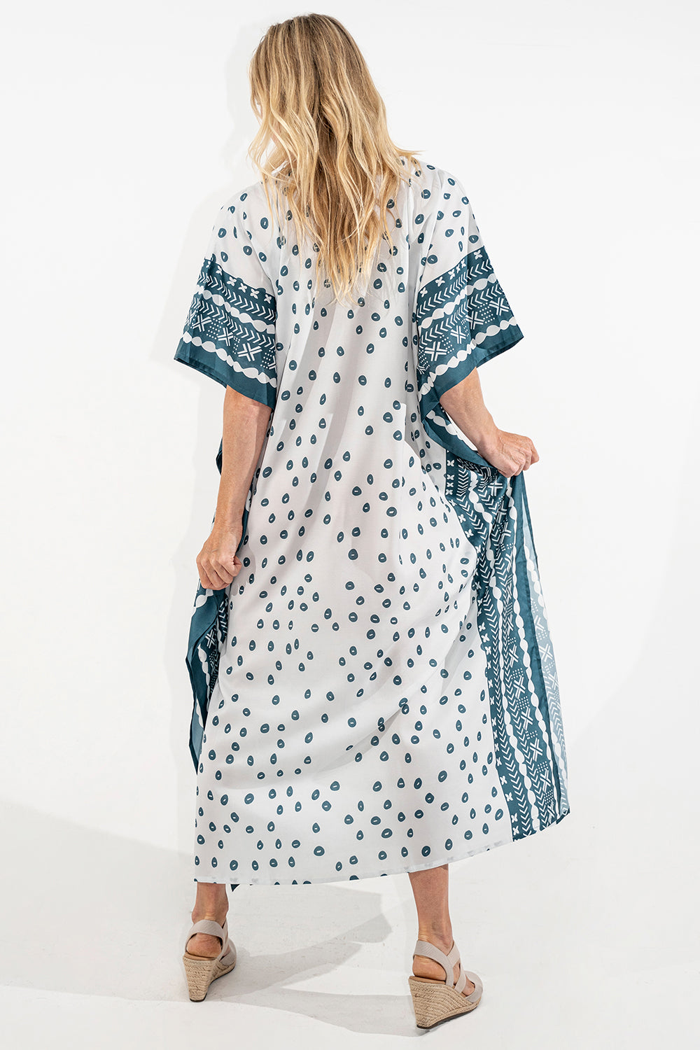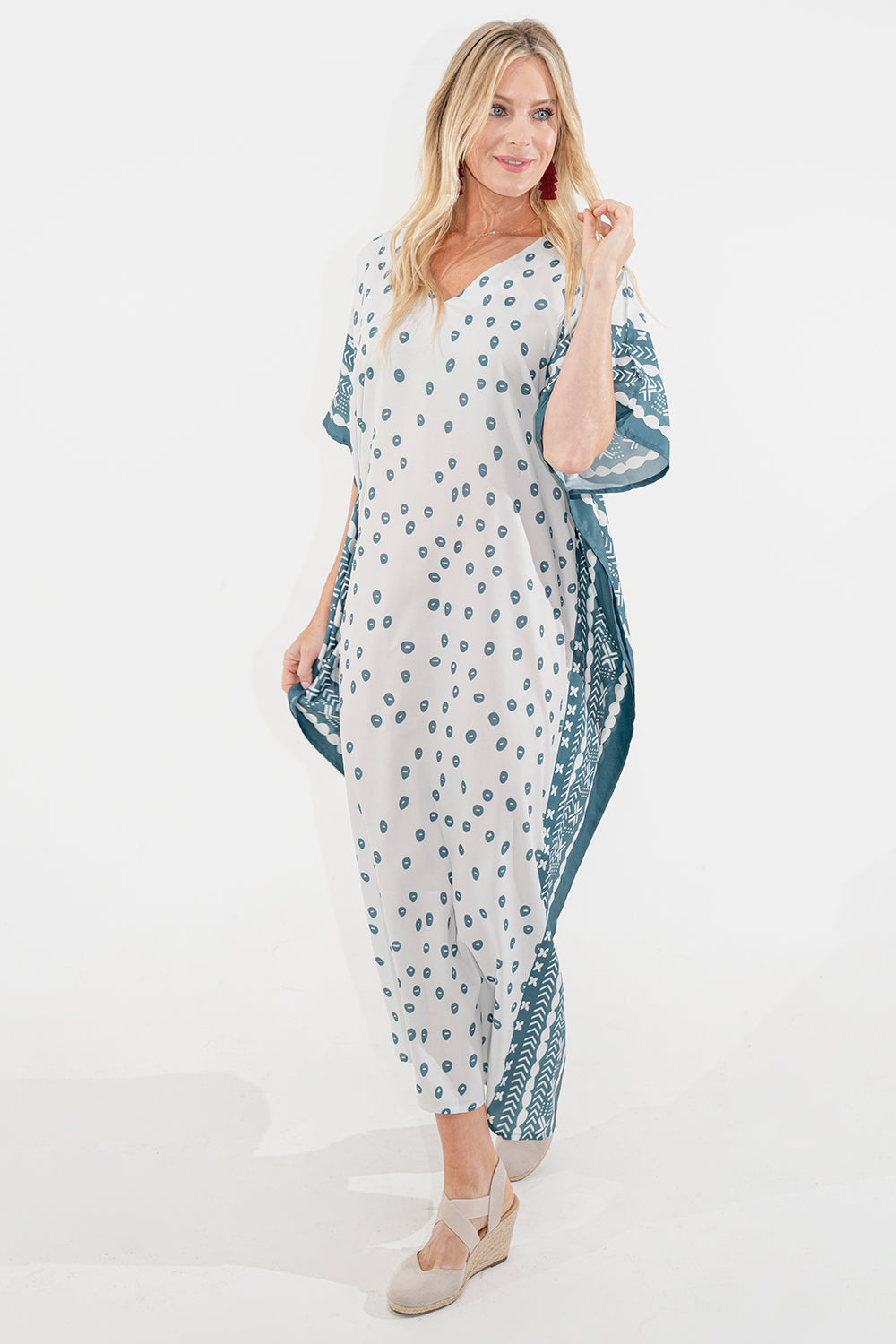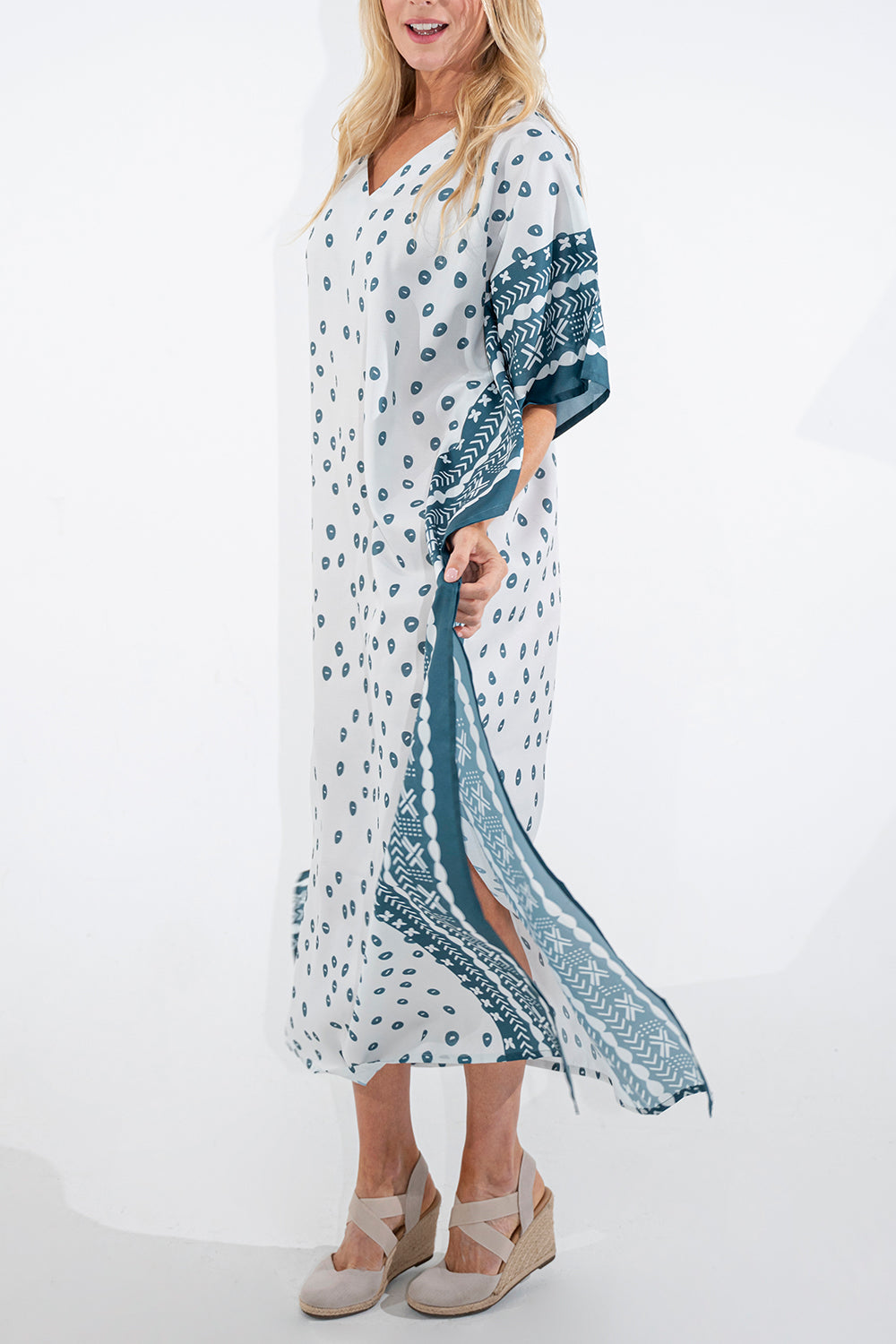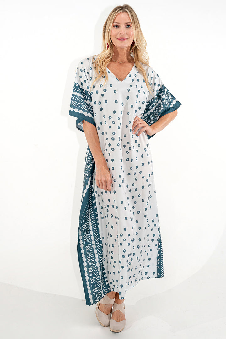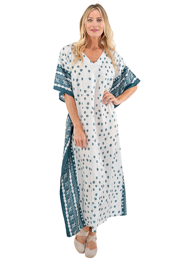 Ethnic Dot Print Polyester Kaftan Dress with Pockets & Side Slits