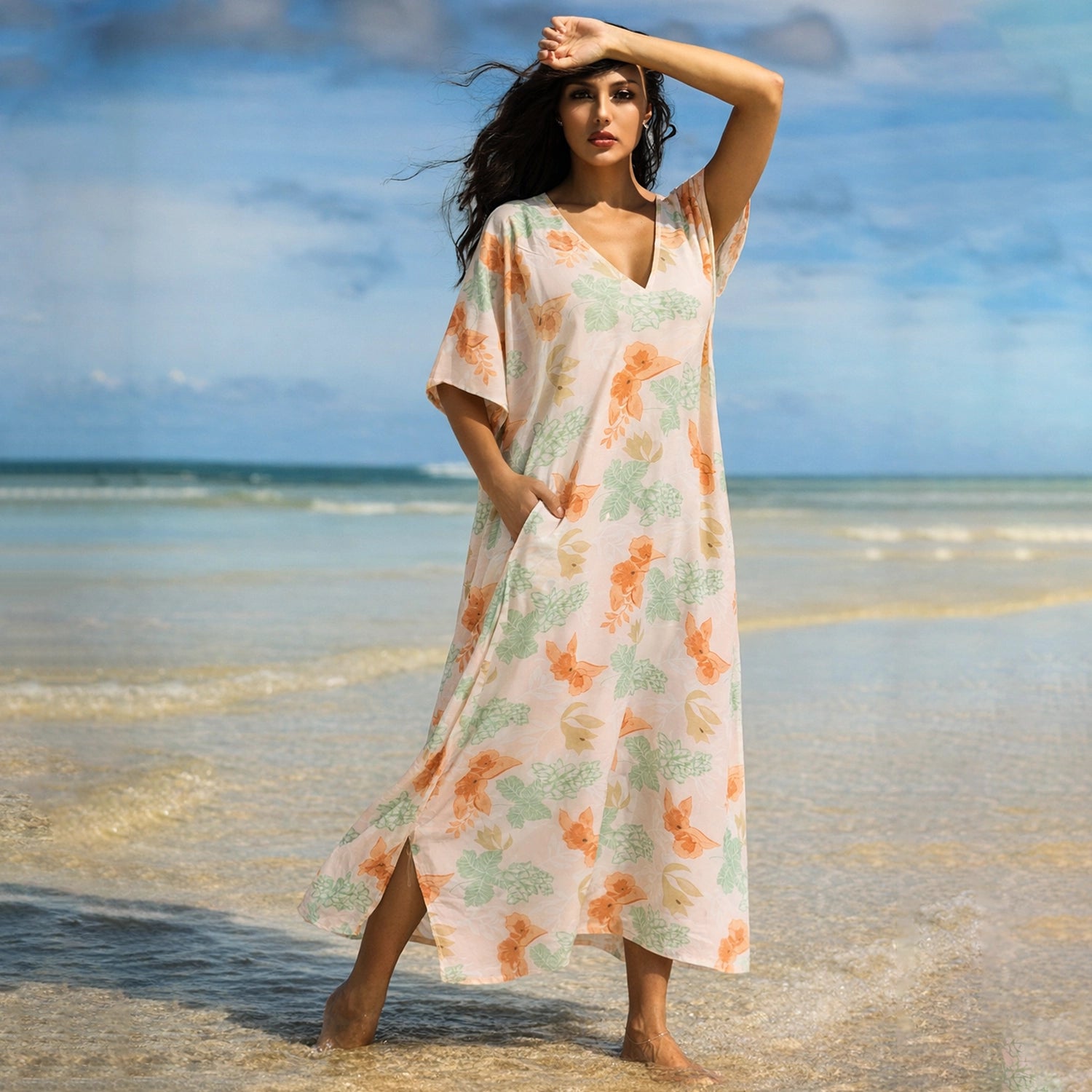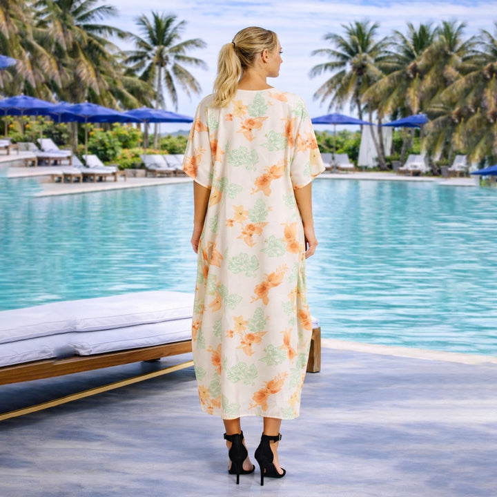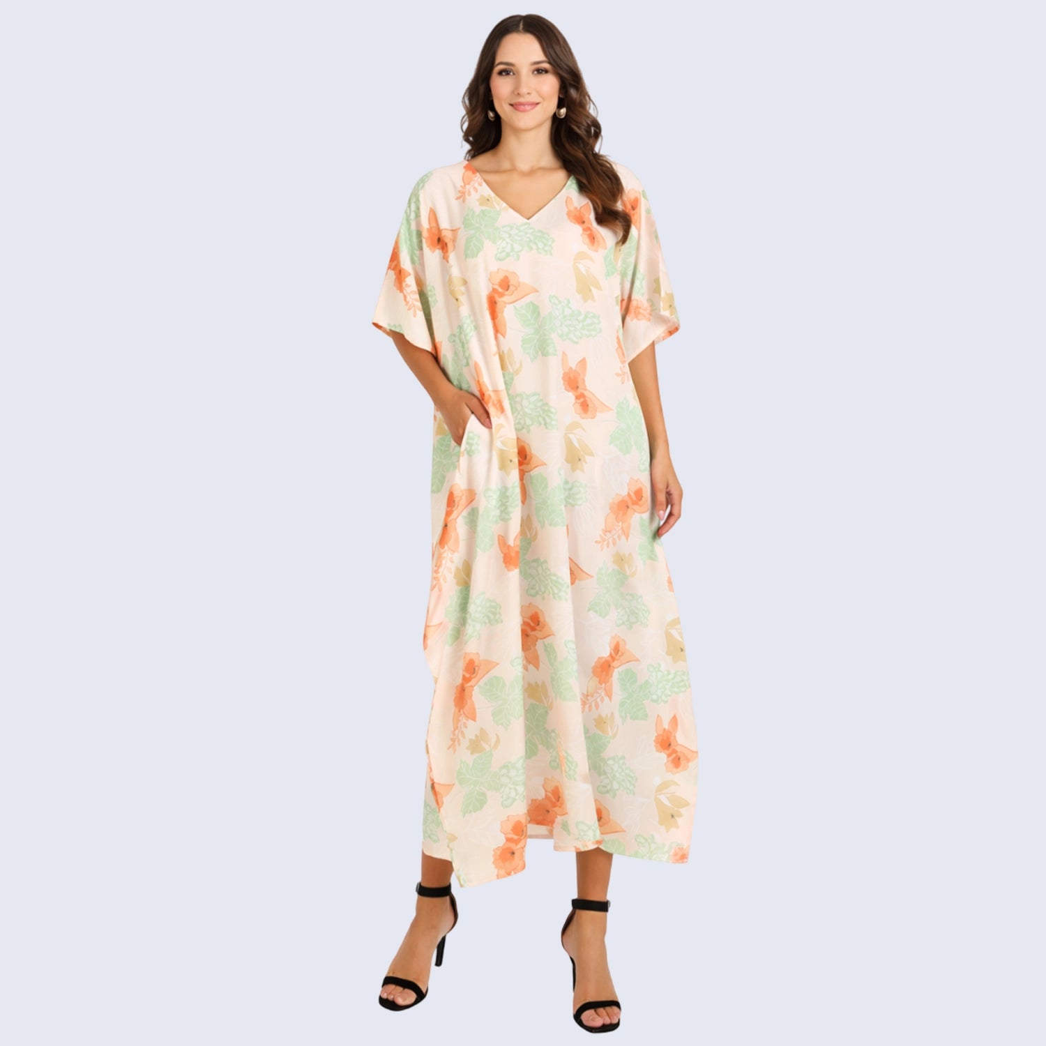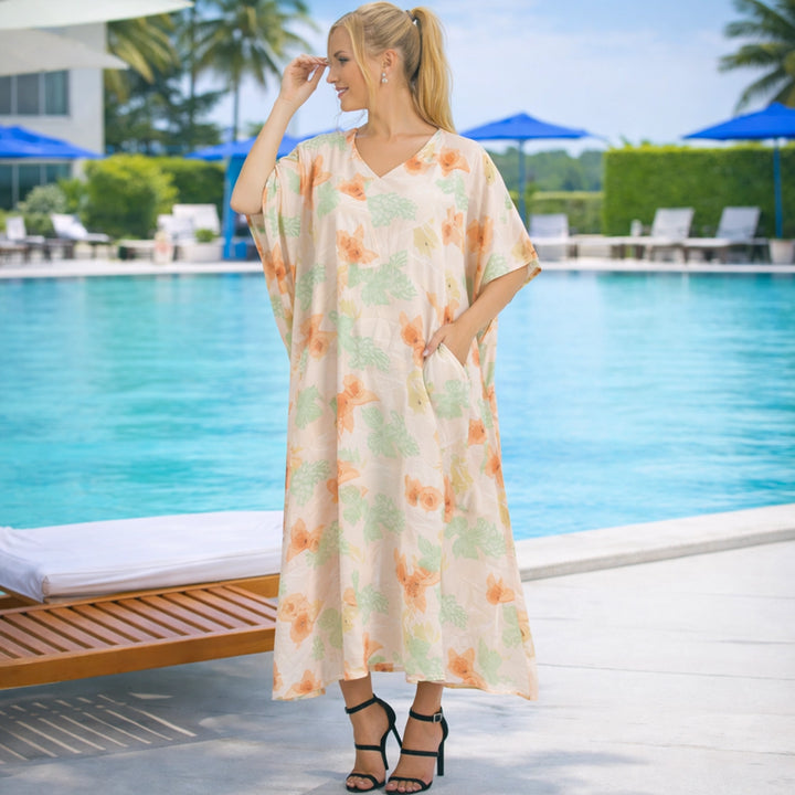 Floral Pastel Polyester Kaftan Dress with V Neck, Pockets & Side Slits