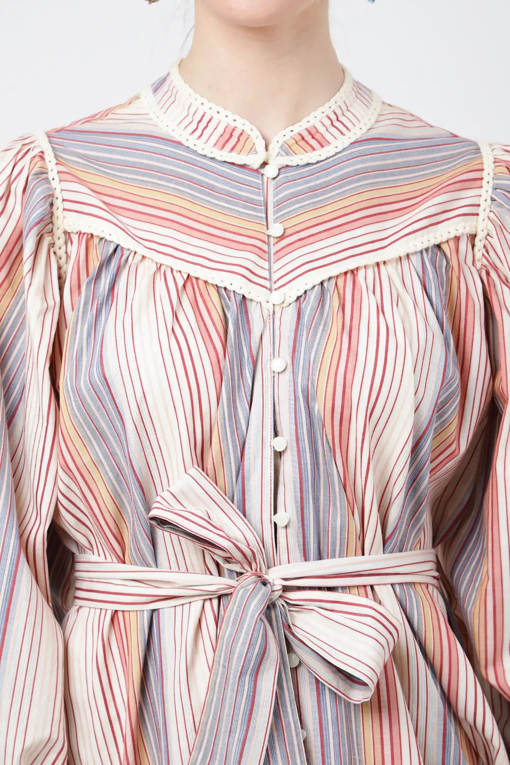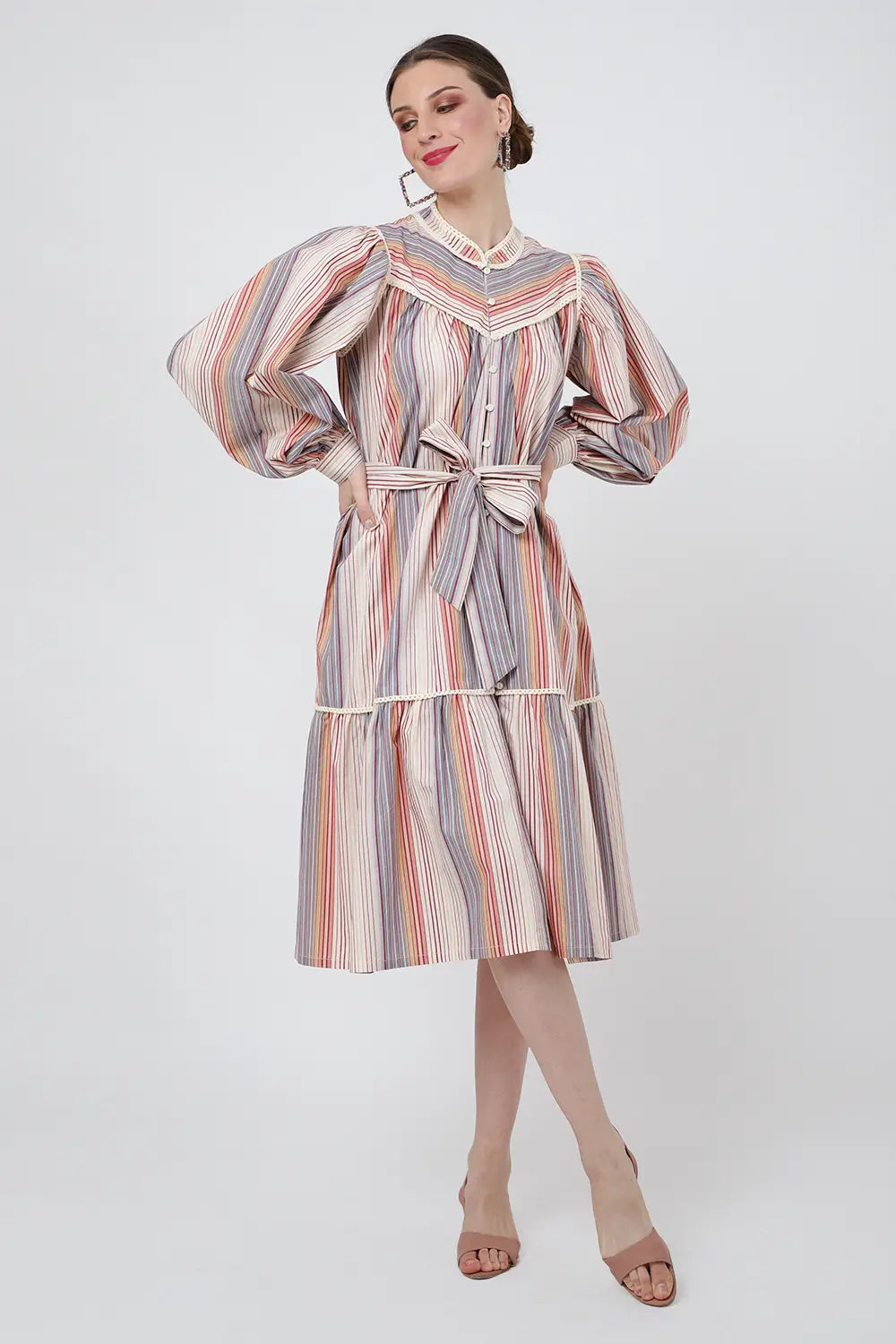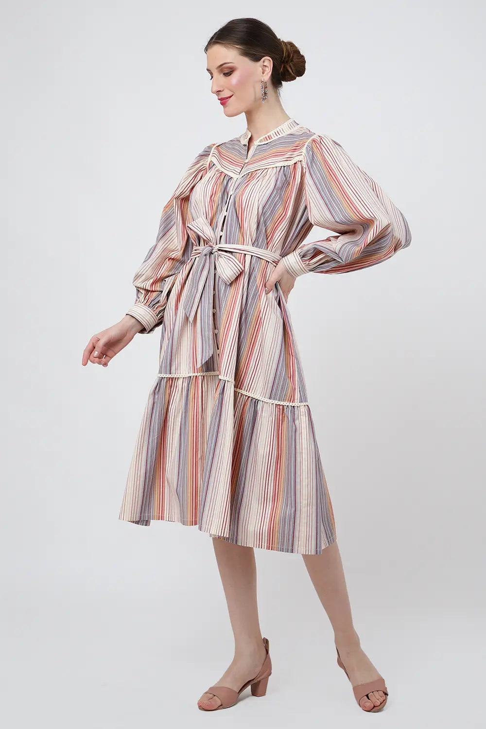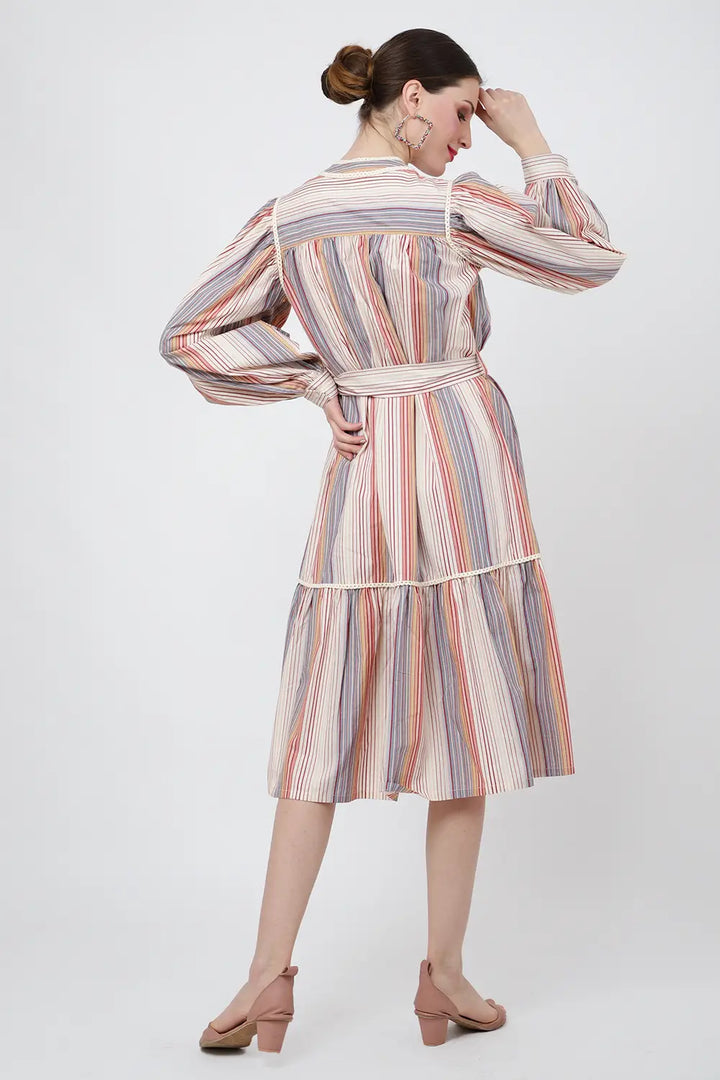 Striped Midi Dress with Lace Inserts & Button Front - Ecru, XS to 3XL