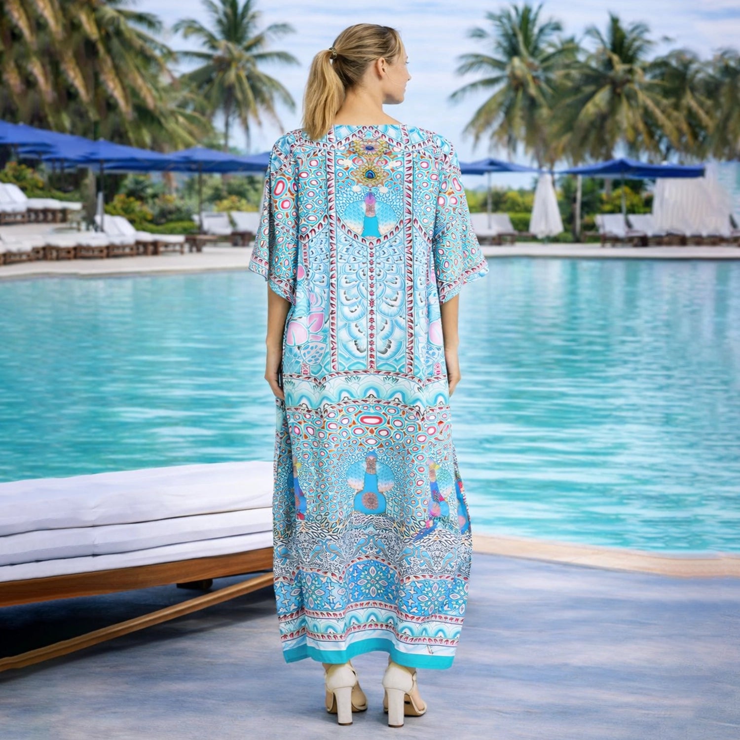 Leafy Peacock Floral Polyester Kaftan Dress with V Neck & Side Slits